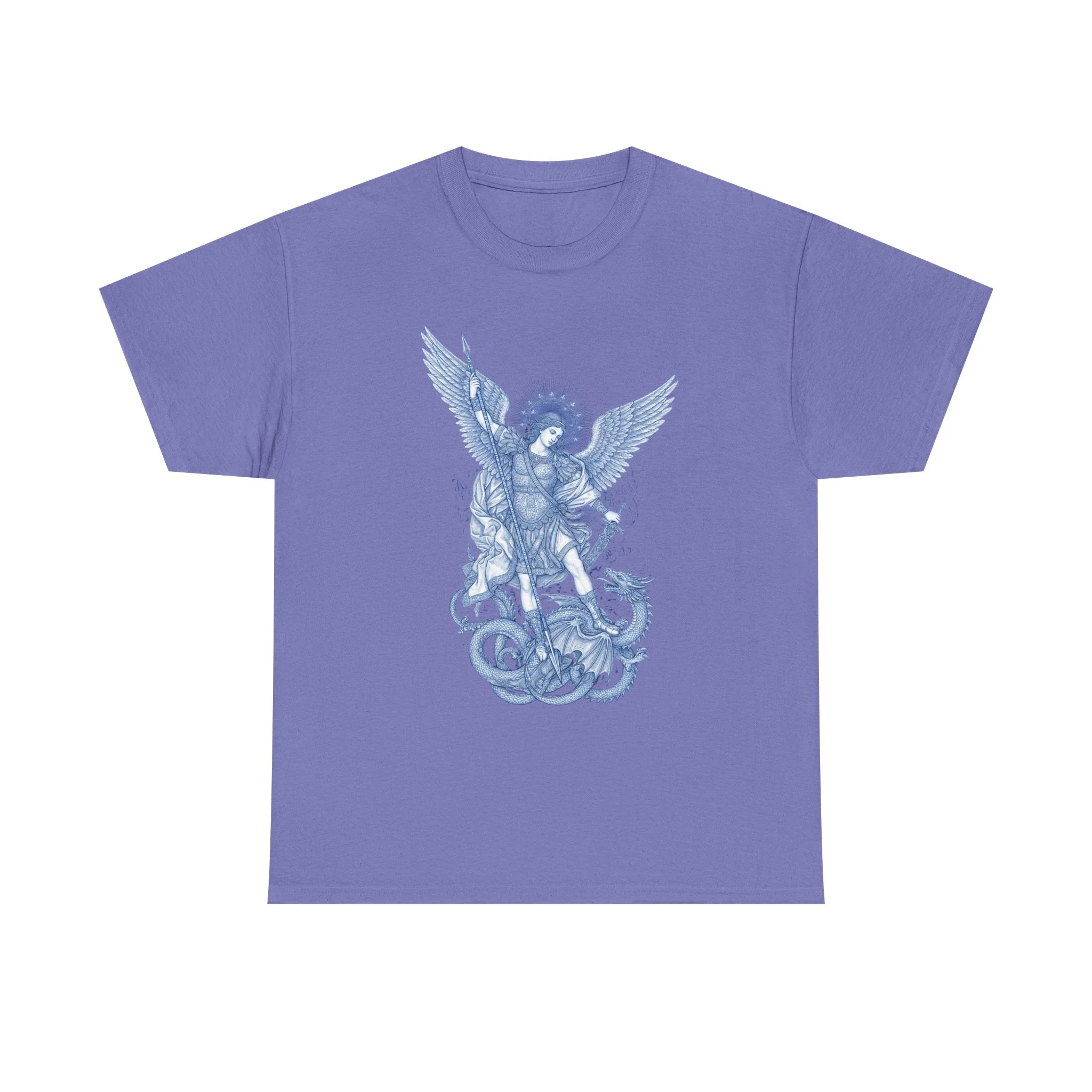 This classic cotton tee carries a quiet, devotional energy — a detailed blue line-art of a winged warrior on the front and a circular emblem with a sword and gentle script on the back.