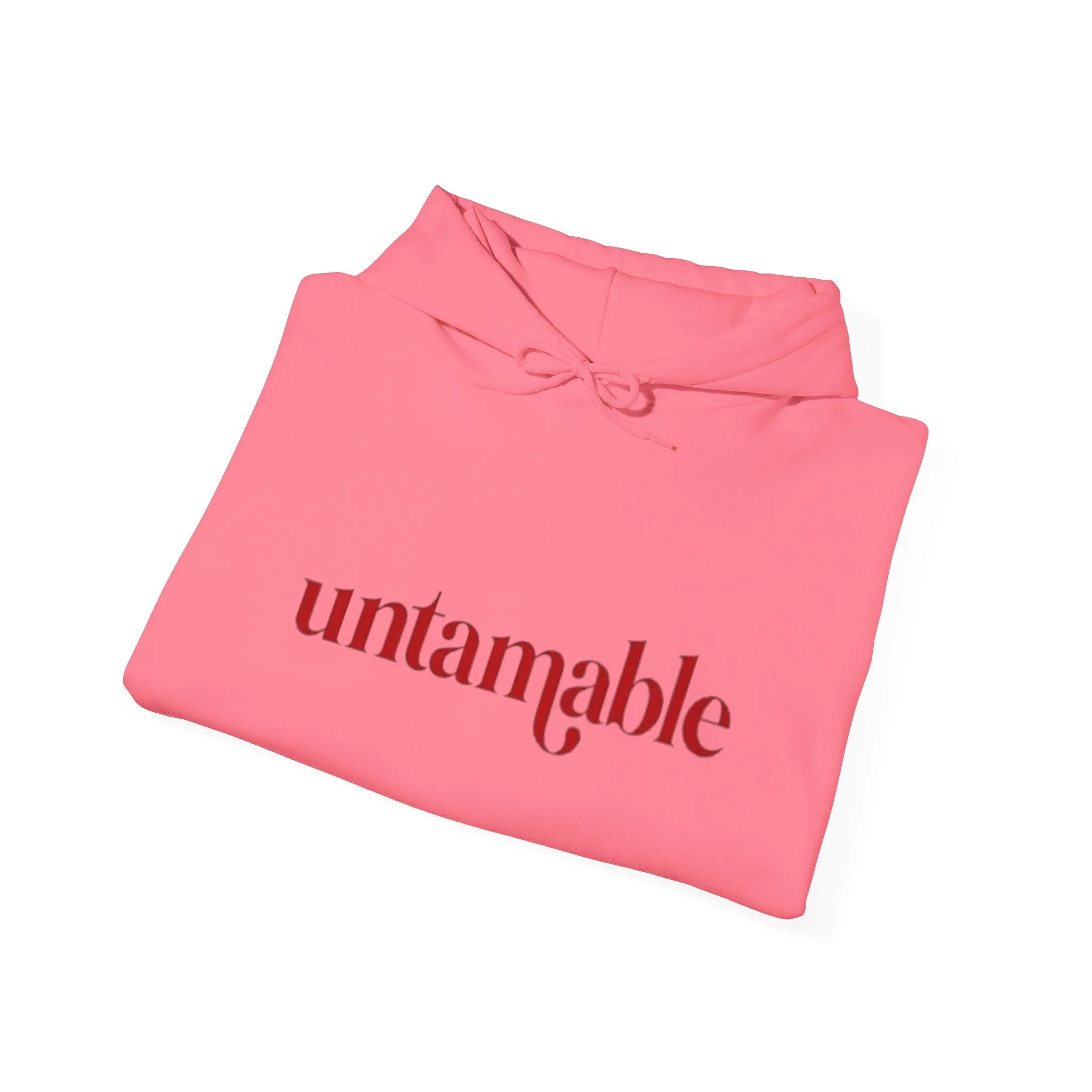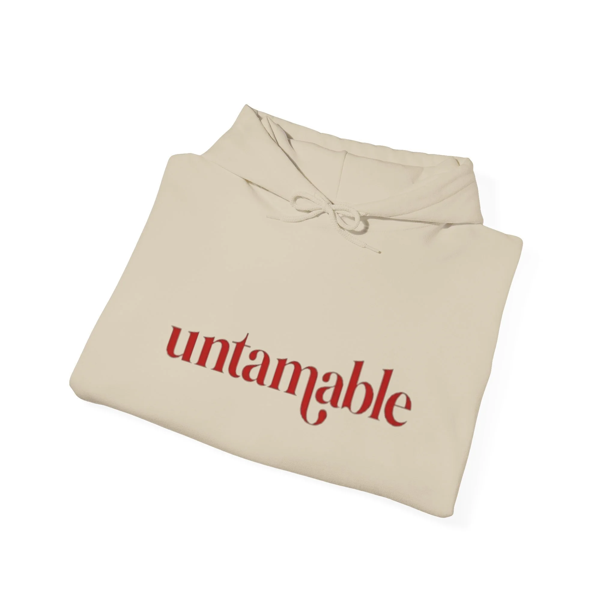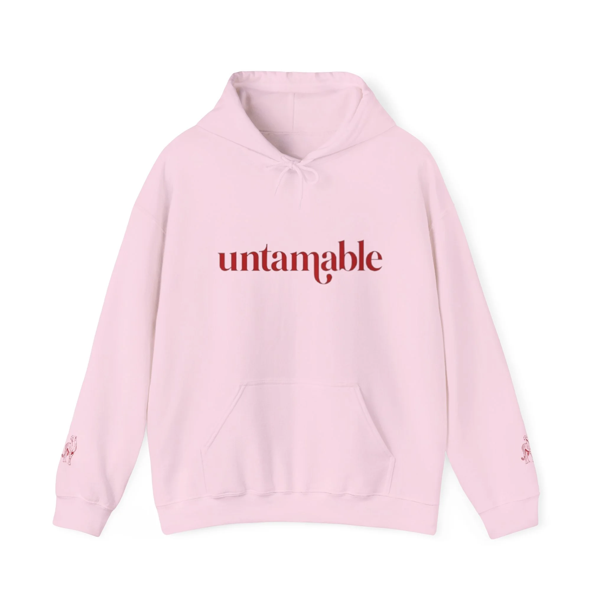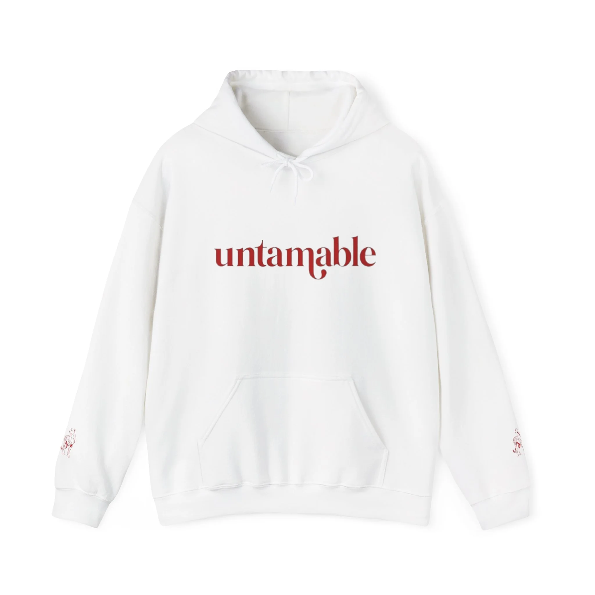 Clean “untamable” script across the chest in matching red lettering, with a roomy kangaroo pocket for everyday practicality.