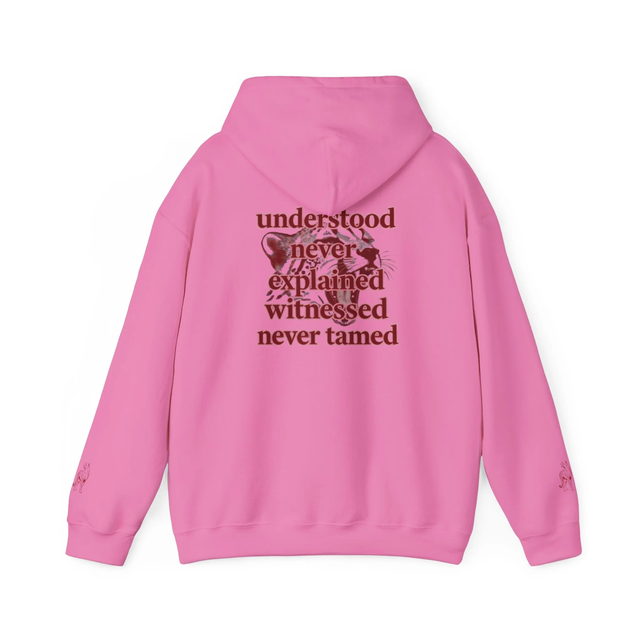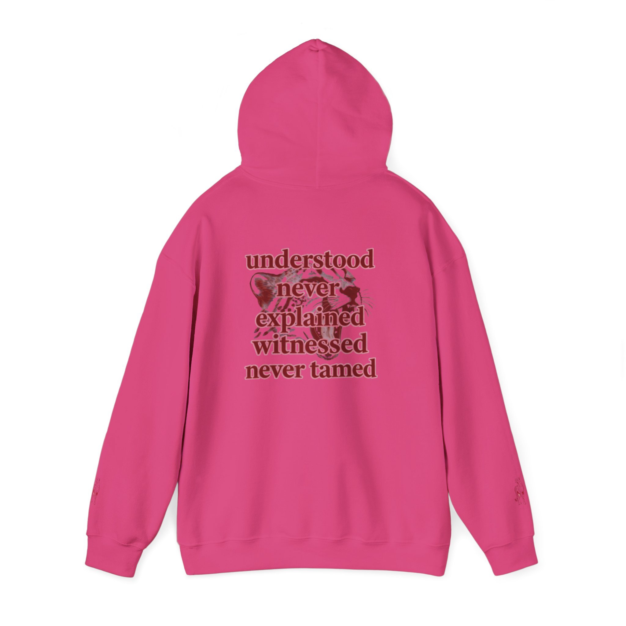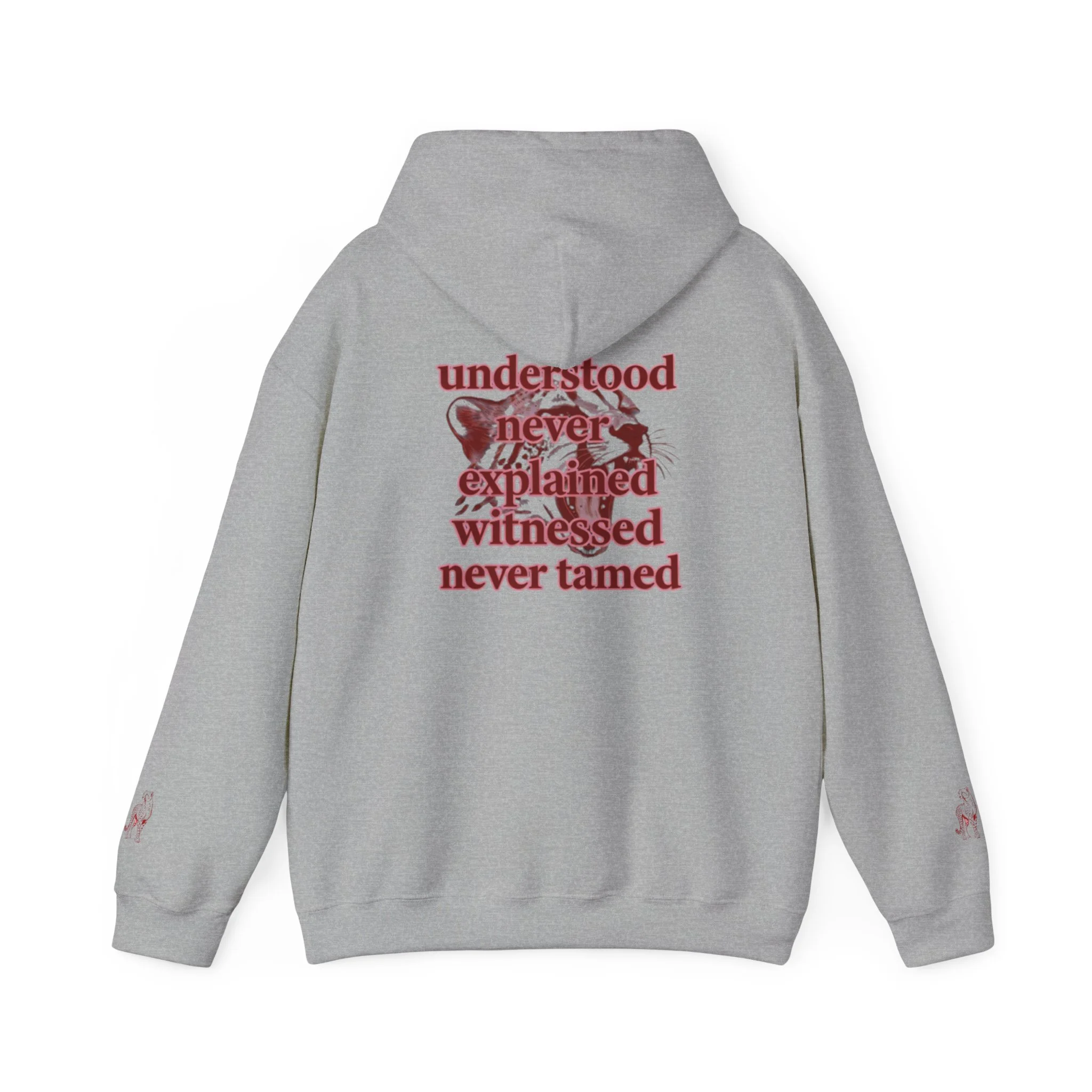 Clean “untamable” script across the chest in matching red lettering, with a roomy kangaroo pocket for everyday practicality.