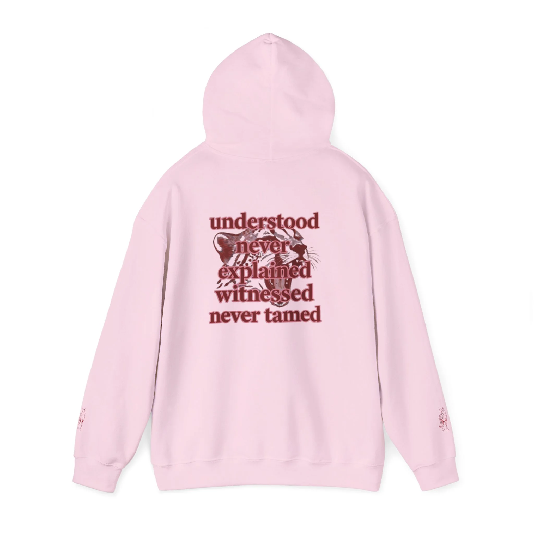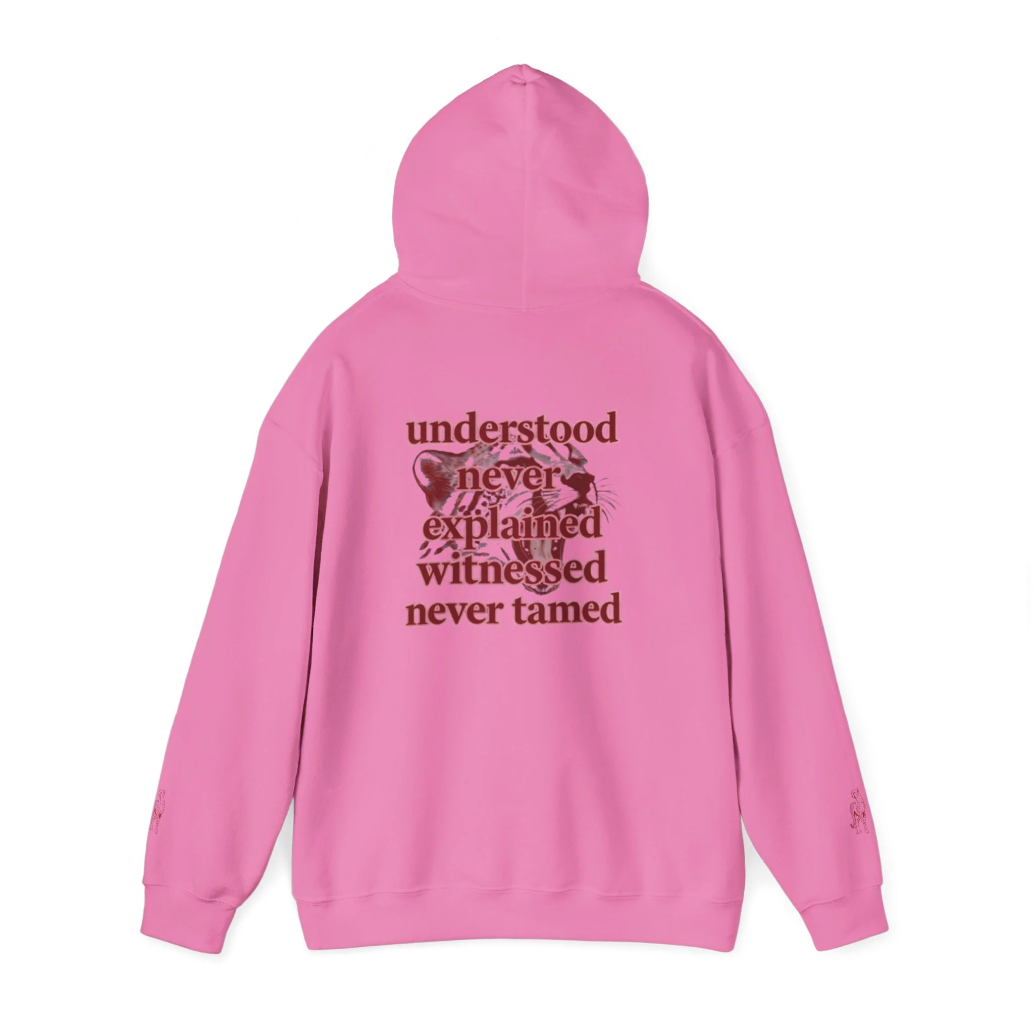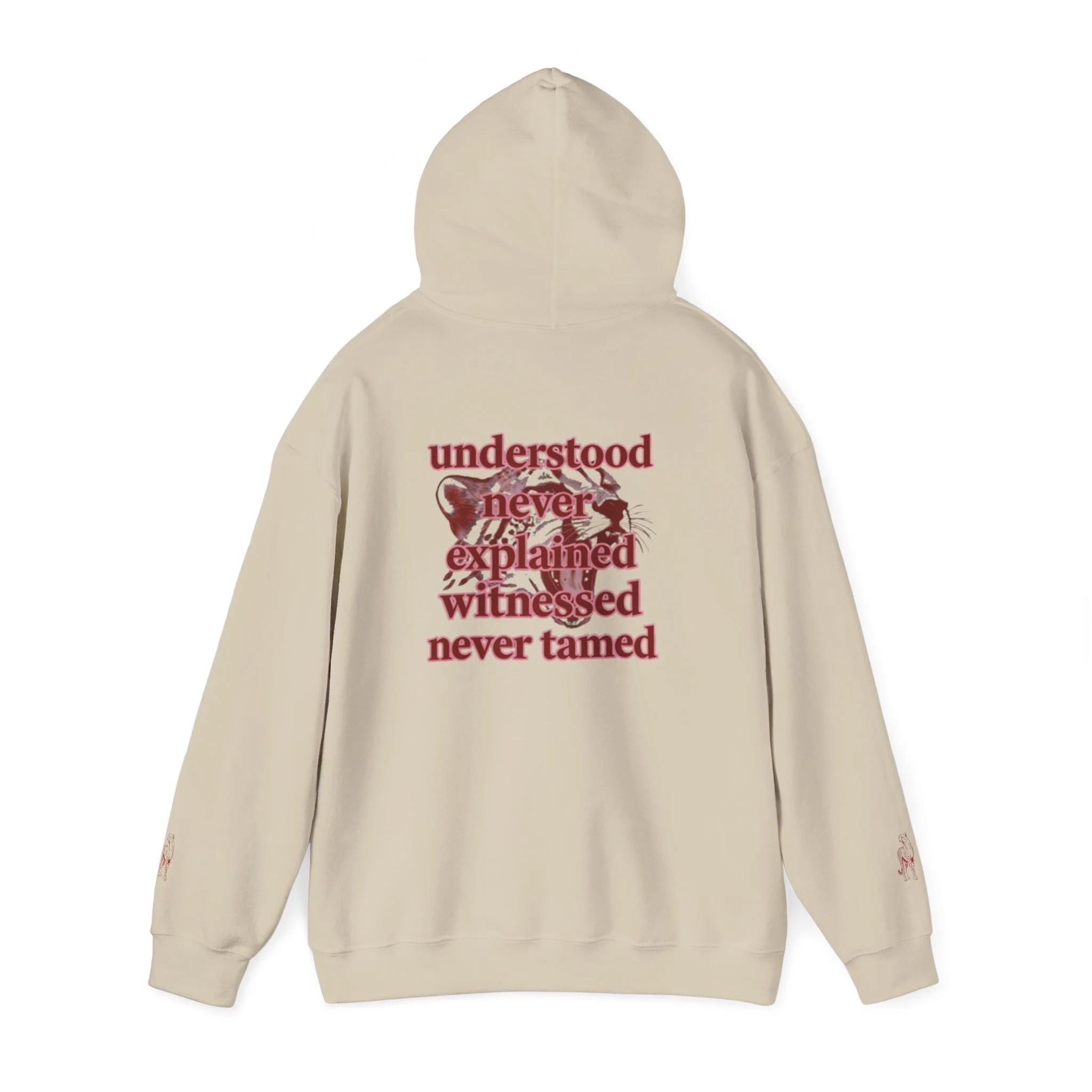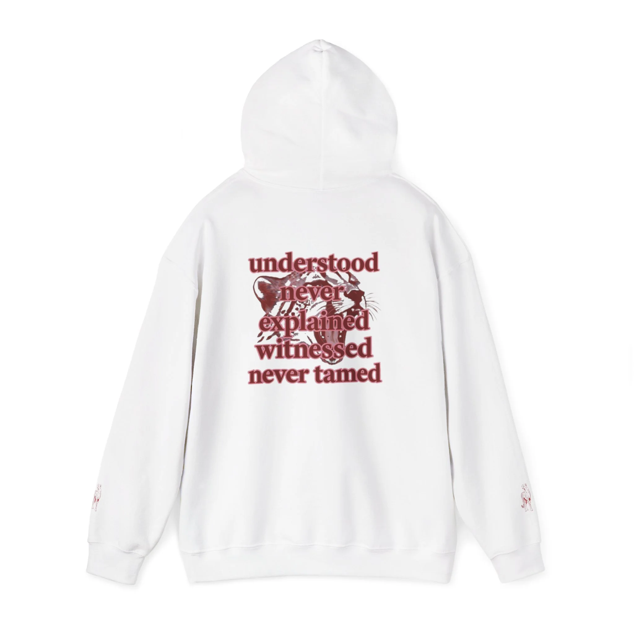 Clean “untamable” script across the chest in matching red lettering, with a roomy kangaroo pocket for everyday practicality.