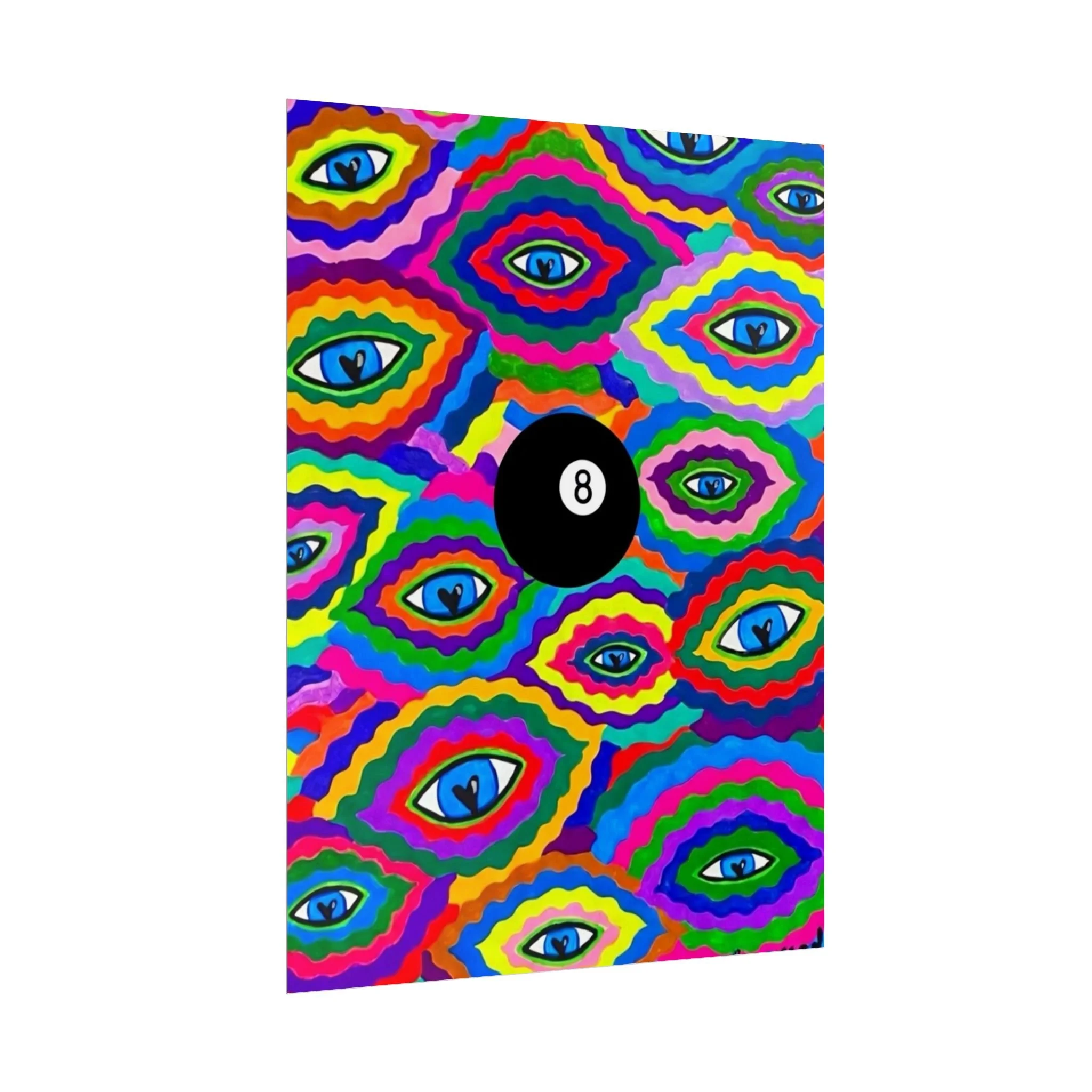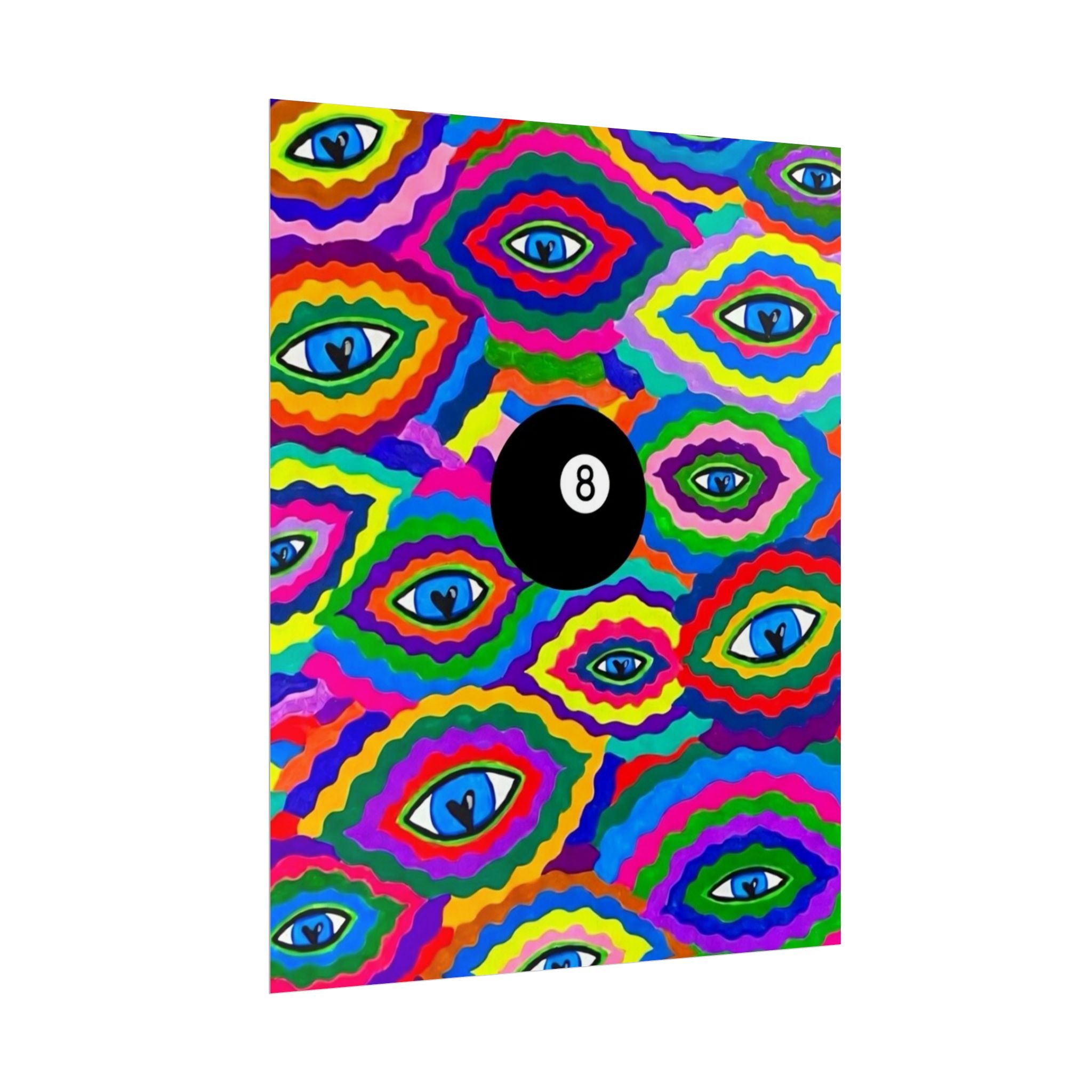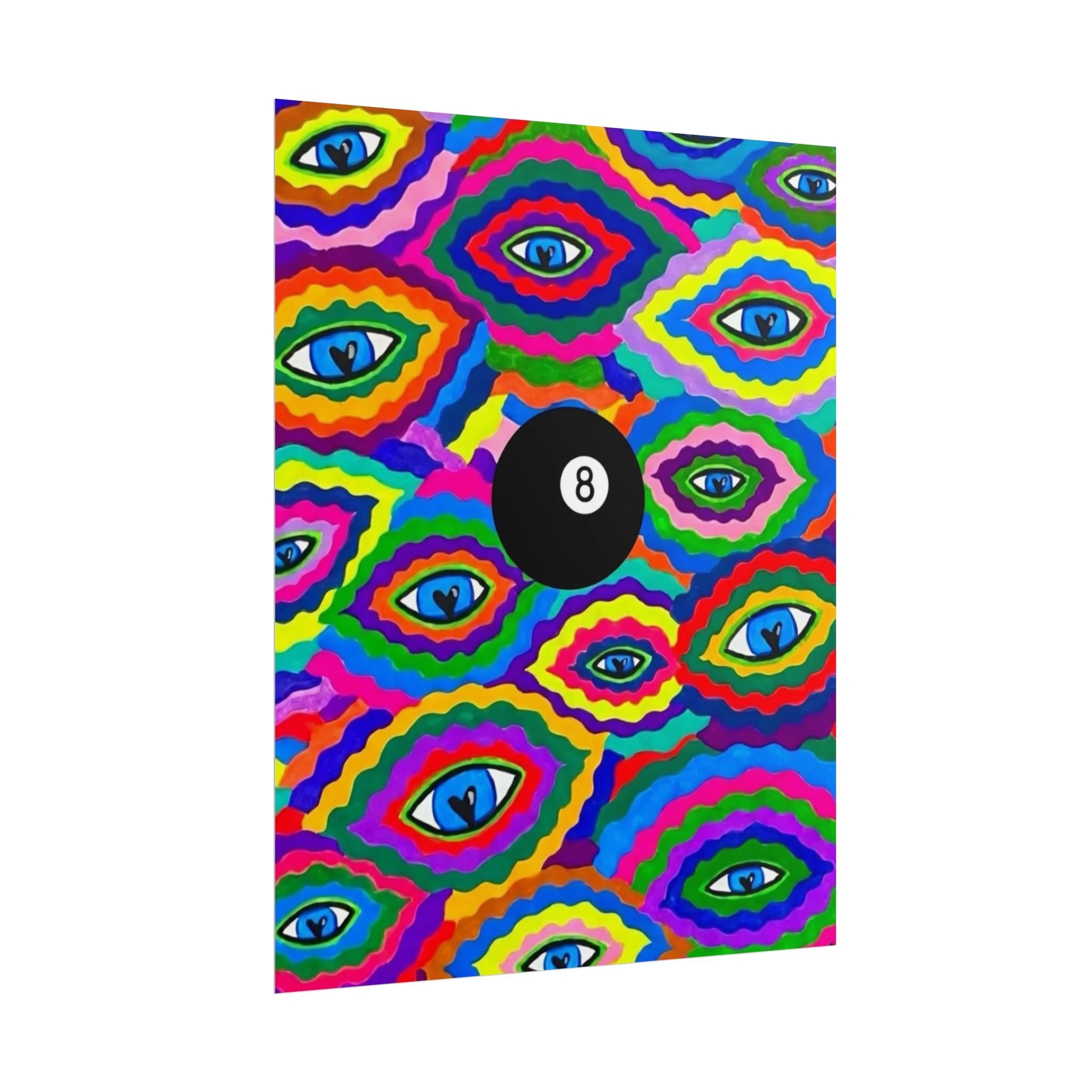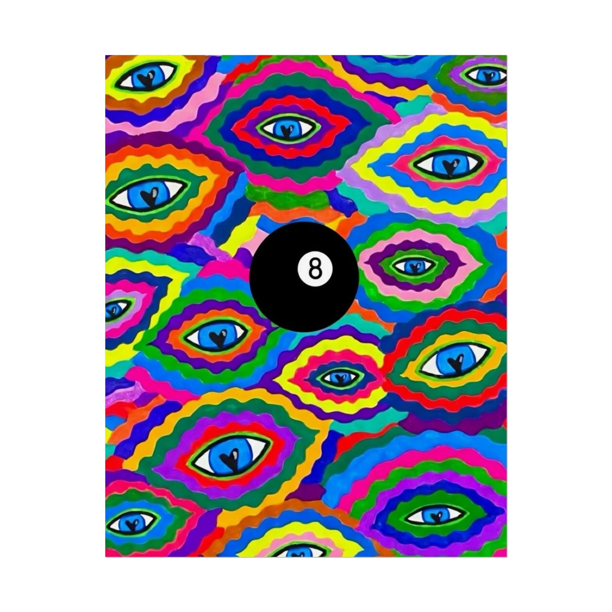 The repeating eye motif and central black 8-ball sit within layered, rainbow-like contours—an energetic, slightly psychedelic piece that livens living rooms, studios, dorms, or creative workspaces.
