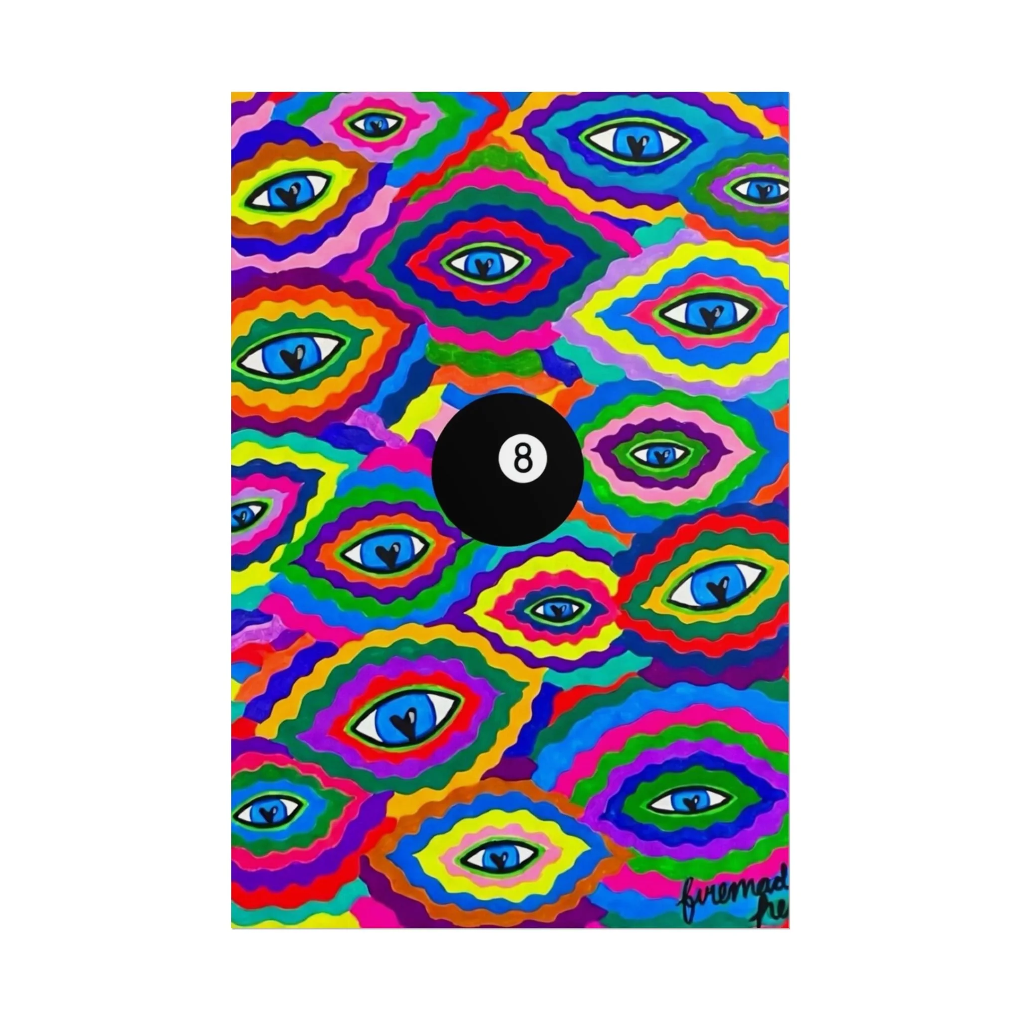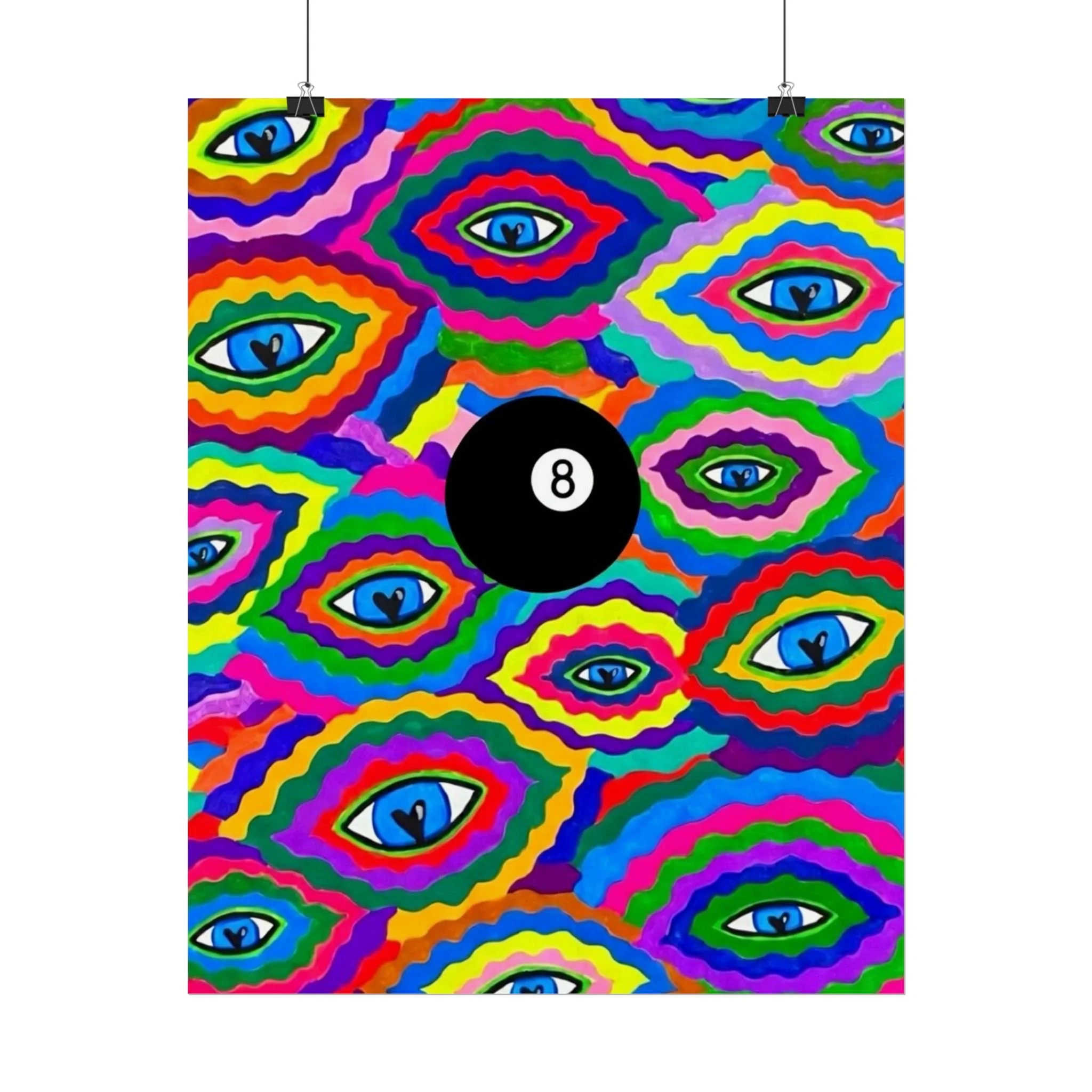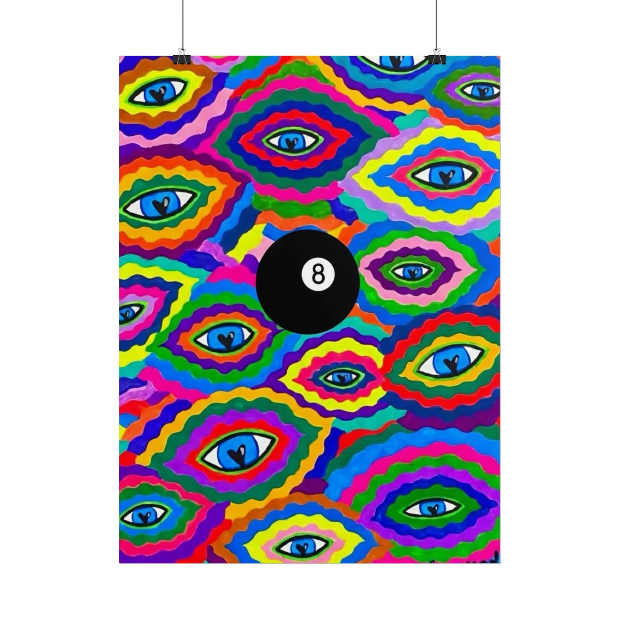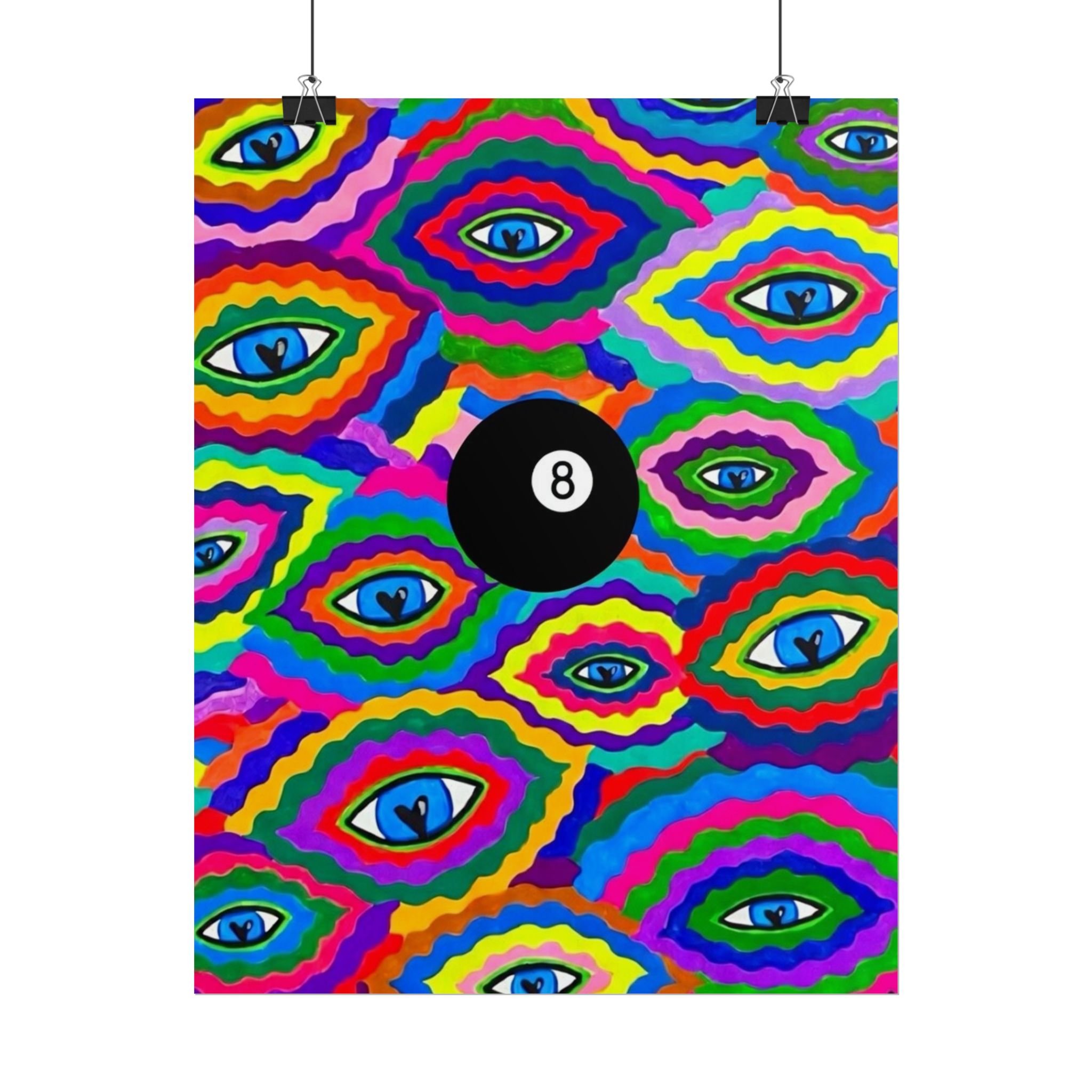 The repeating eye motif and central black 8-ball sit within layered, rainbow-like contours—an energetic, slightly psychedelic piece that livens living rooms, studios, dorms, or creative workspaces.