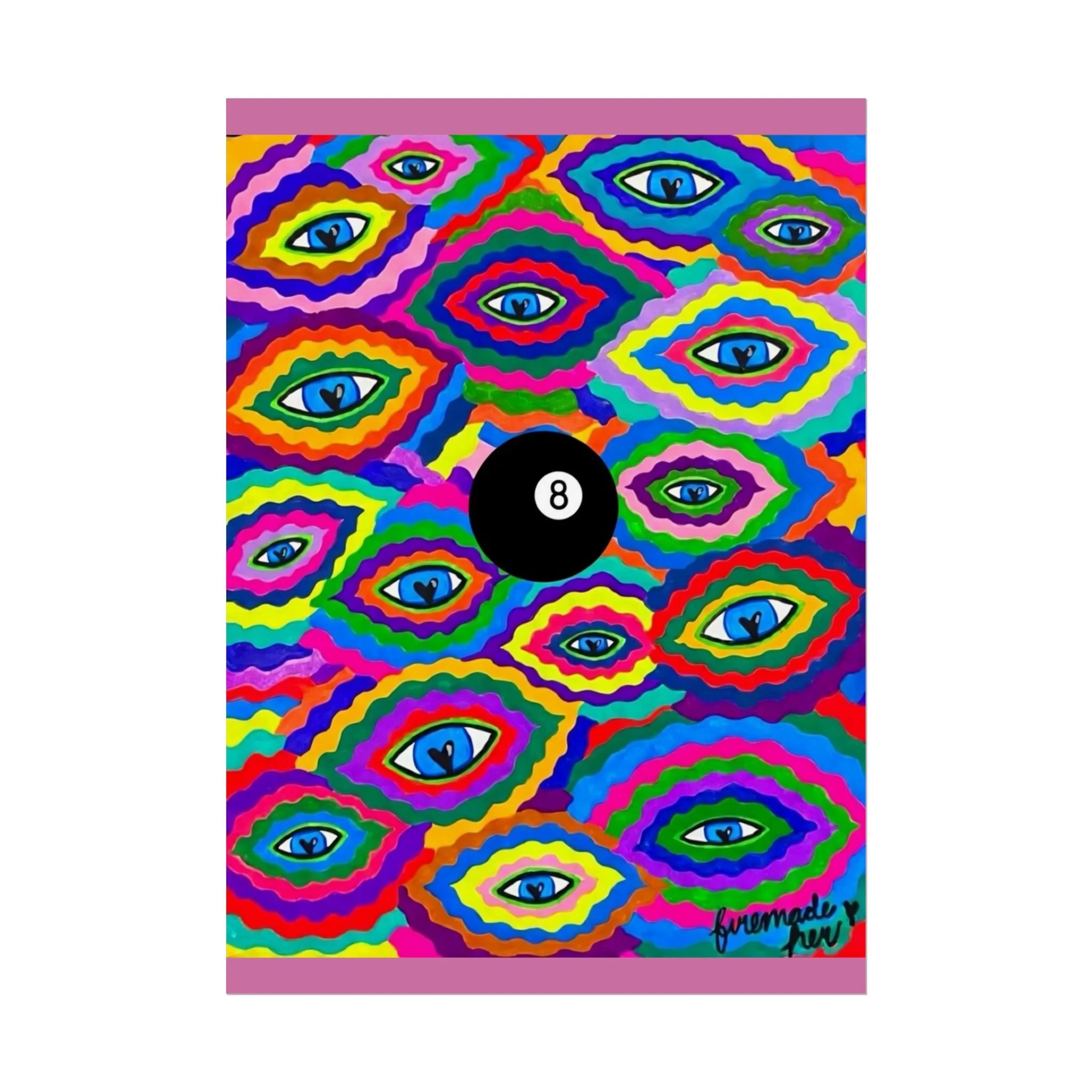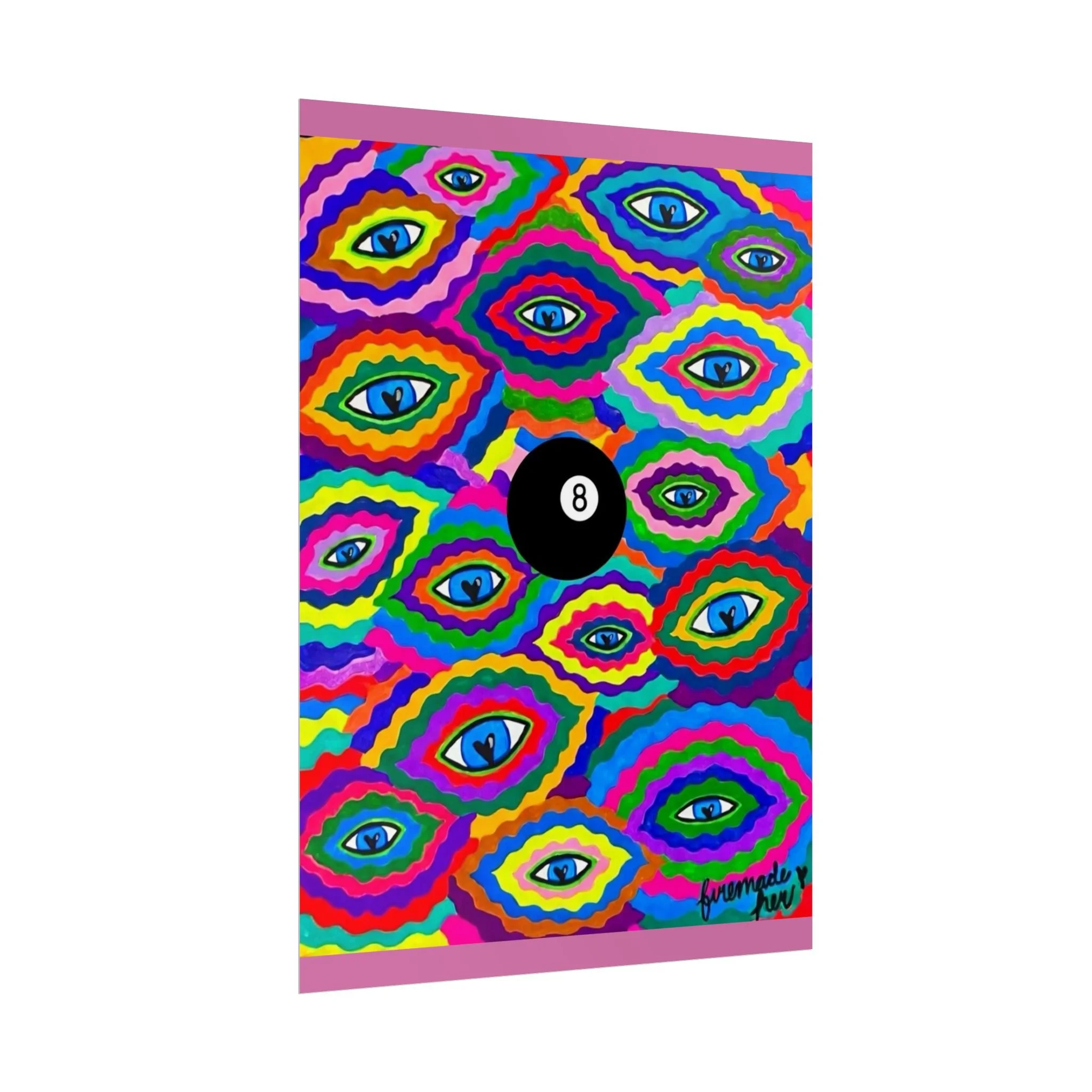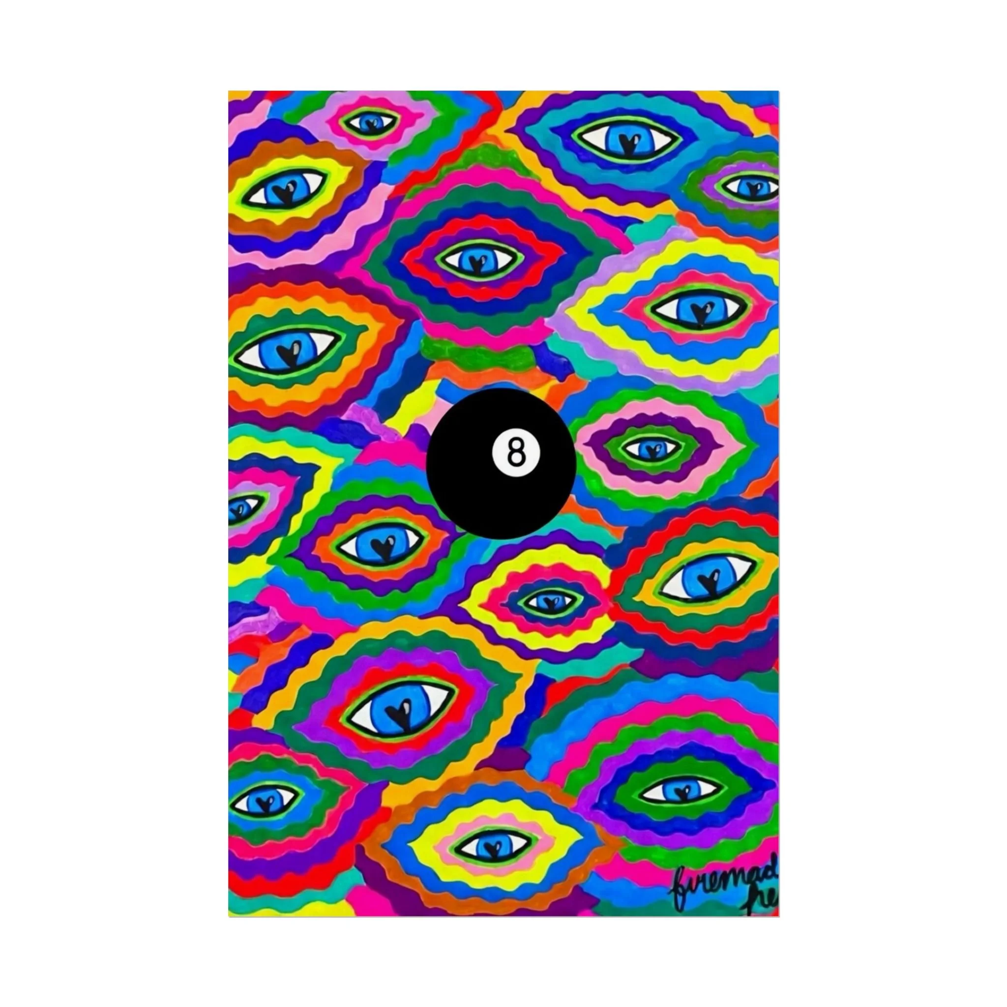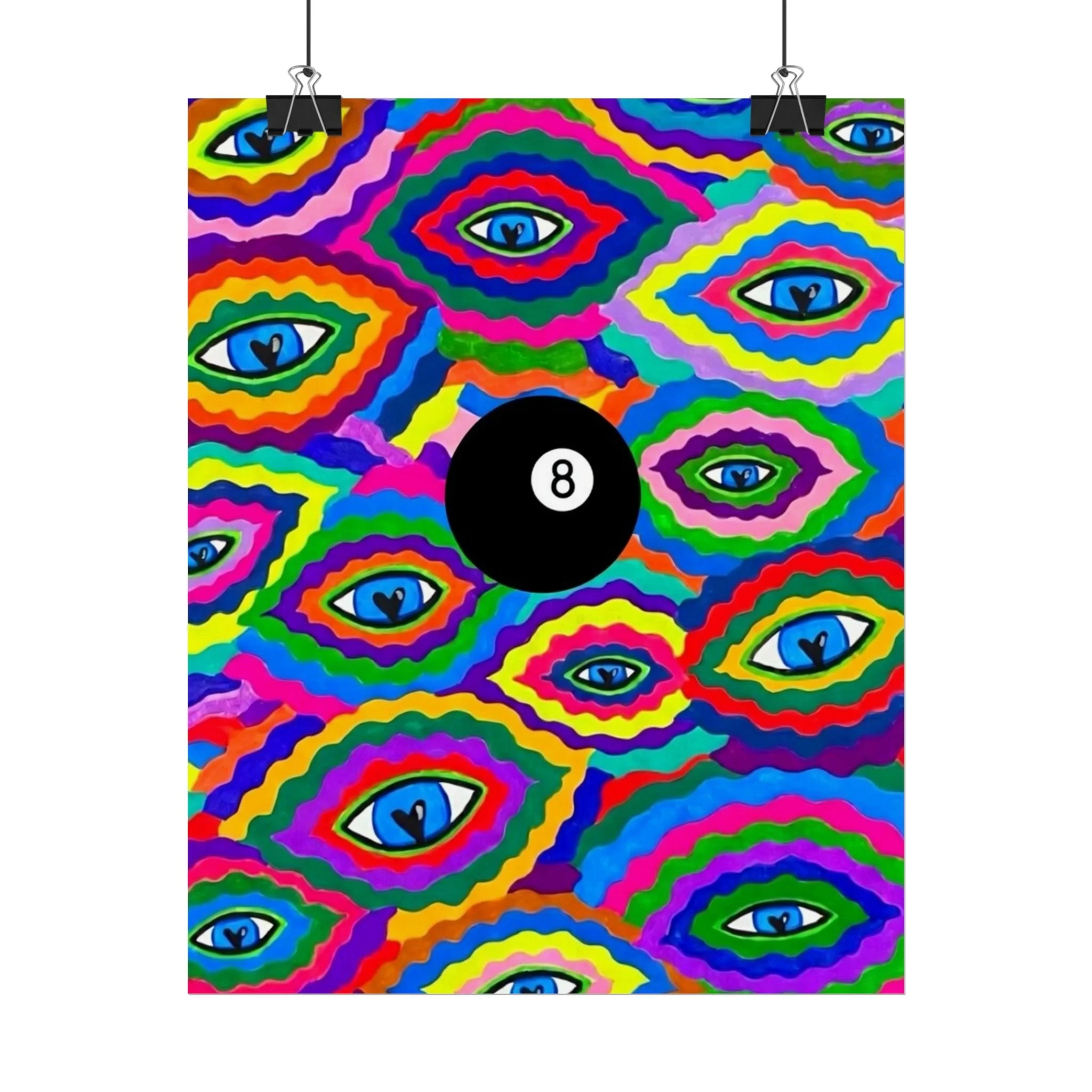 The repeating eye motif and central black 8-ball sit within layered, rainbow-like contours—an energetic, slightly psychedelic piece that livens living rooms, studios, dorms, or creative workspaces.