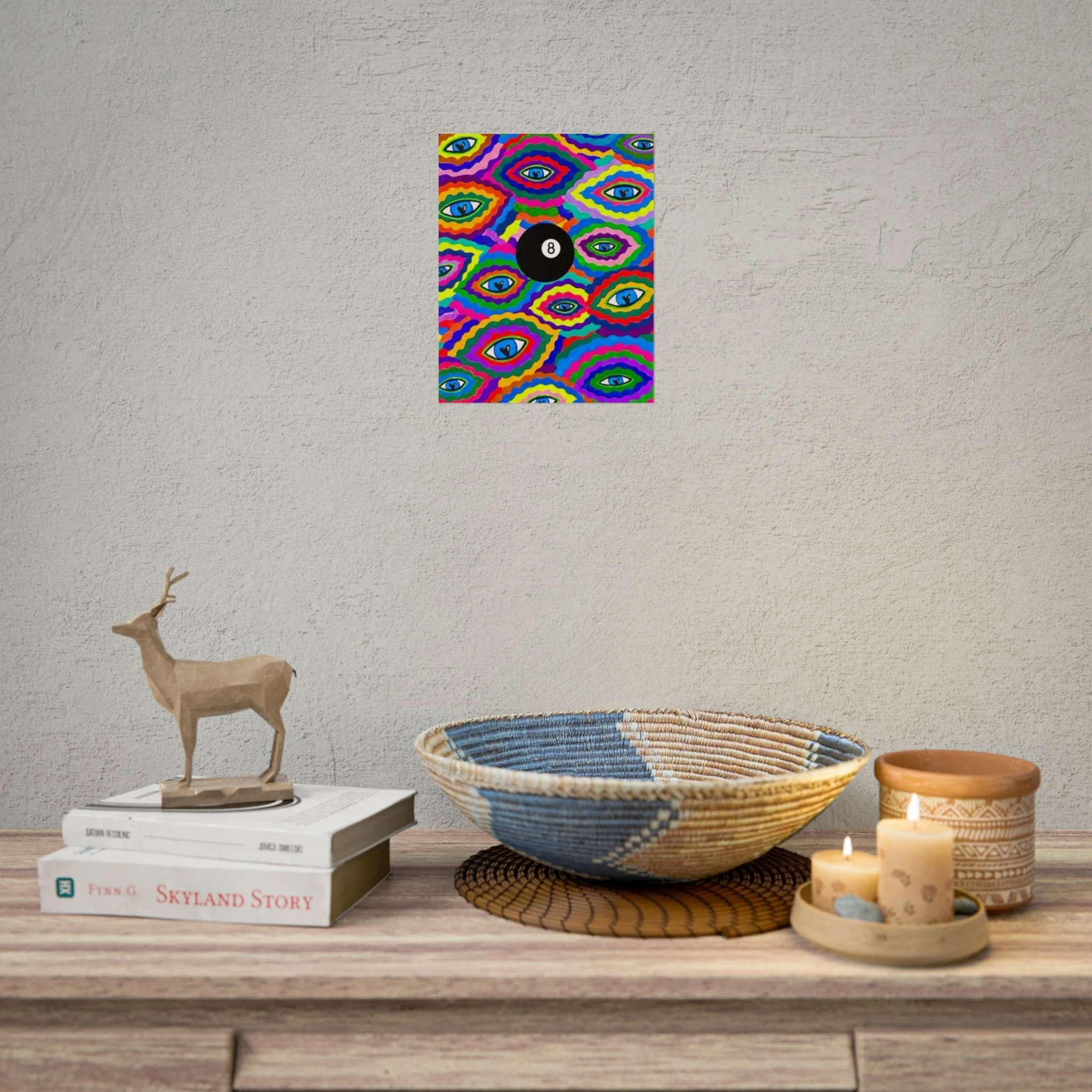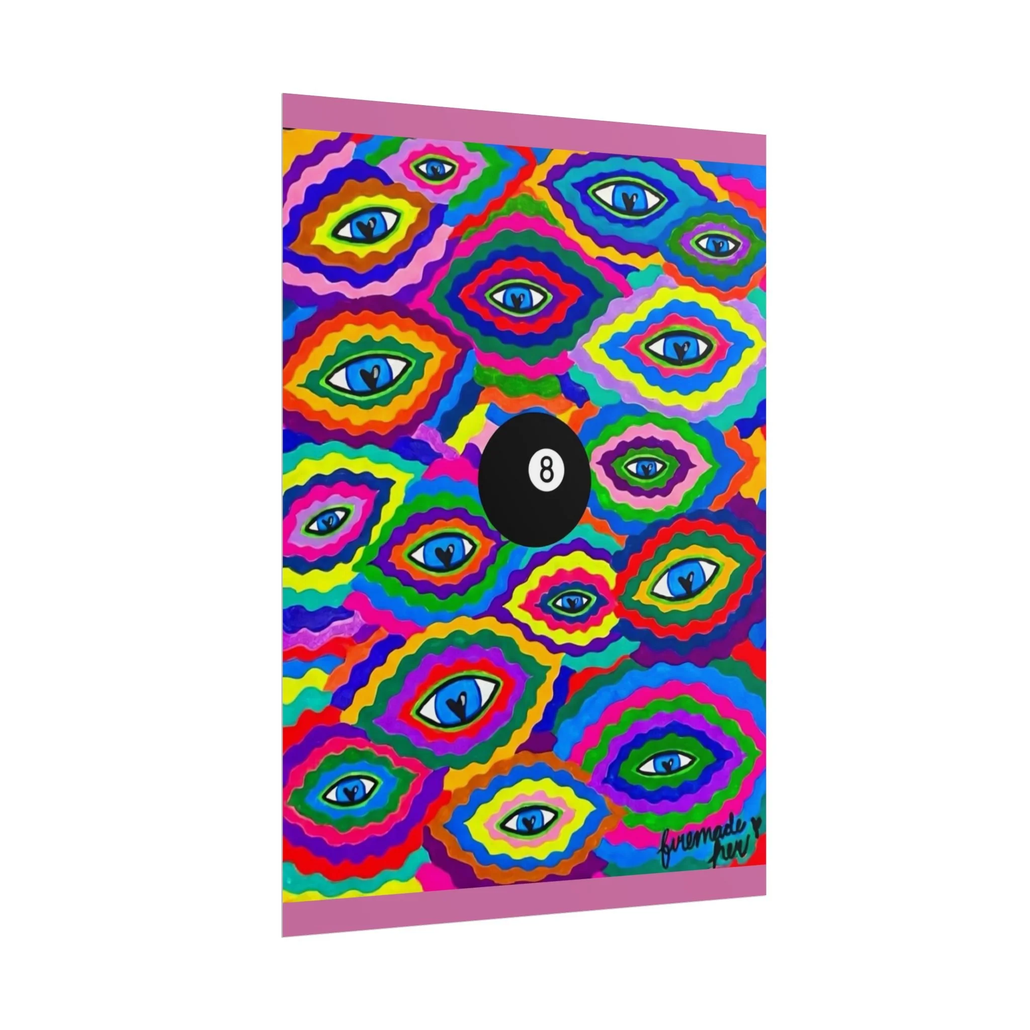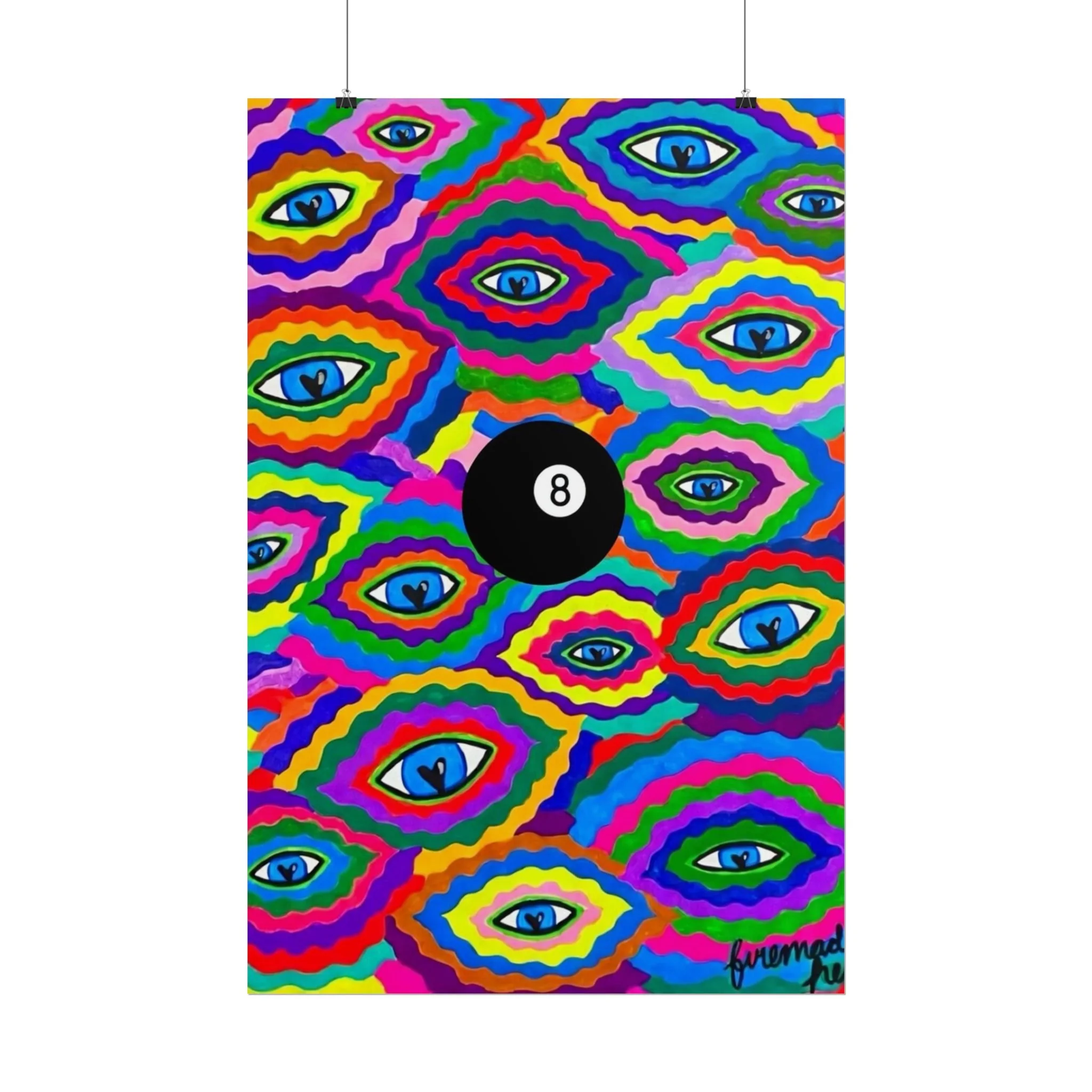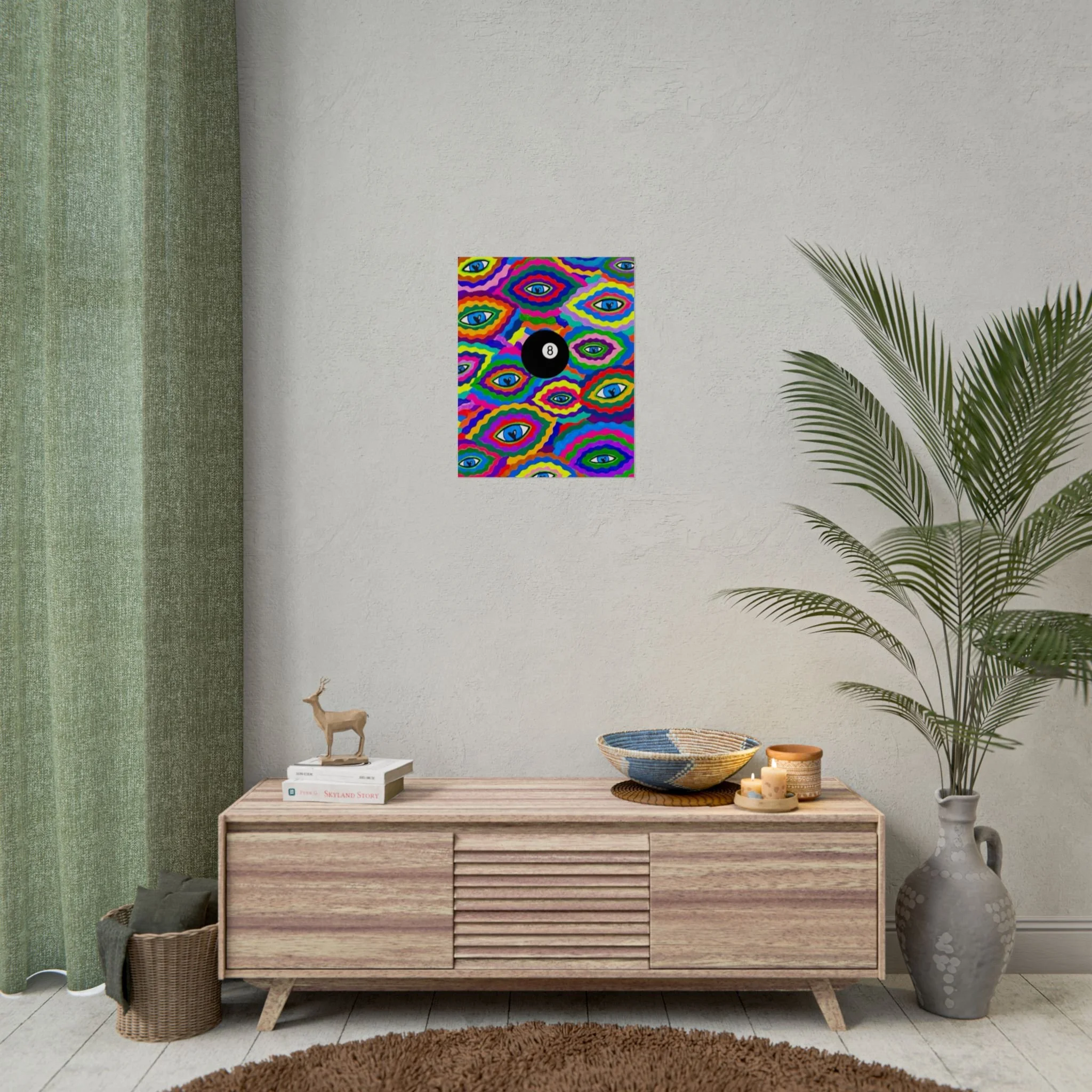 The repeating eye motif and central black 8-ball sit within layered, rainbow-like contours—an energetic, slightly psychedelic piece that livens living rooms, studios, dorms, or creative workspaces.