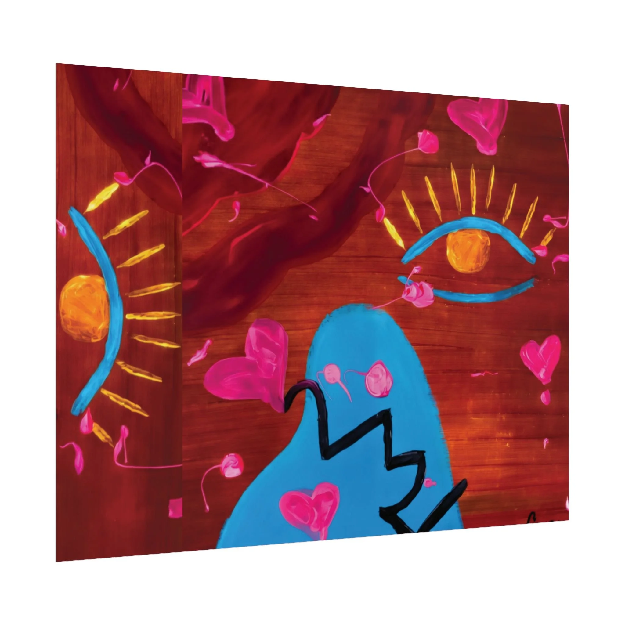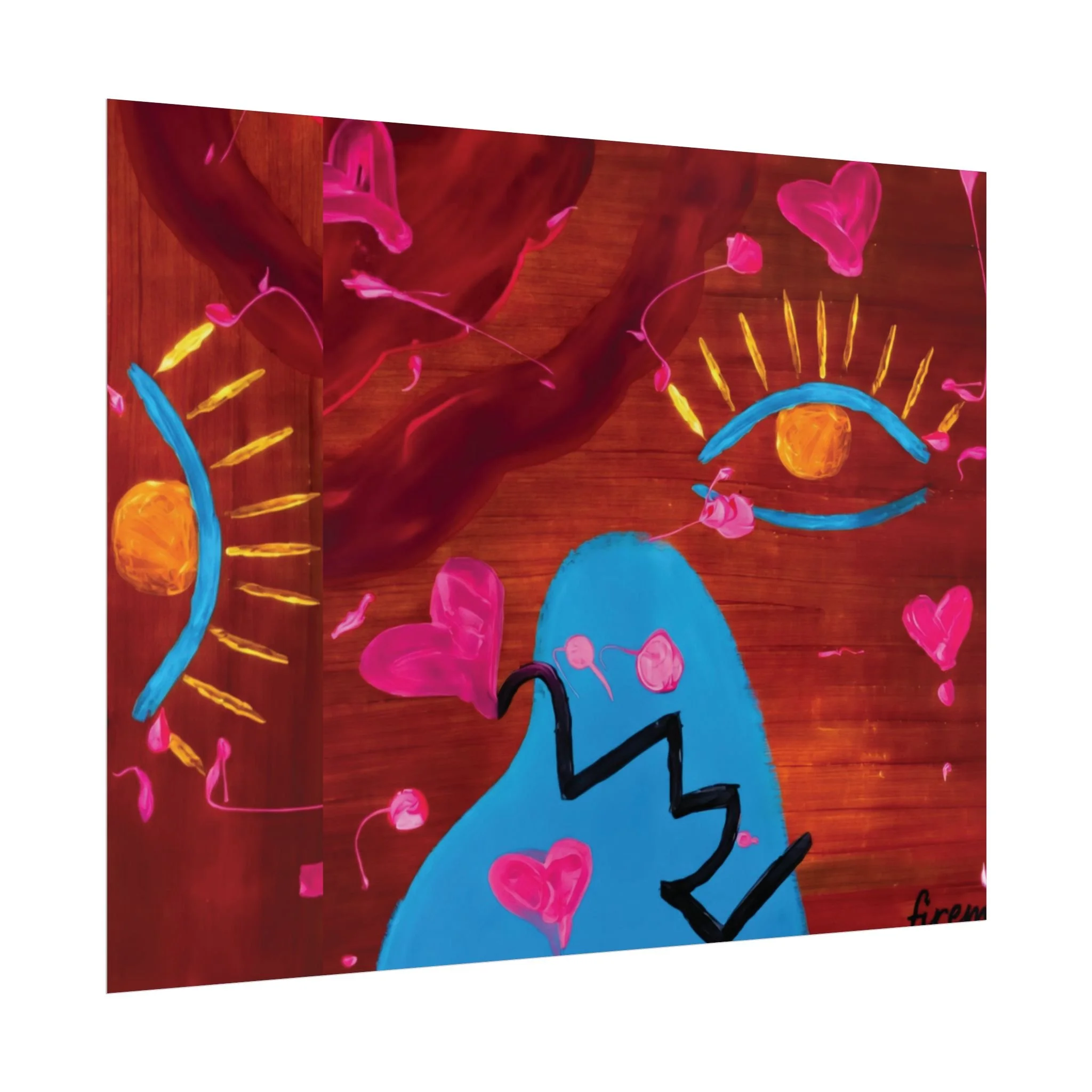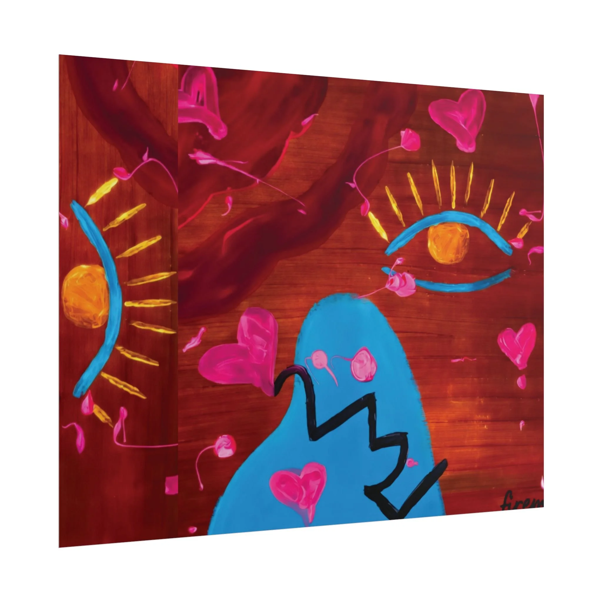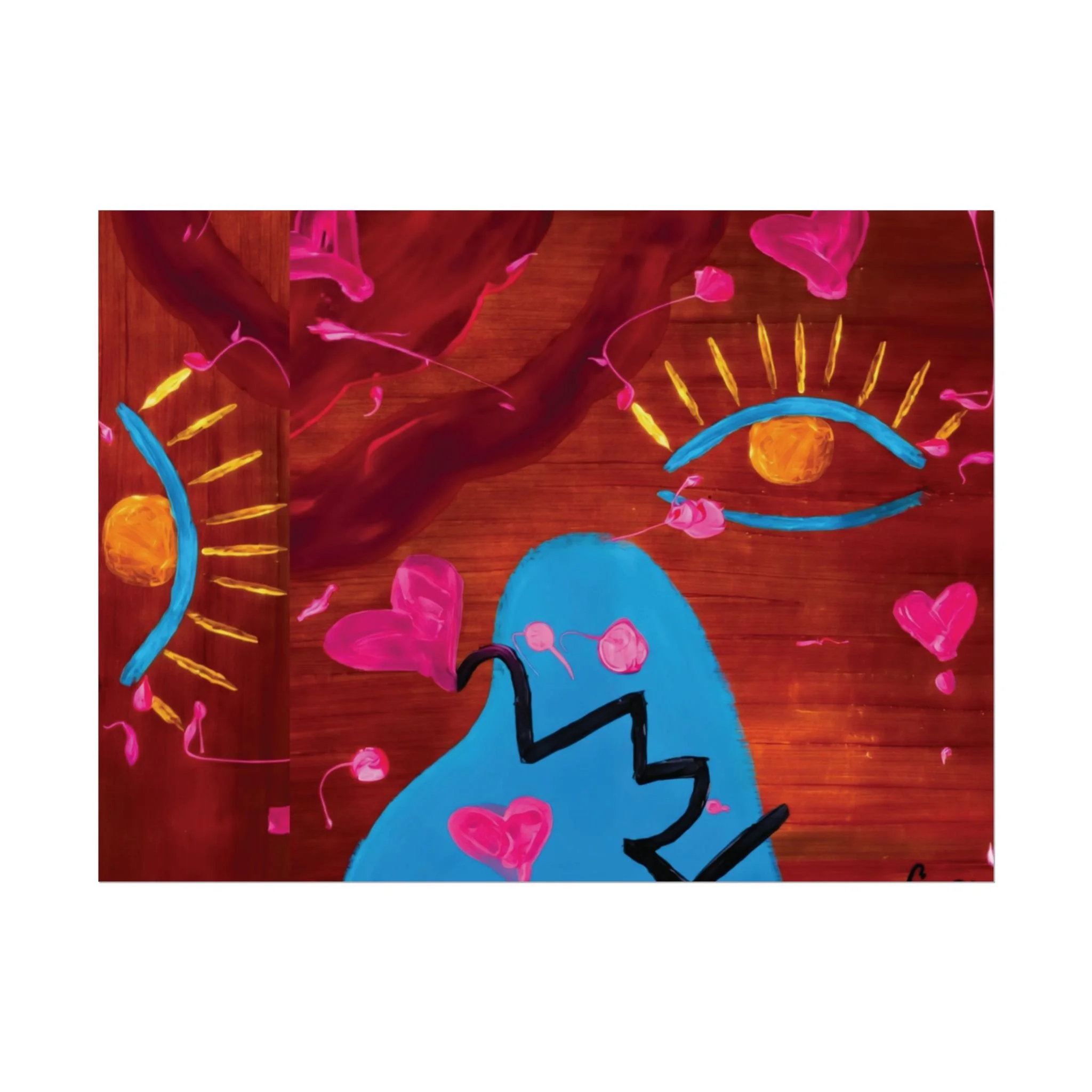Vibrant giclée inks capture the brushy textures and saturated reds, blues, and pinks — from the radiant suns to the floating hearts — so every stroke feels alive.