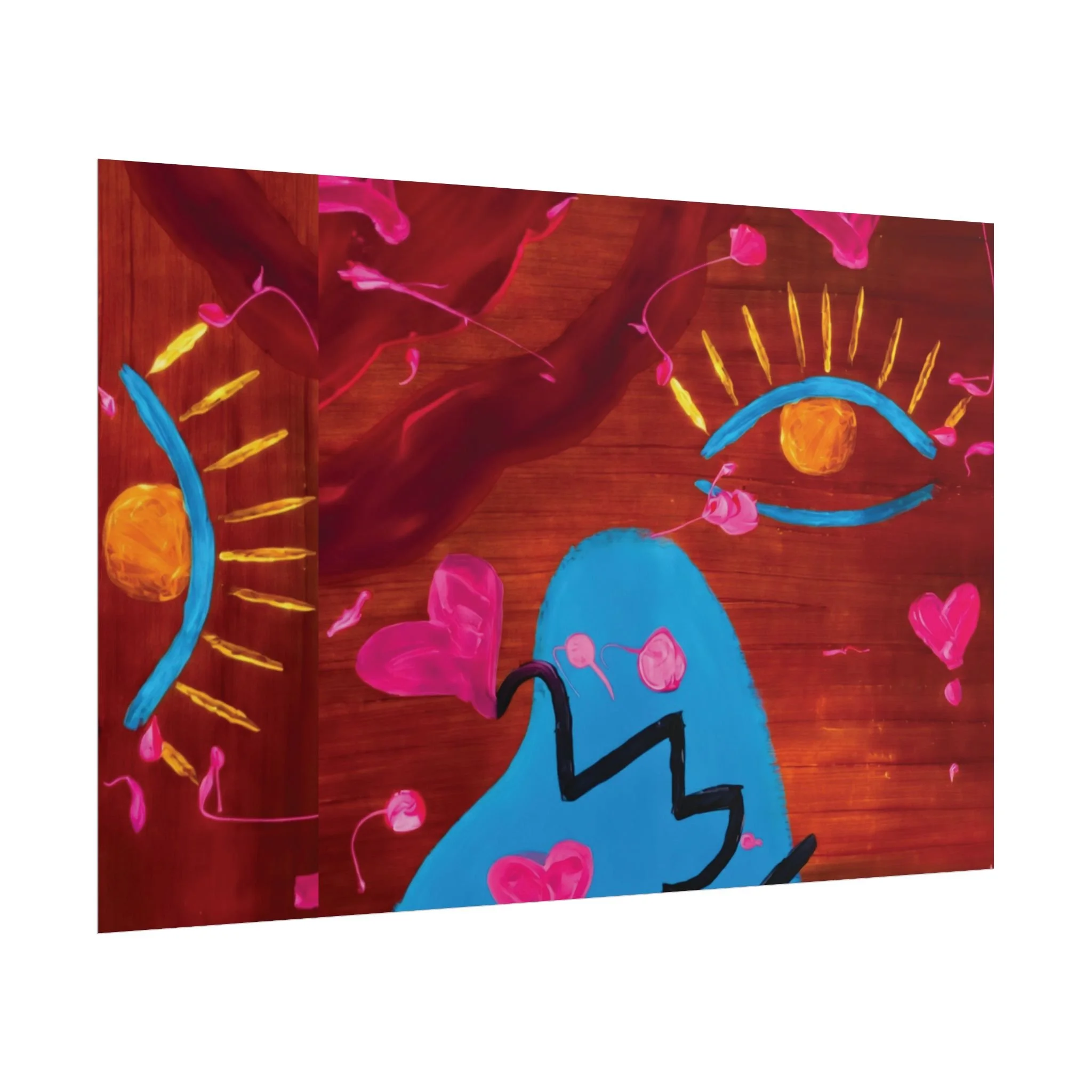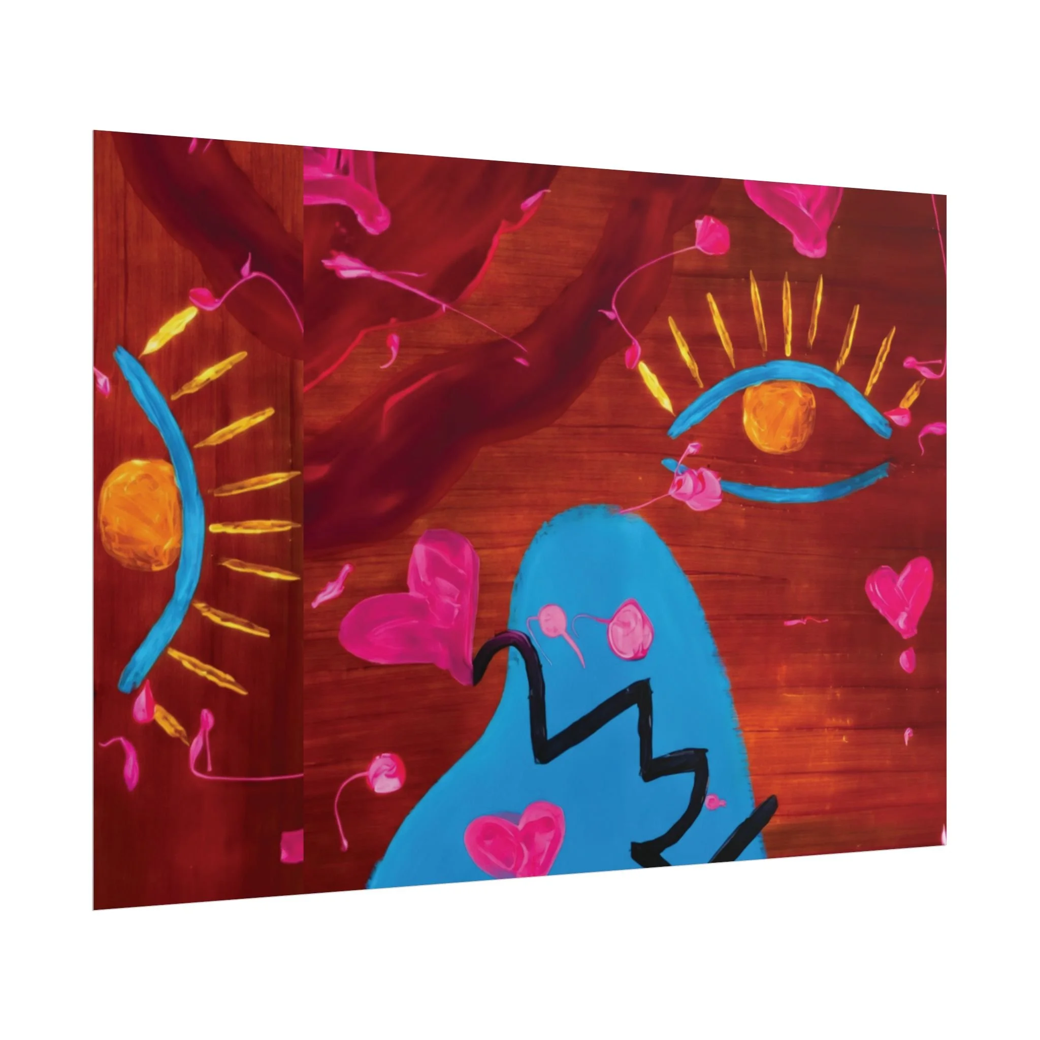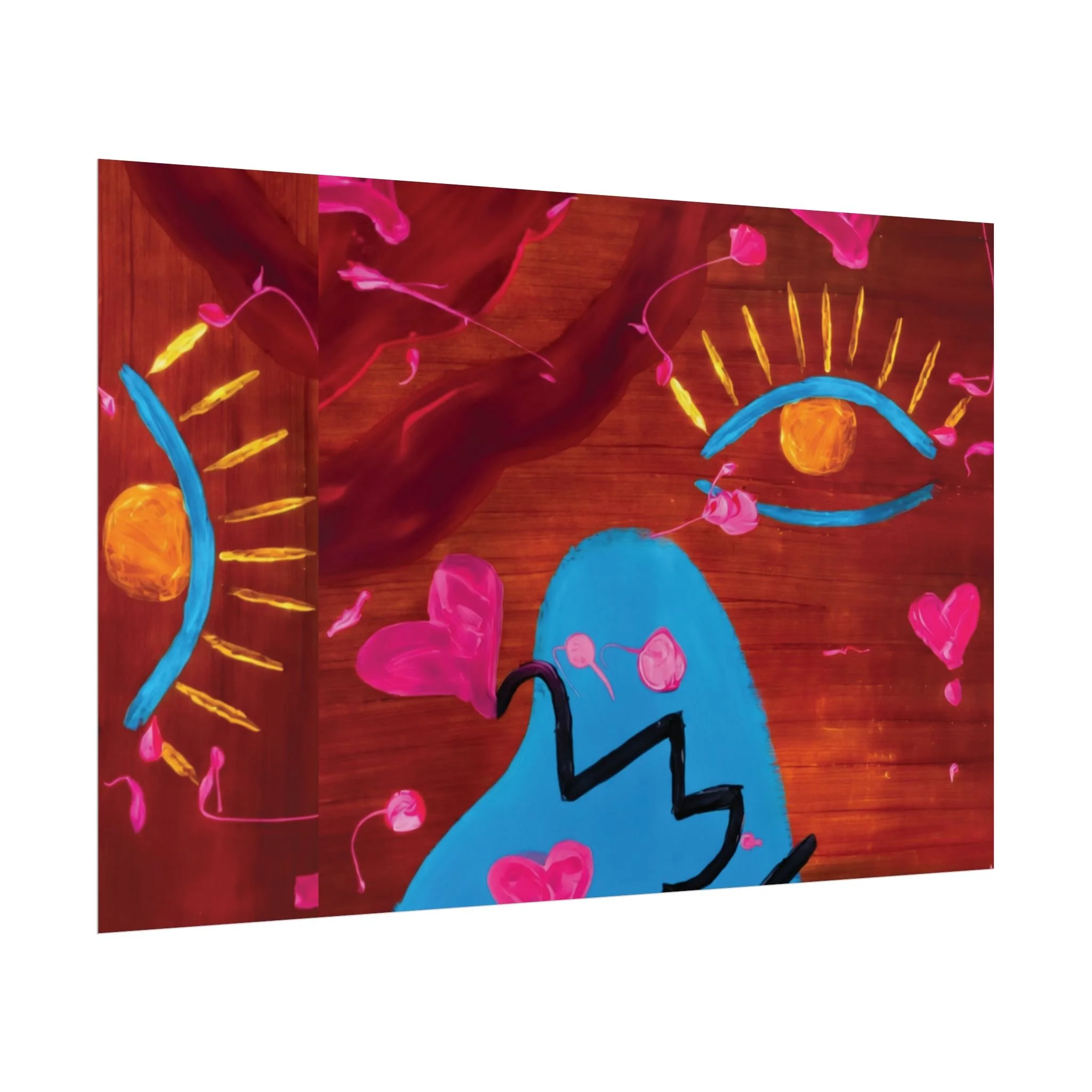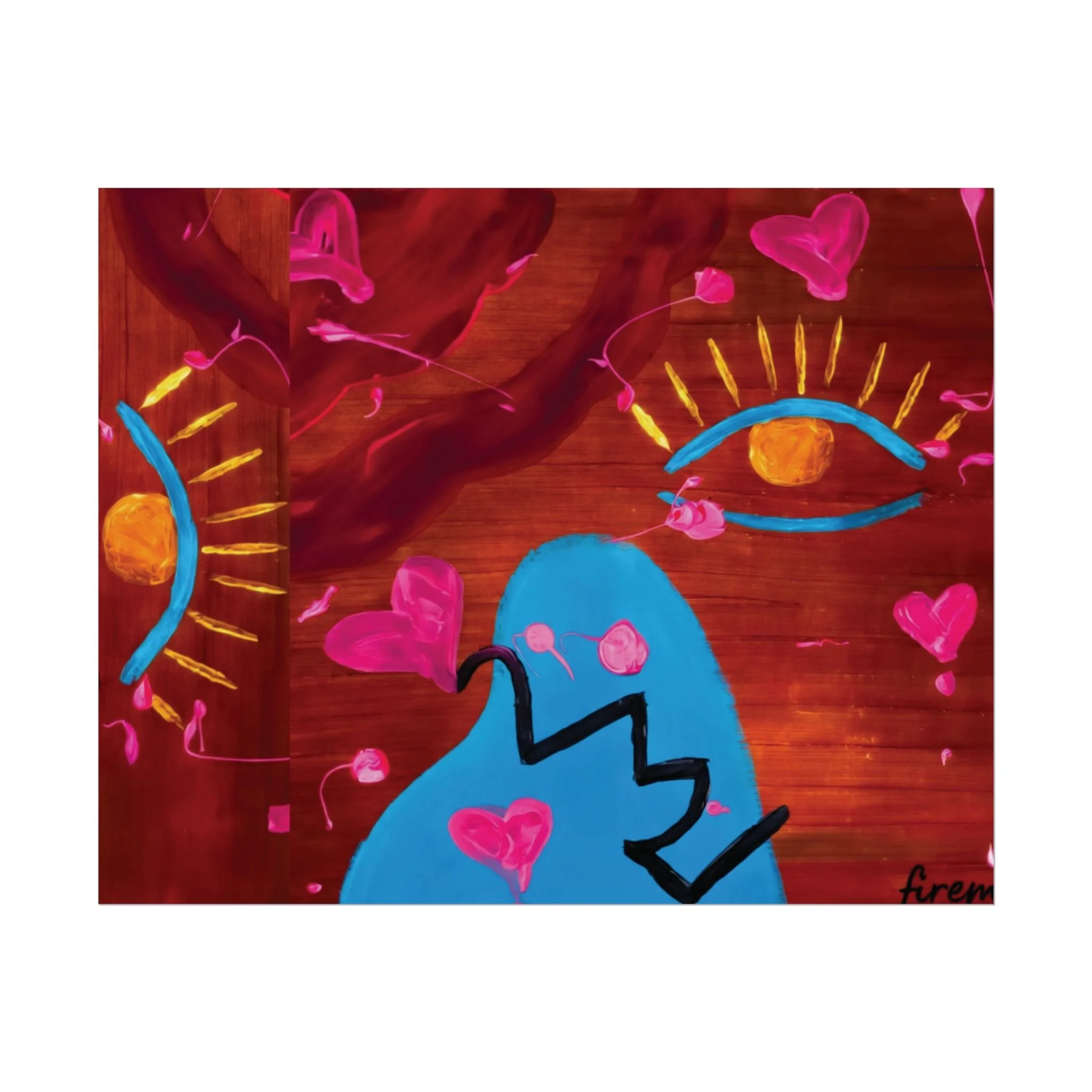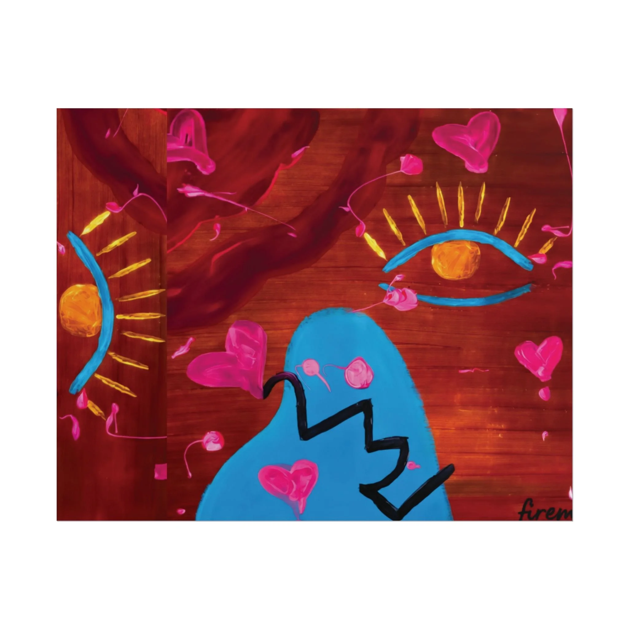 Vibrant giclée inks capture the brushy textures and saturated reds, blues, and pinks — from the radiant suns to the floating hearts — so every stroke feels alive.