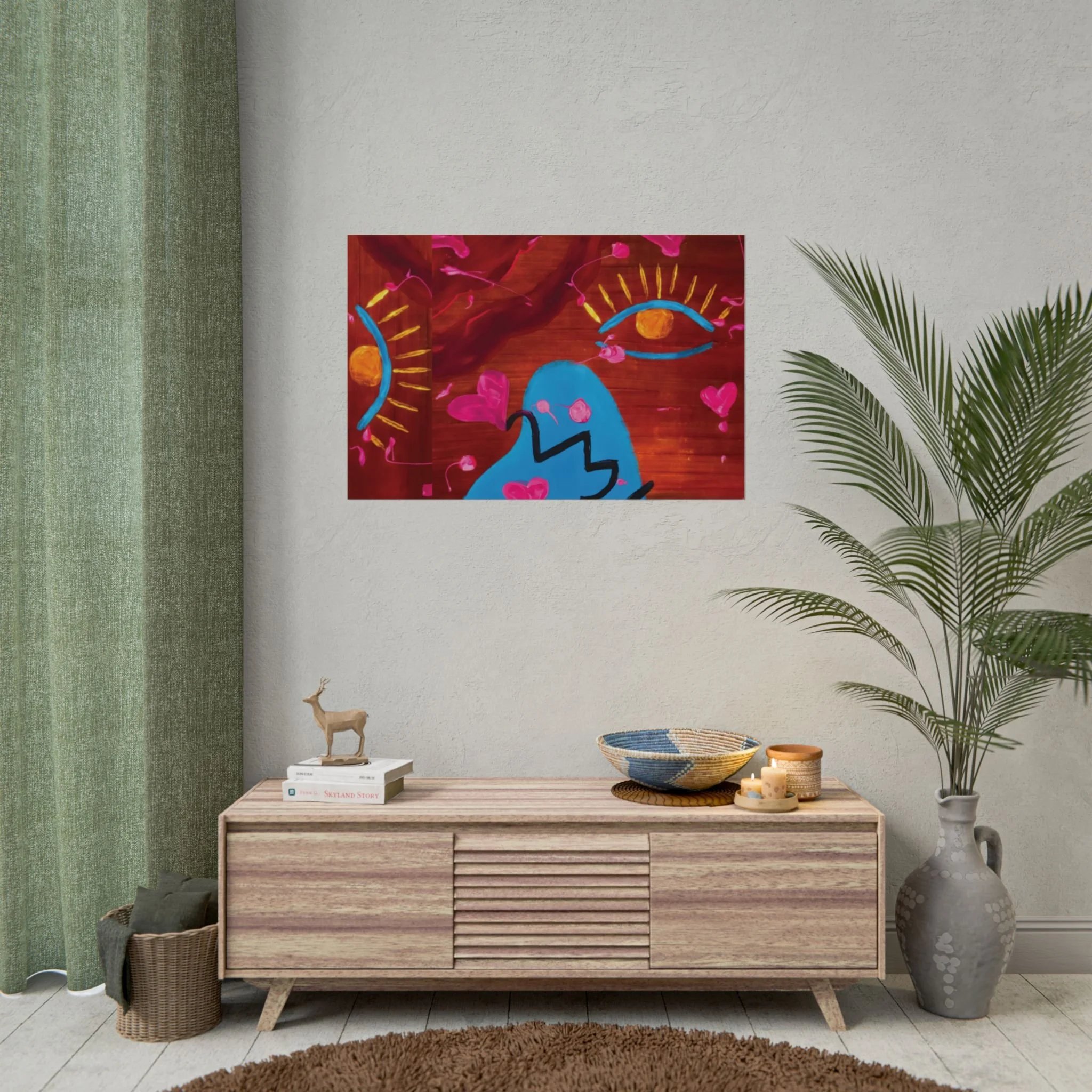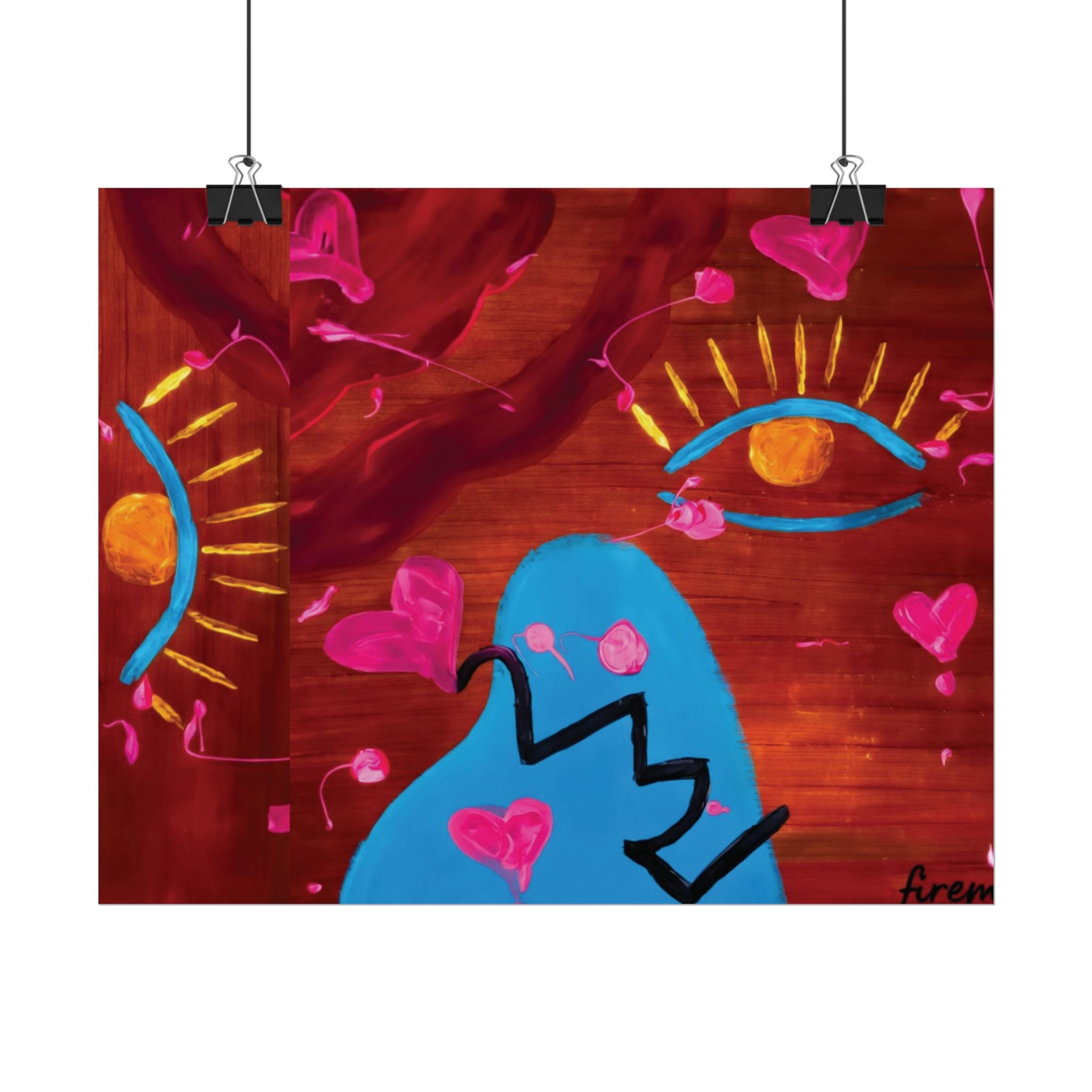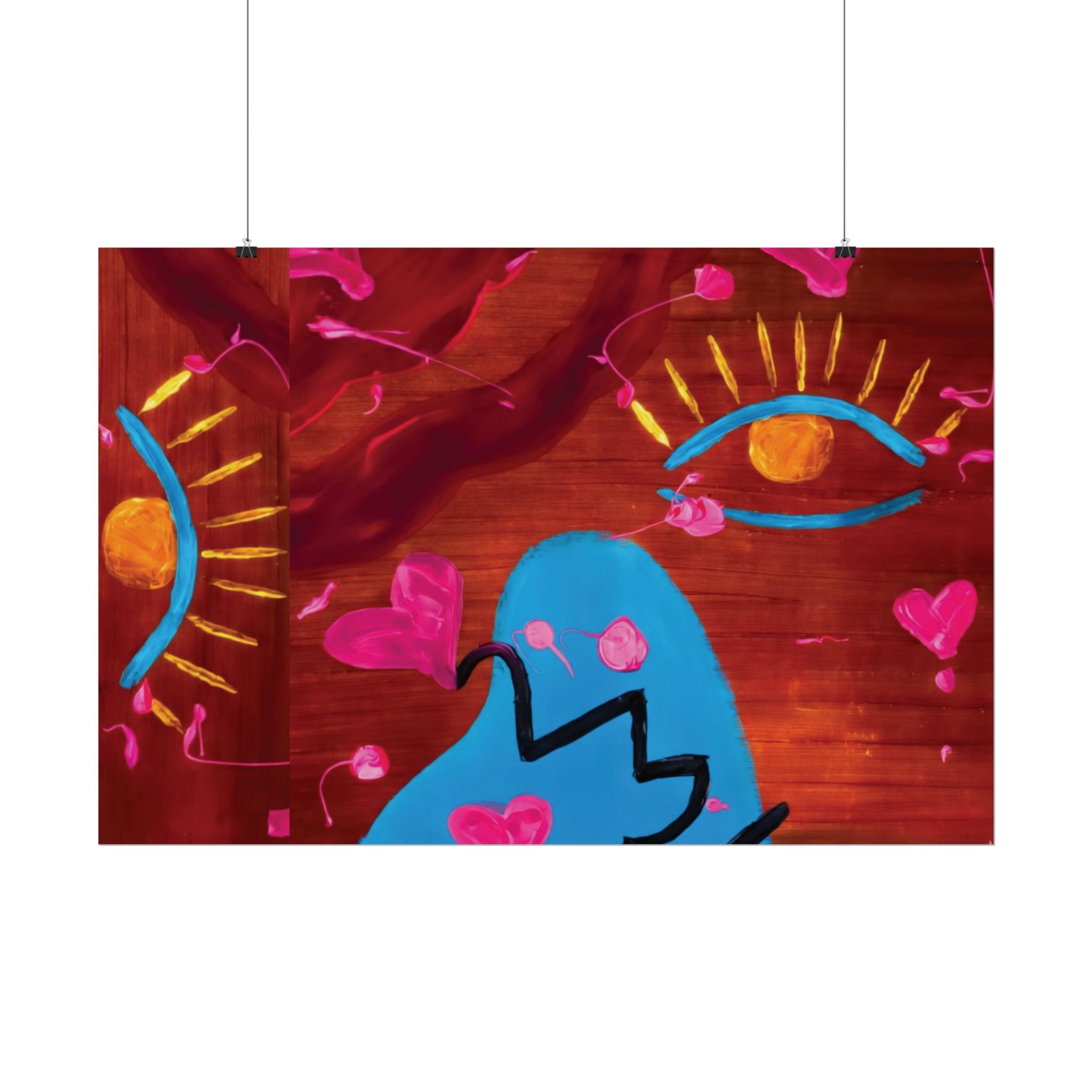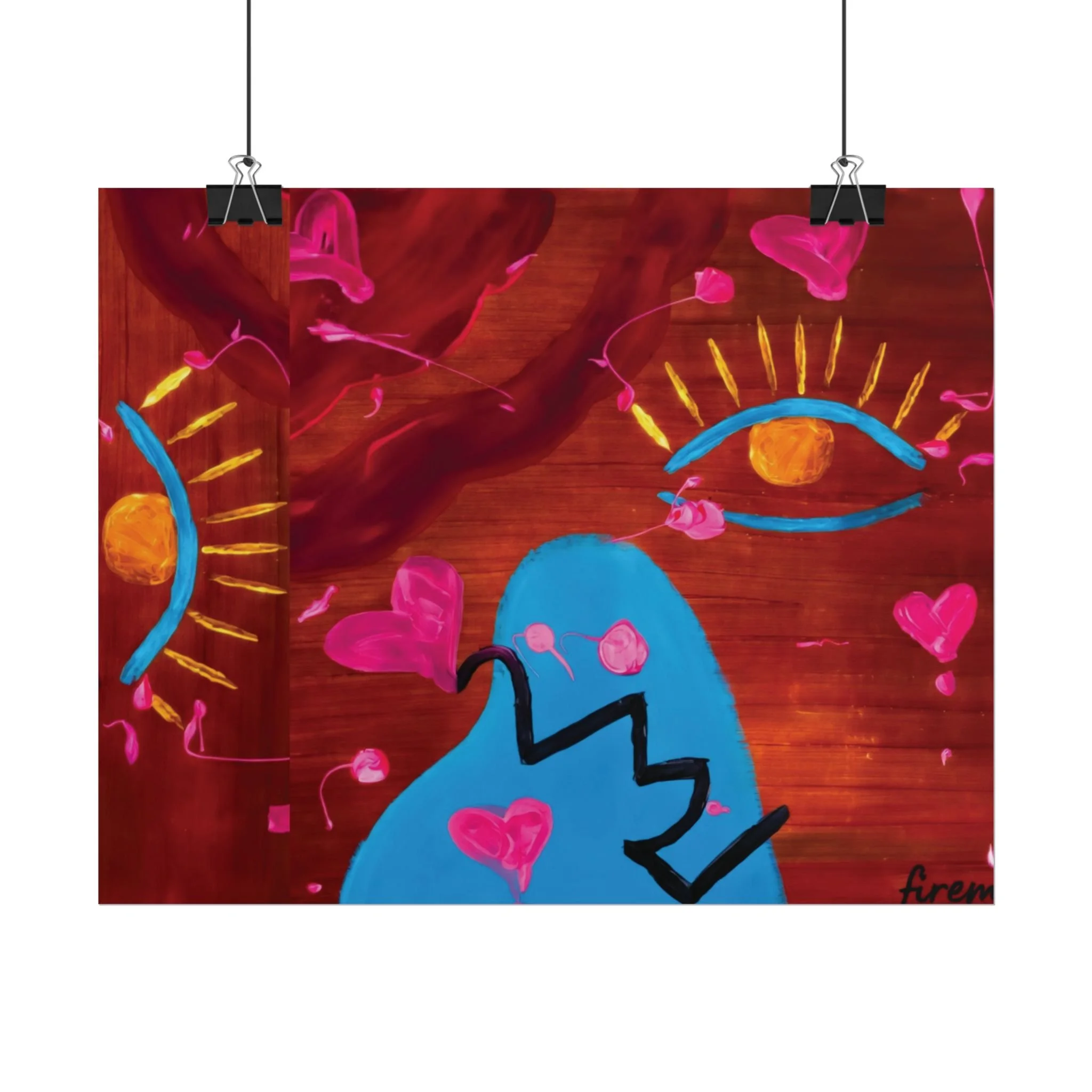 Vibrant giclée inks capture the brushy textures and saturated reds, blues, and pinks — from the radiant suns to the floating hearts — so every stroke feels alive.