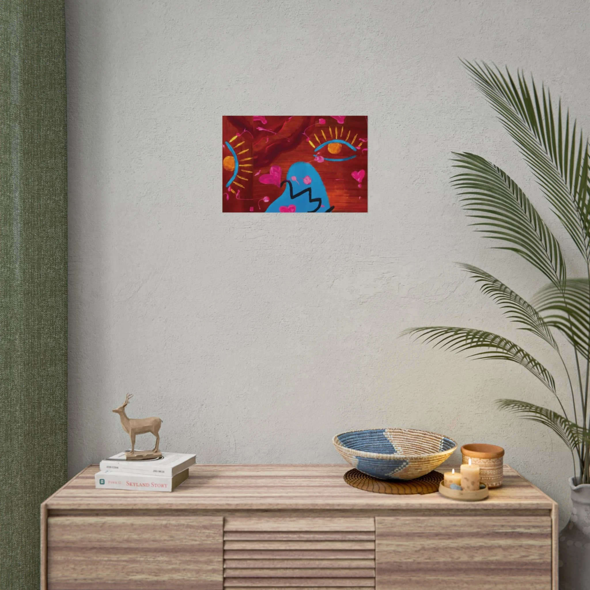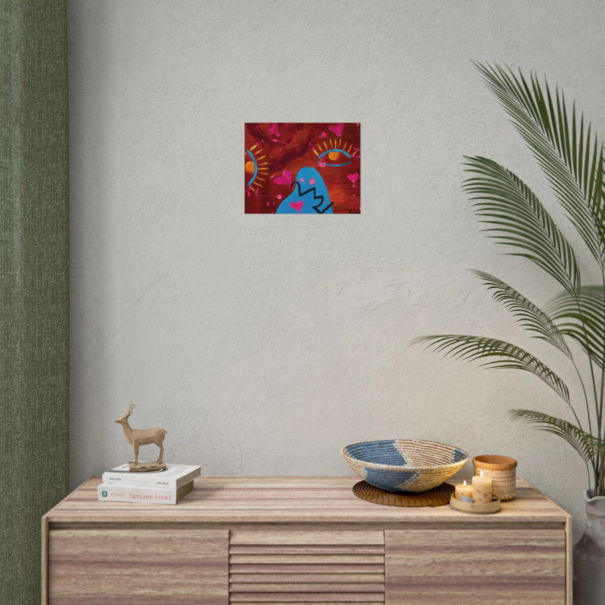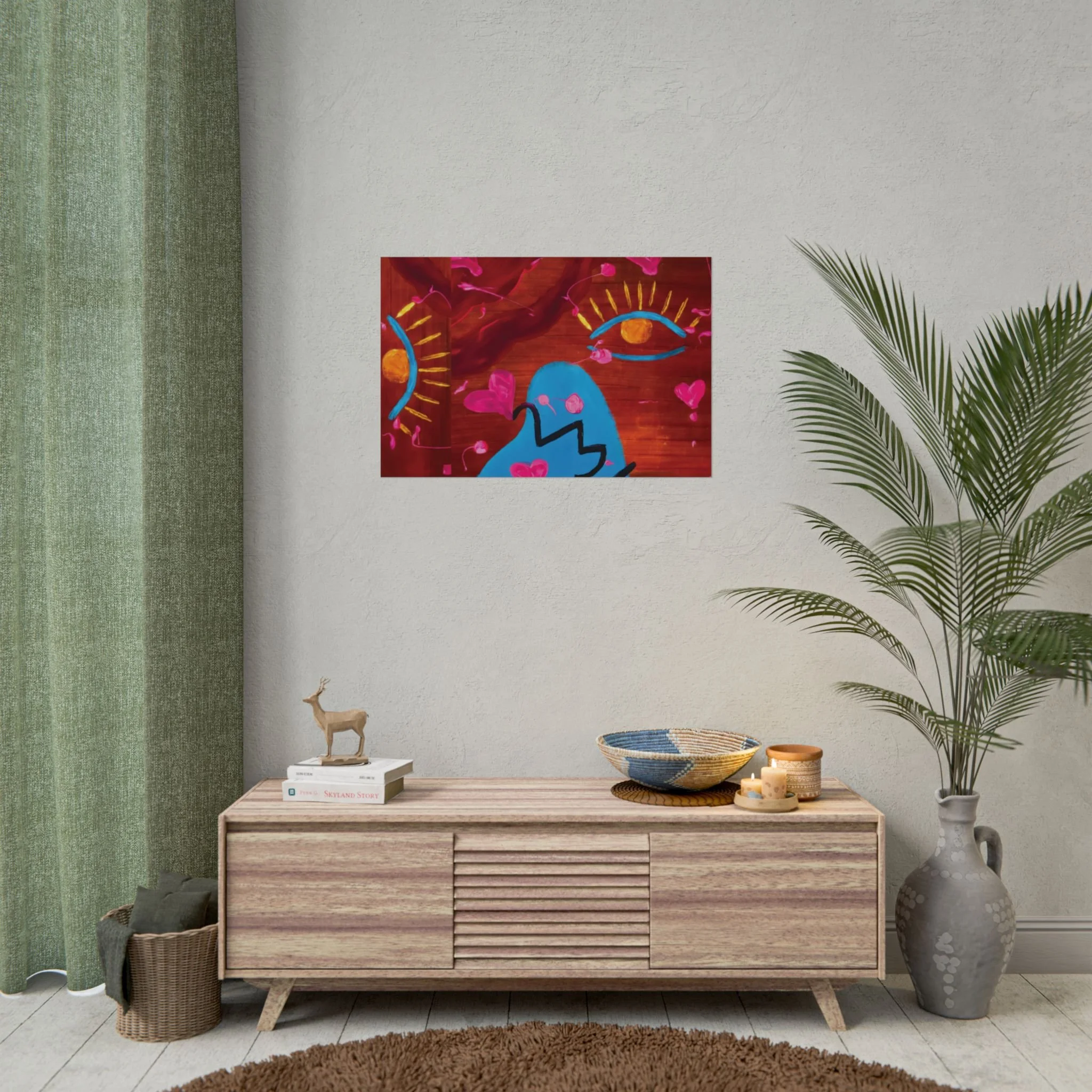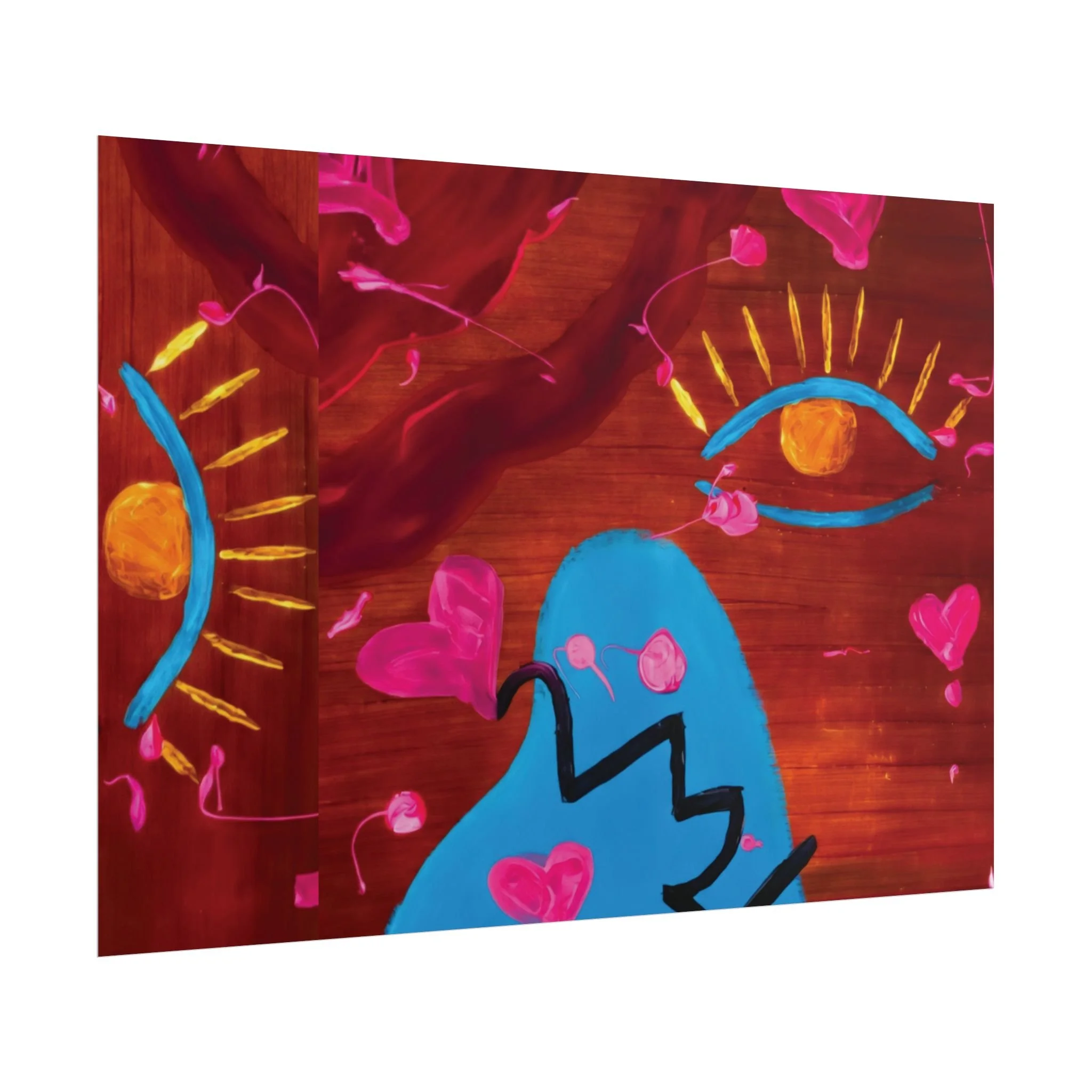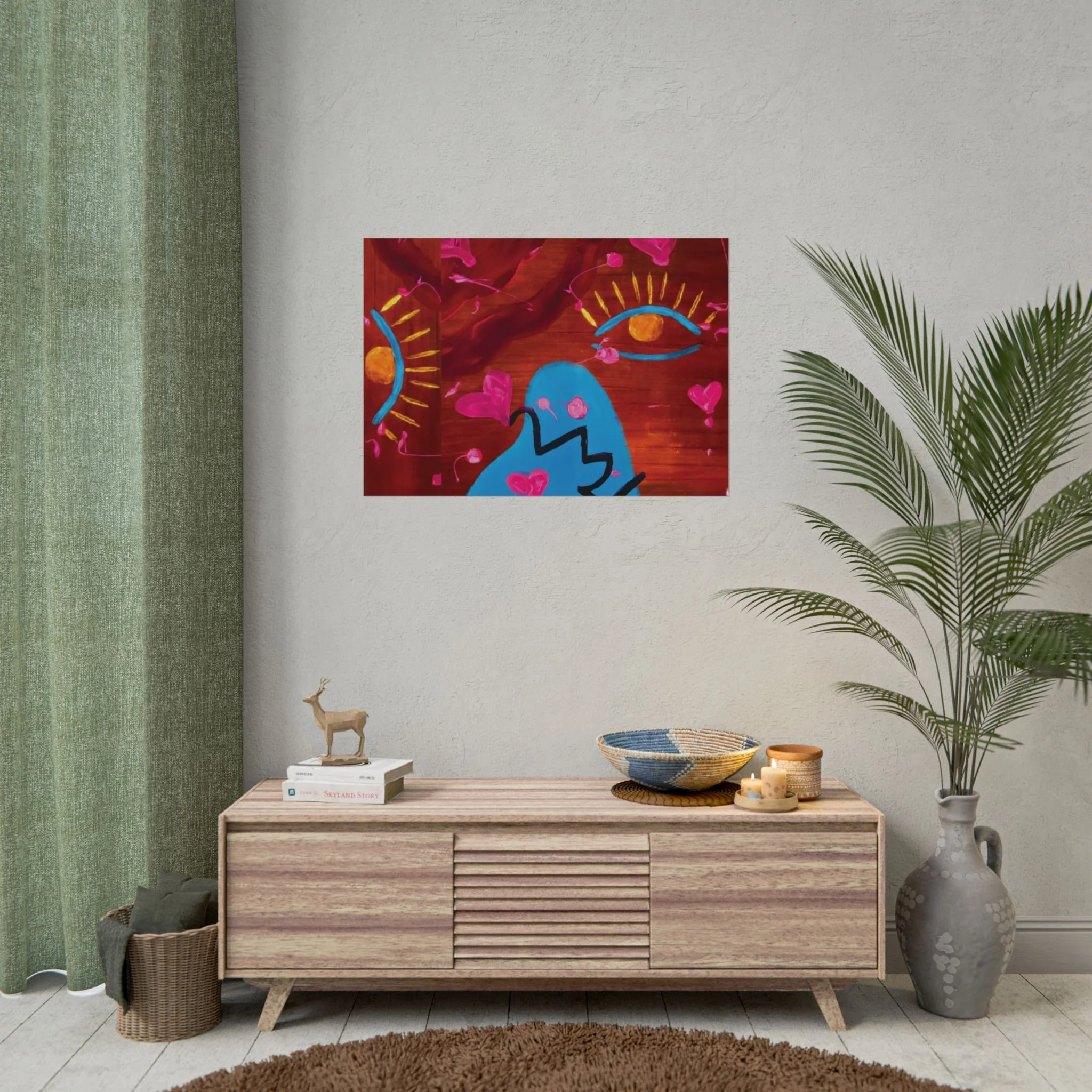 Vibrant giclée inks capture the brushy textures and saturated reds, blues, and pinks — from the radiant suns to the floating hearts — so every stroke feels alive.