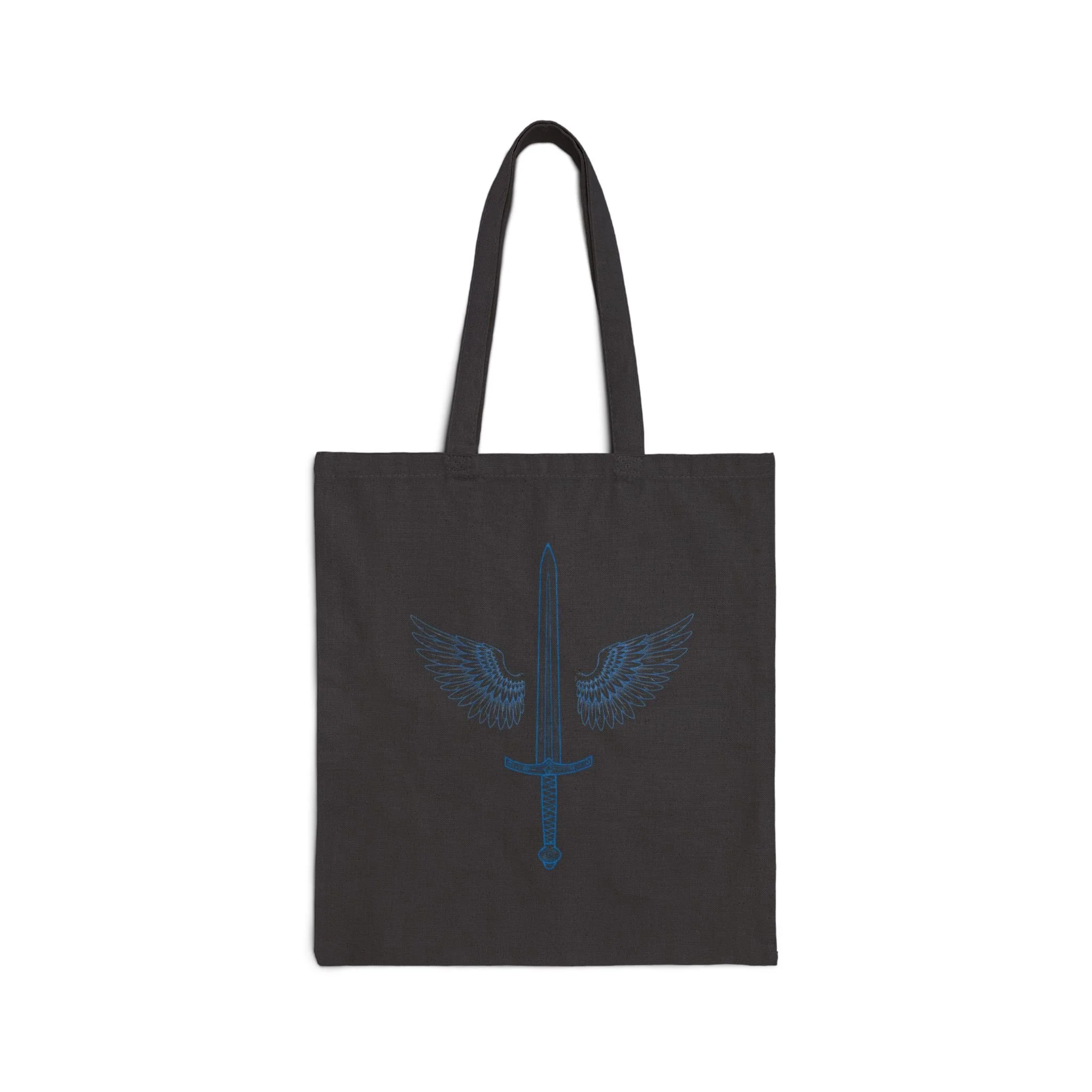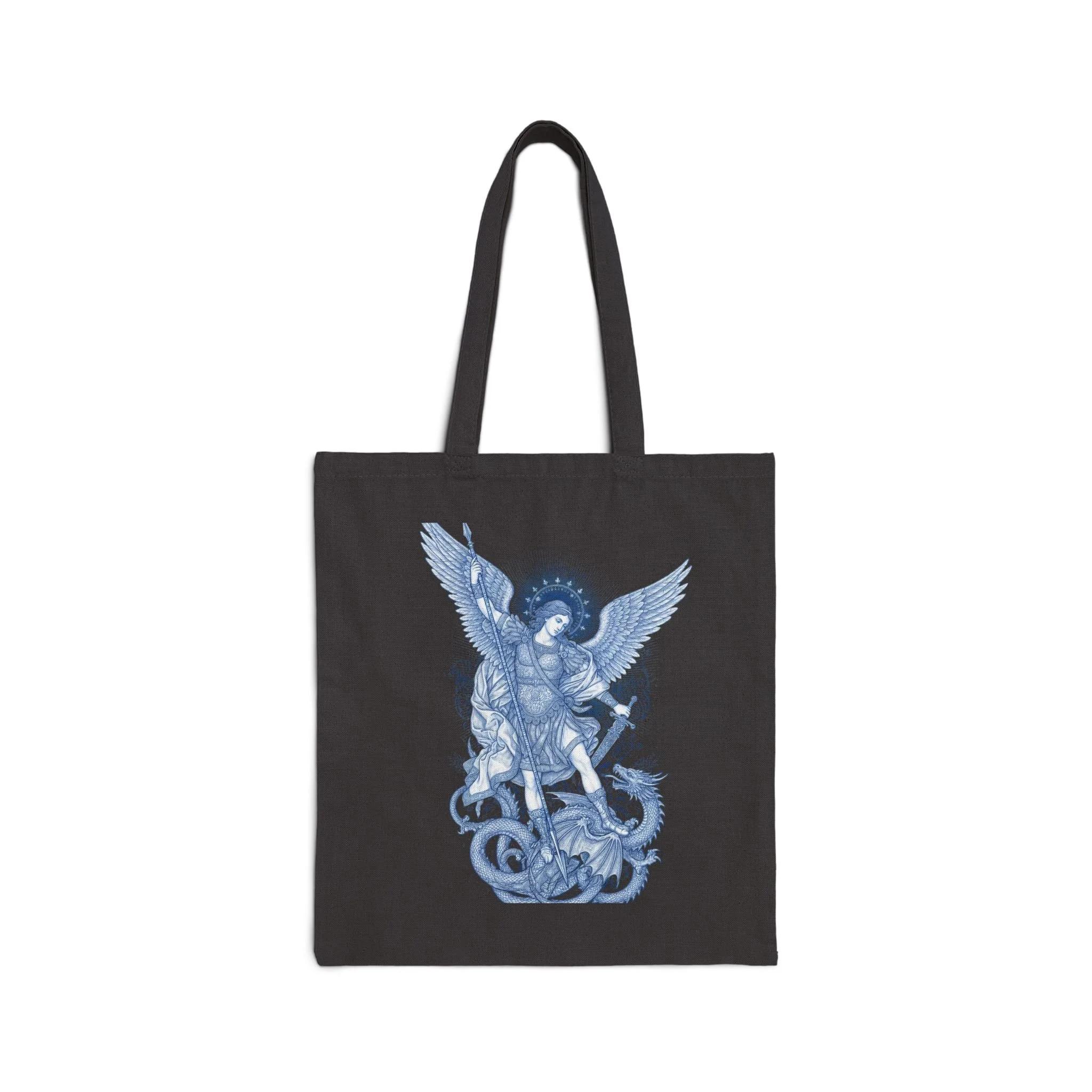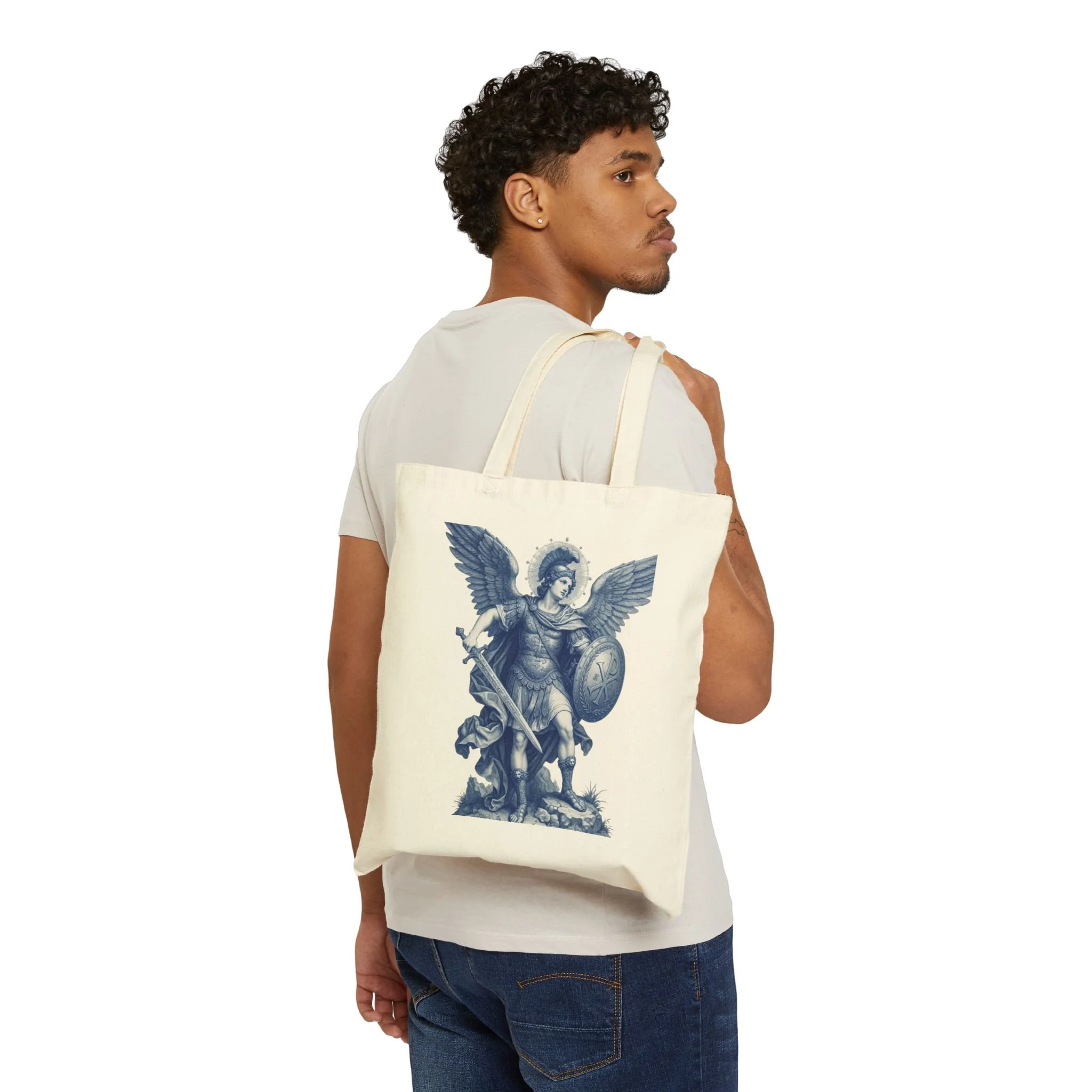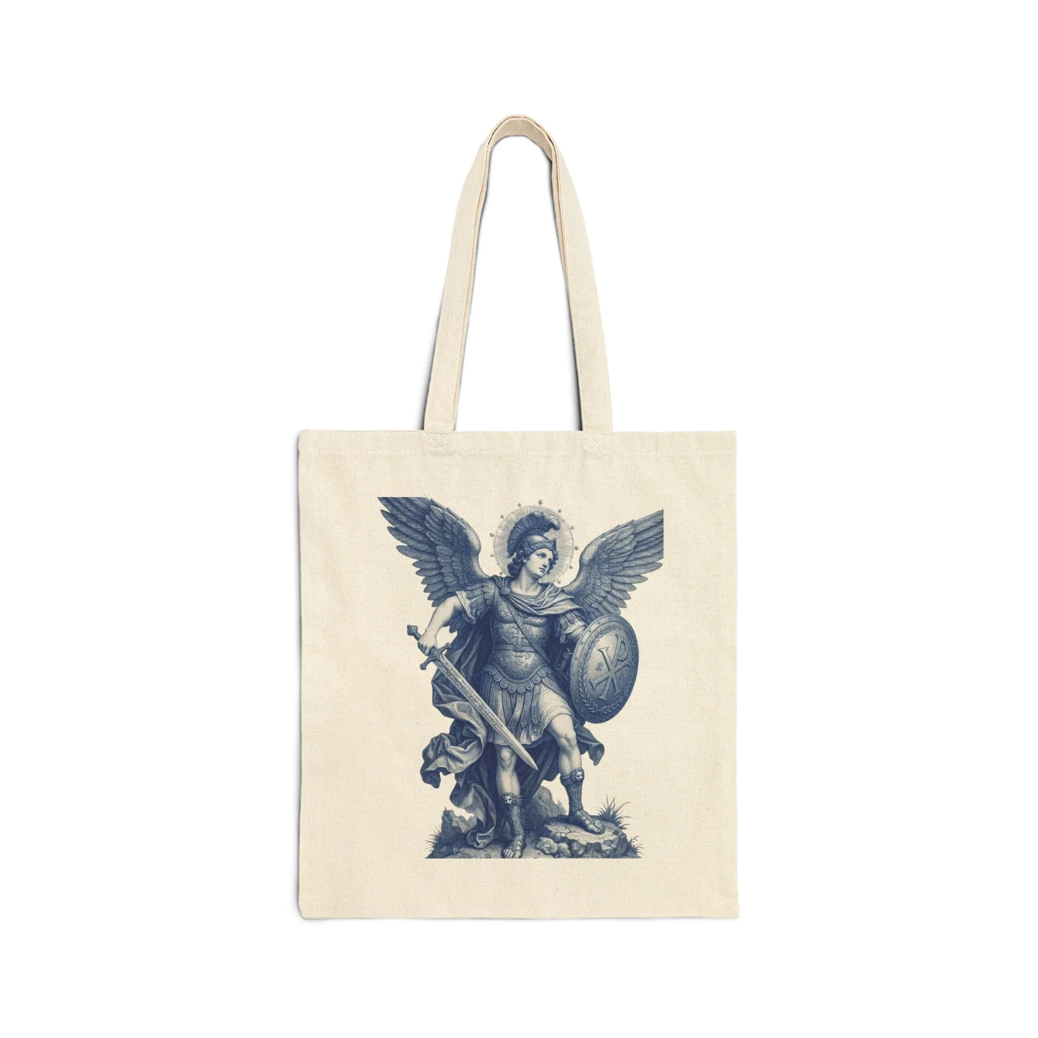 Printed on sturdy natural canvas, the front shows a vintage-styled archangel michael in motion — shield raised, wings spread — while the reverse carries a slim sword flanked by feathered wings.