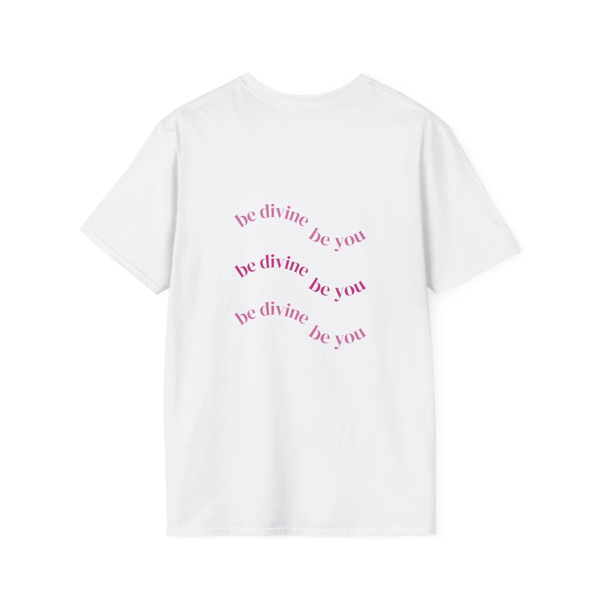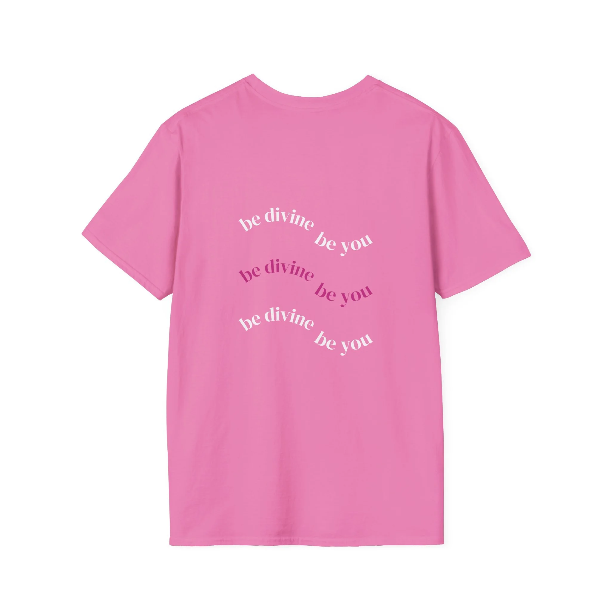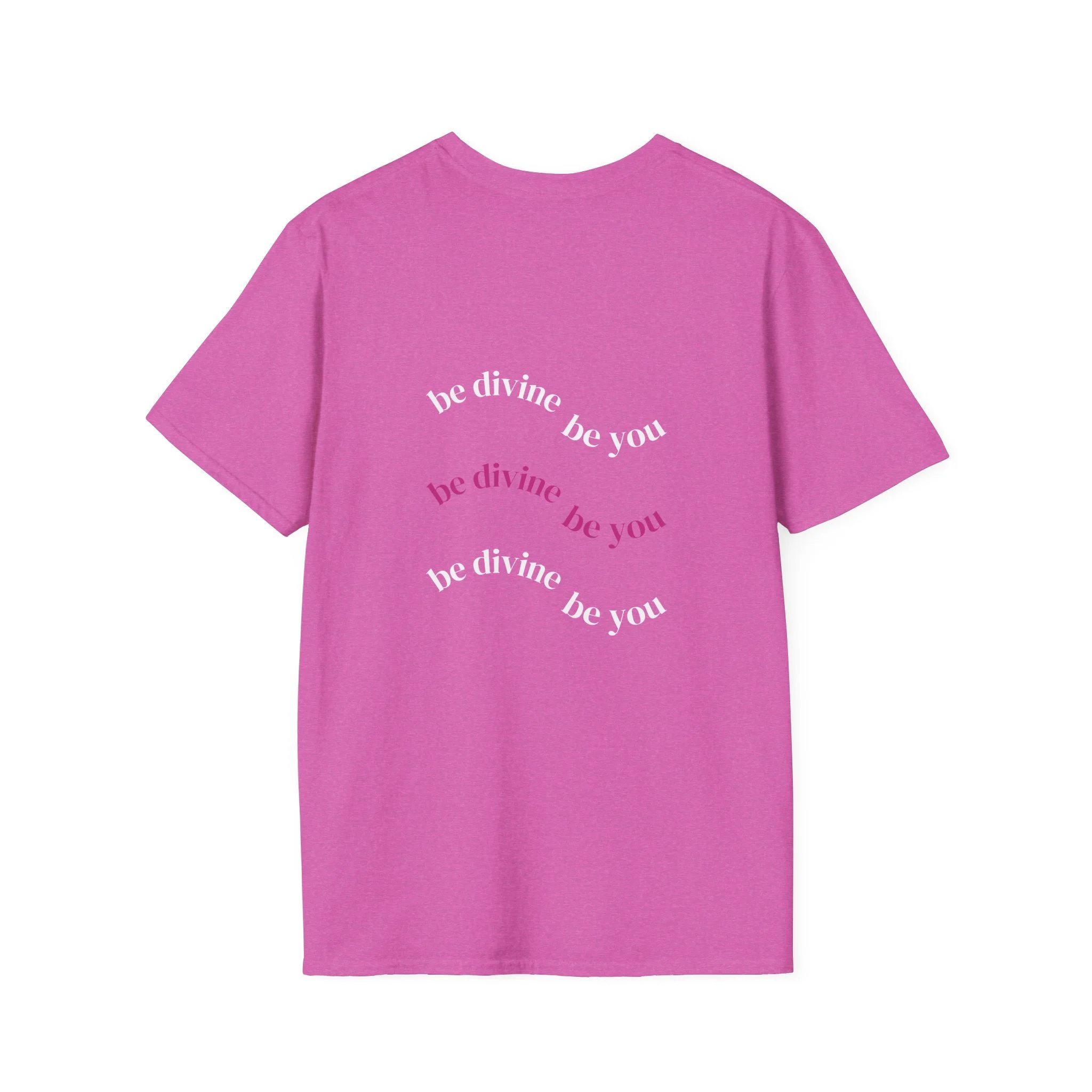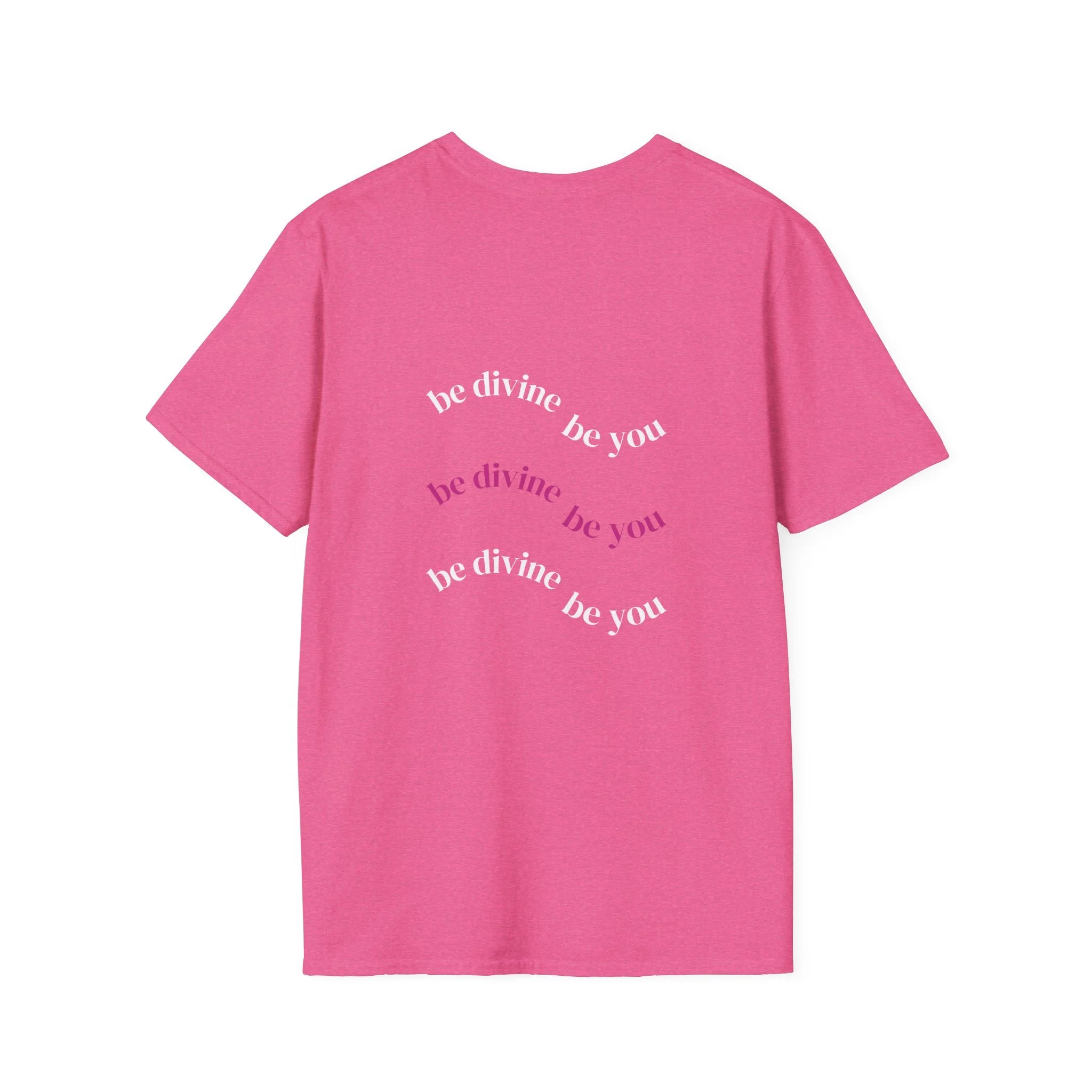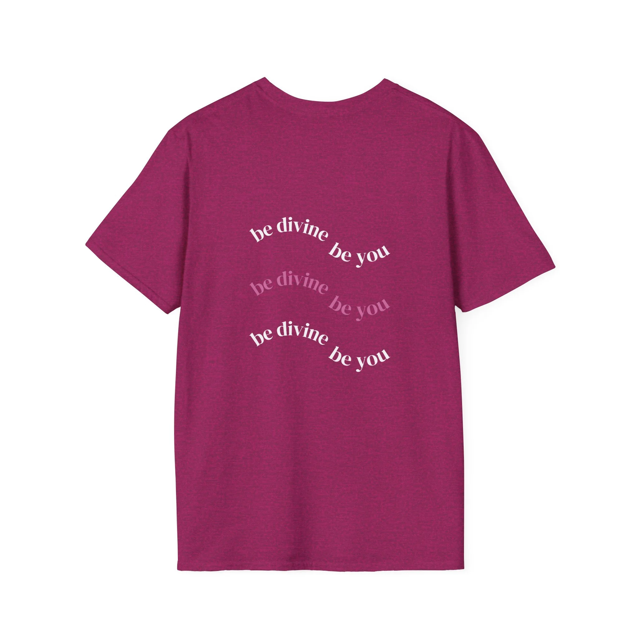 This soft cotton tee features a delicate angel illustration on the front—wings washed in watercolor-like magenta and violet tones—and a gentle mantra on the back reading “be divine be you” arranged in a calming wave.