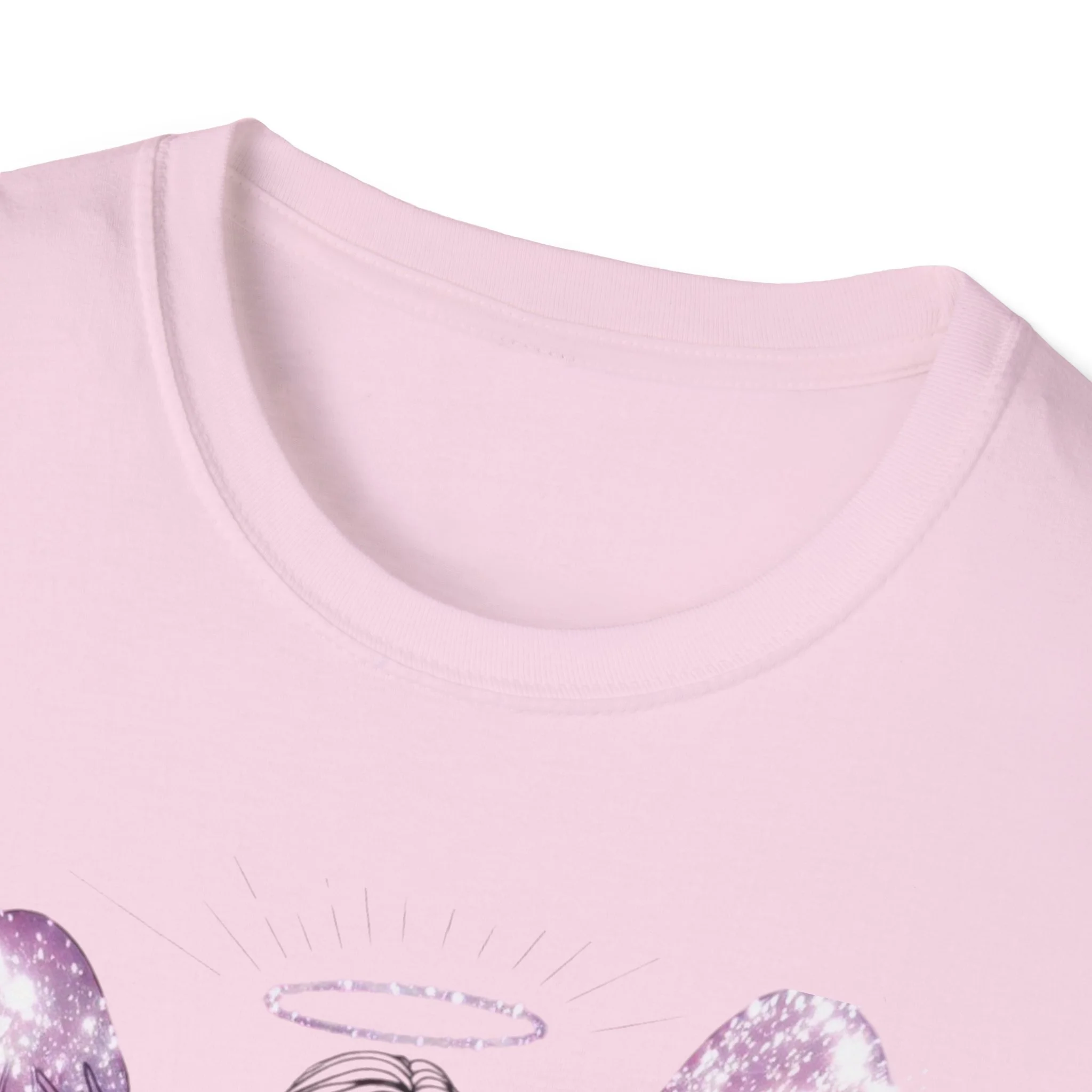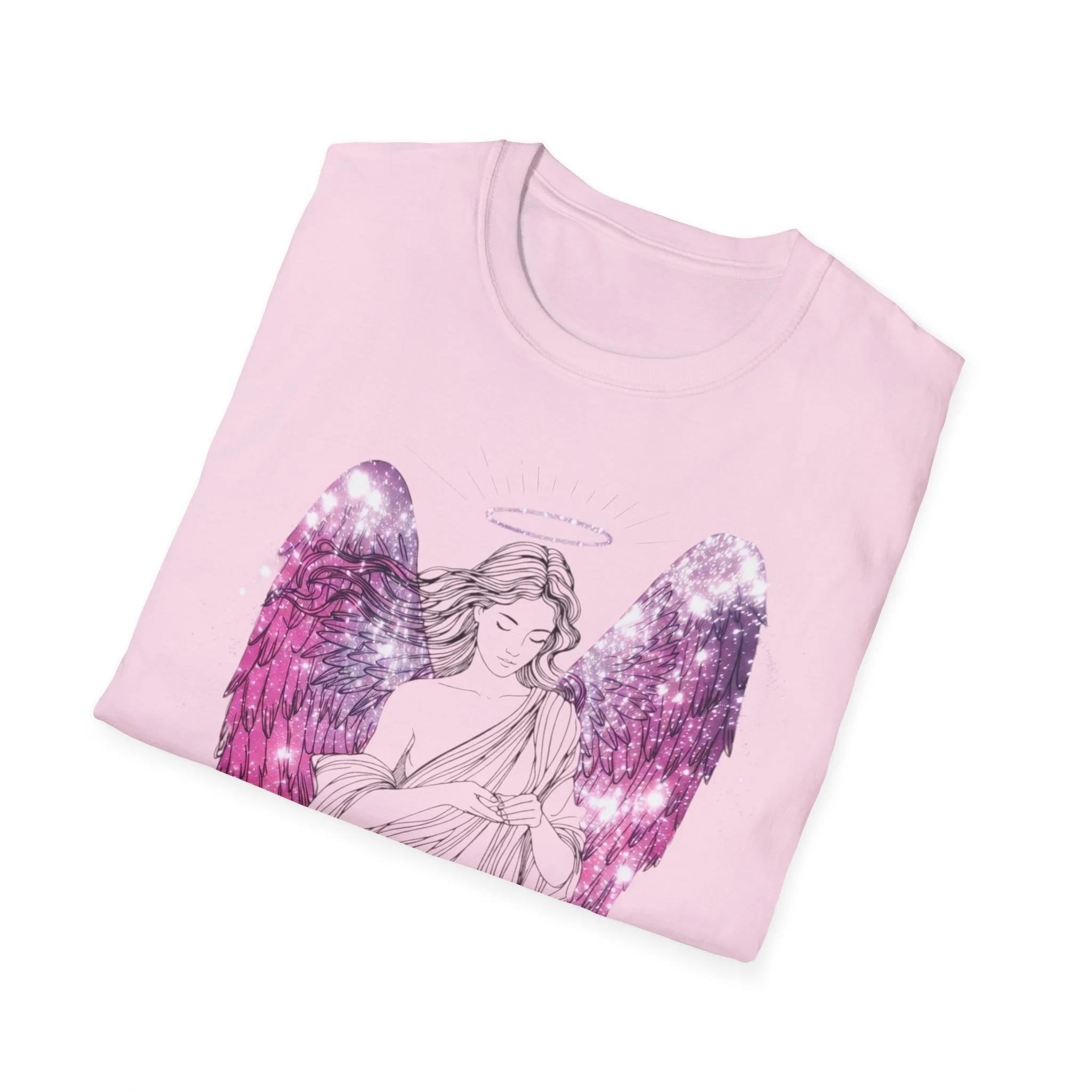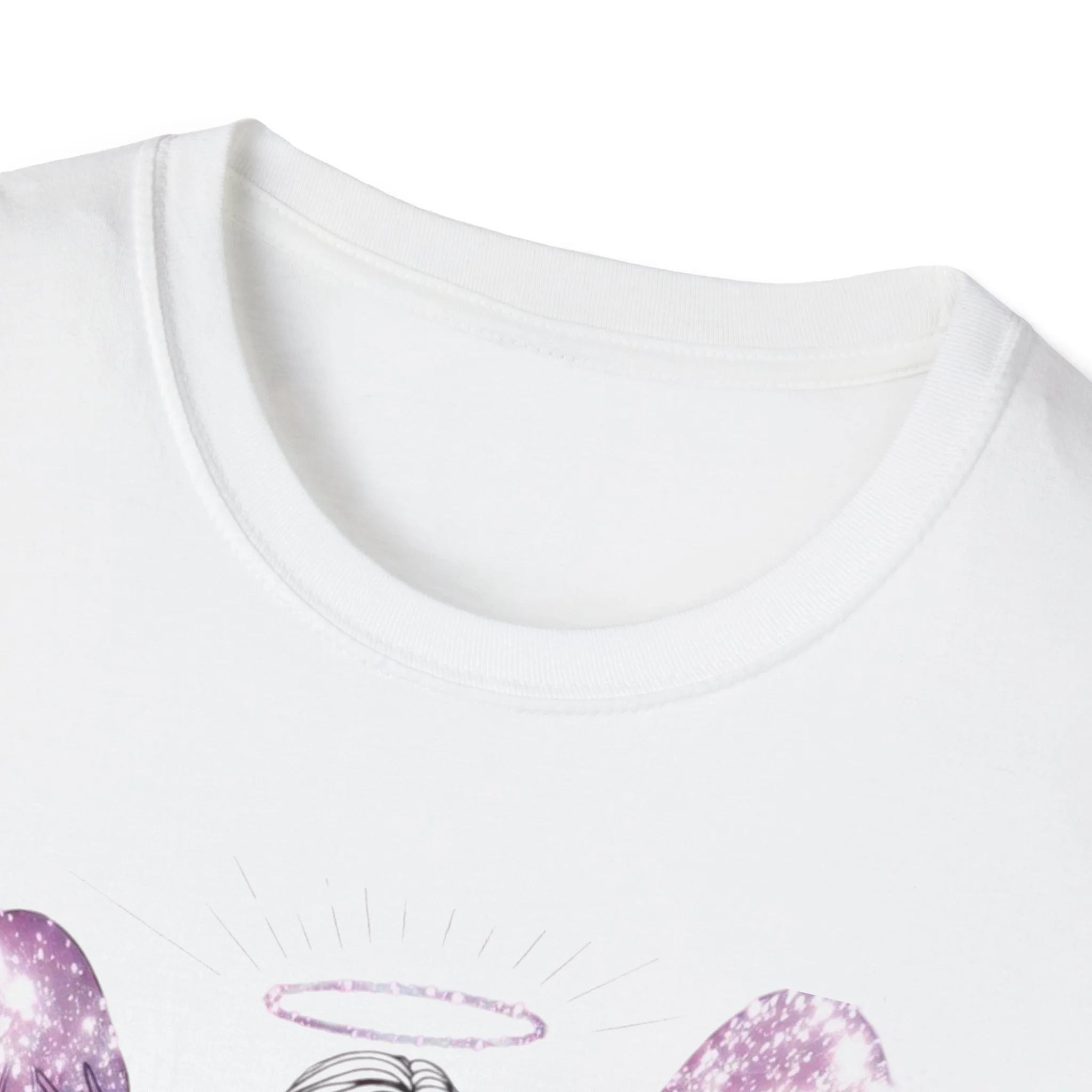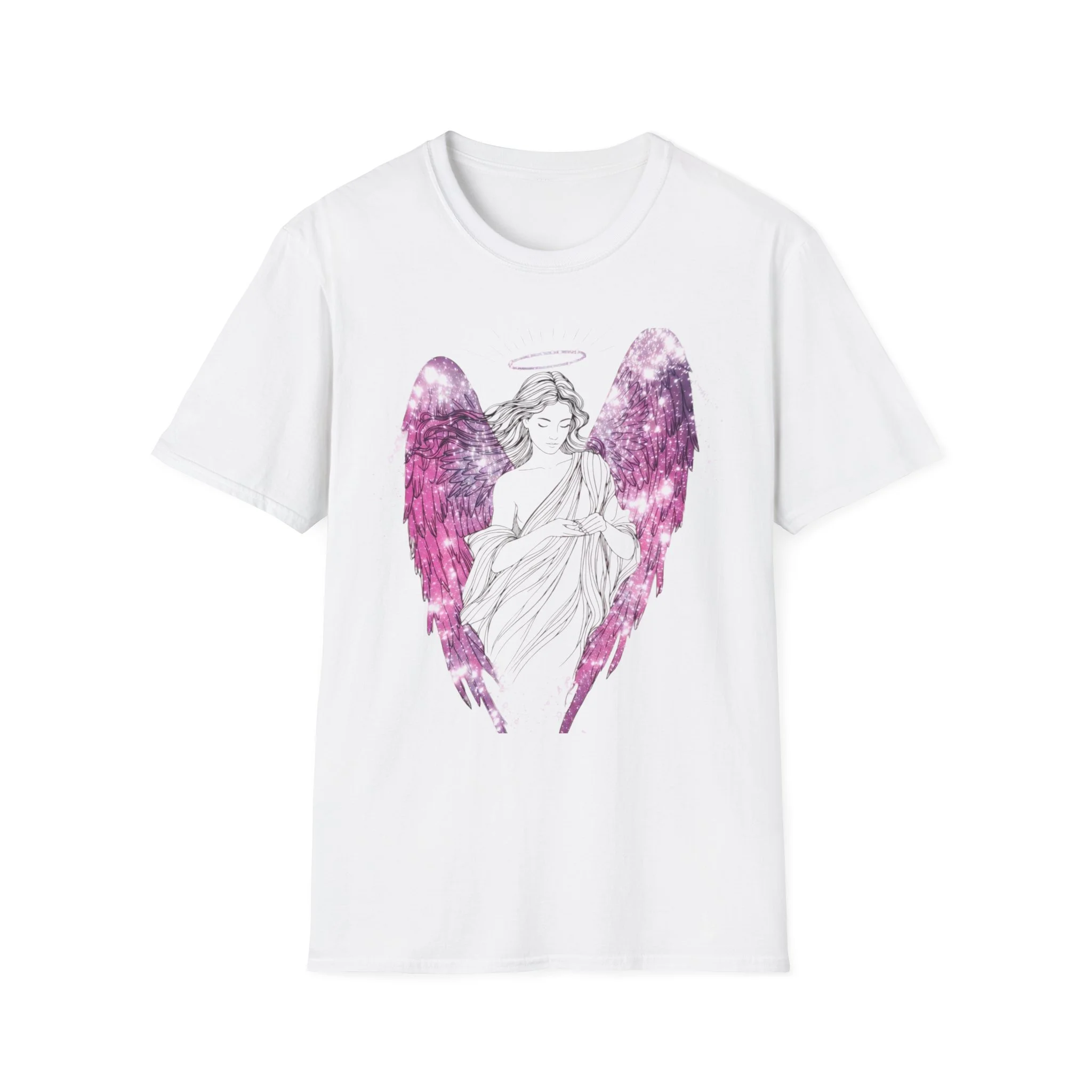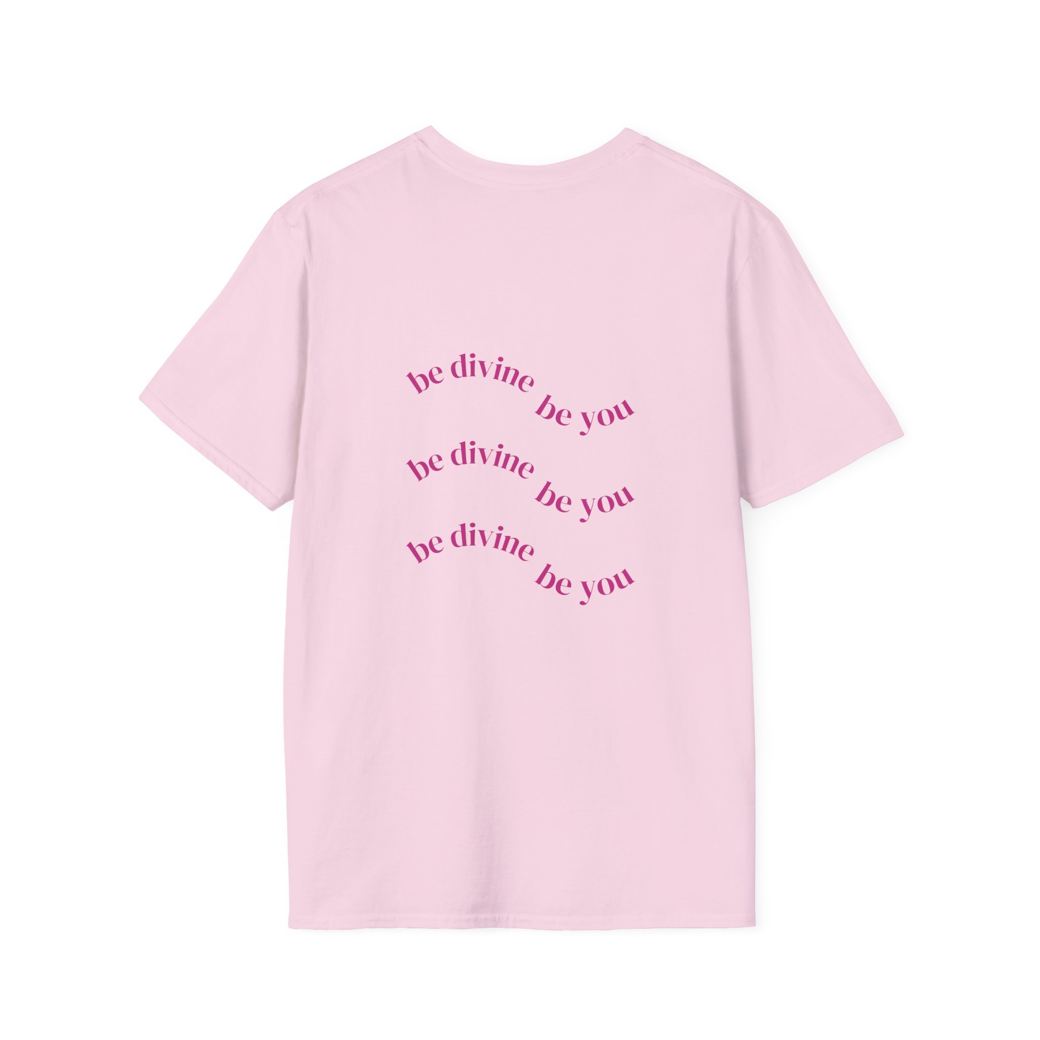 This soft cotton tee features a delicate angel illustration on the front—wings washed in watercolor-like magenta and violet tones—and a gentle mantra on the back reading “be divine be you” arranged in a calming wave.
