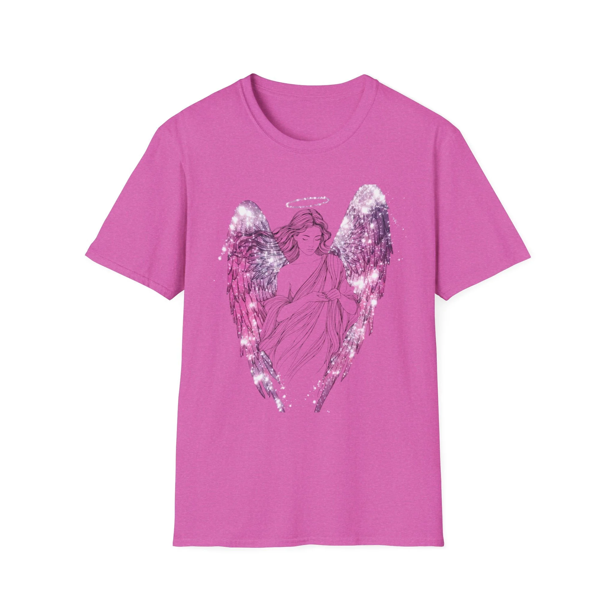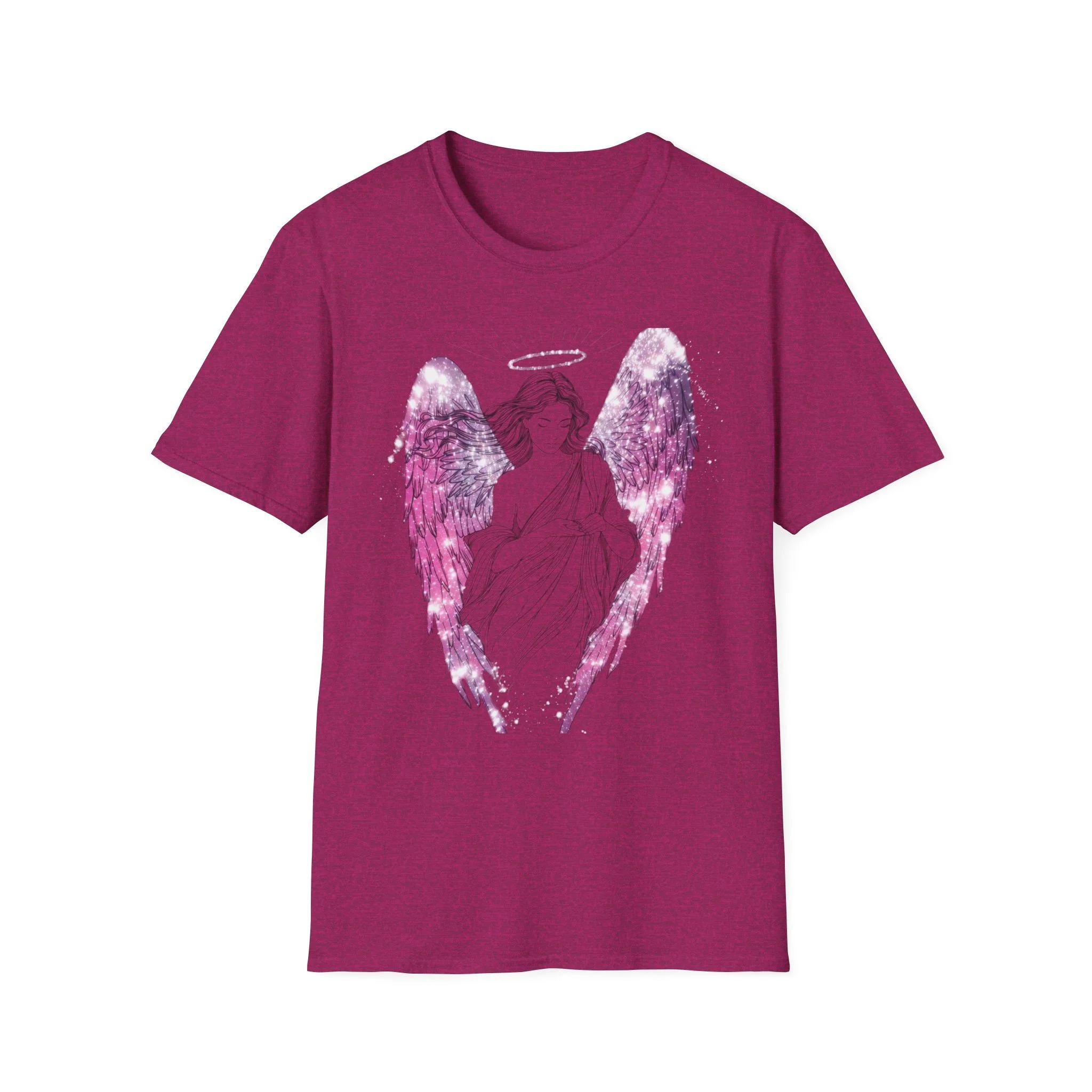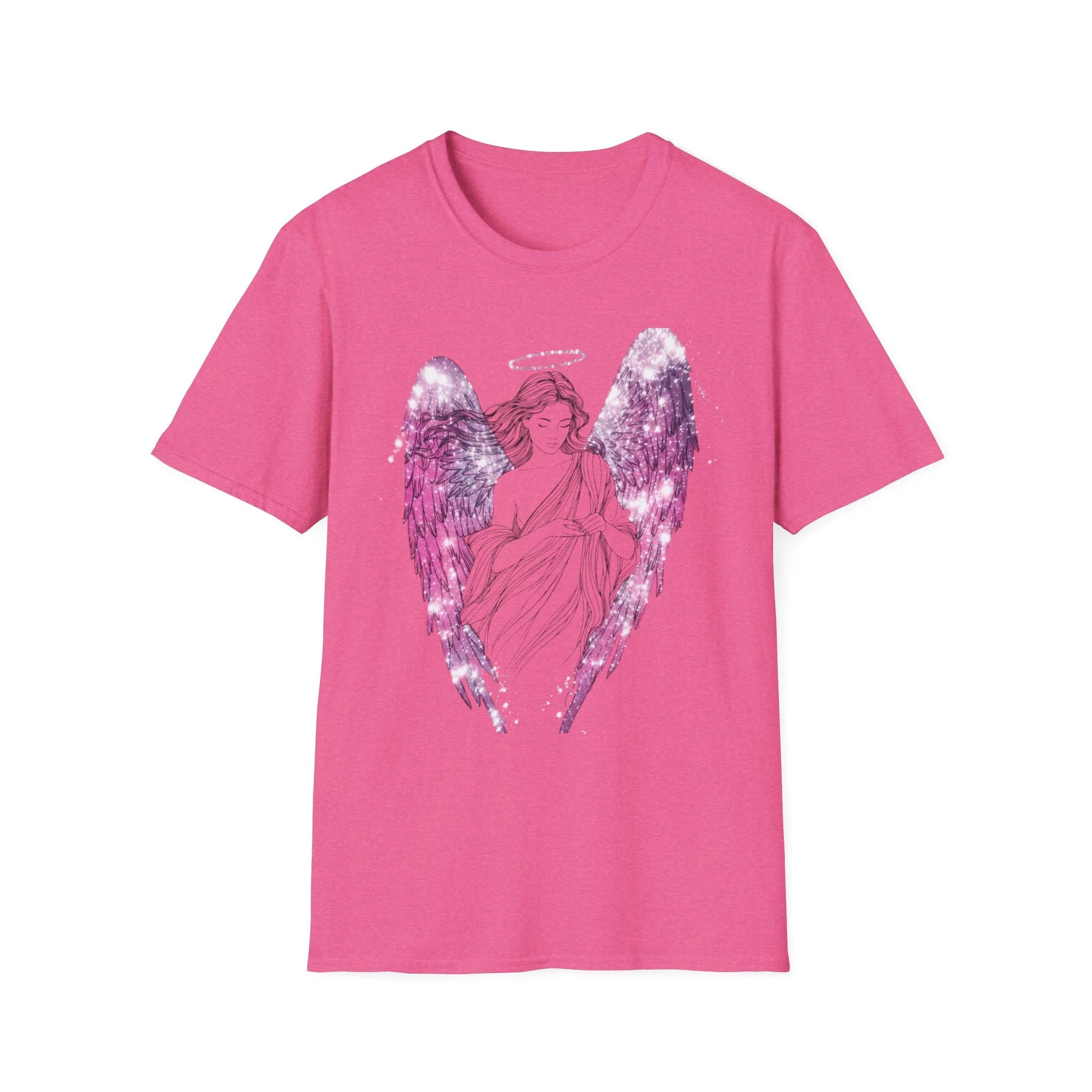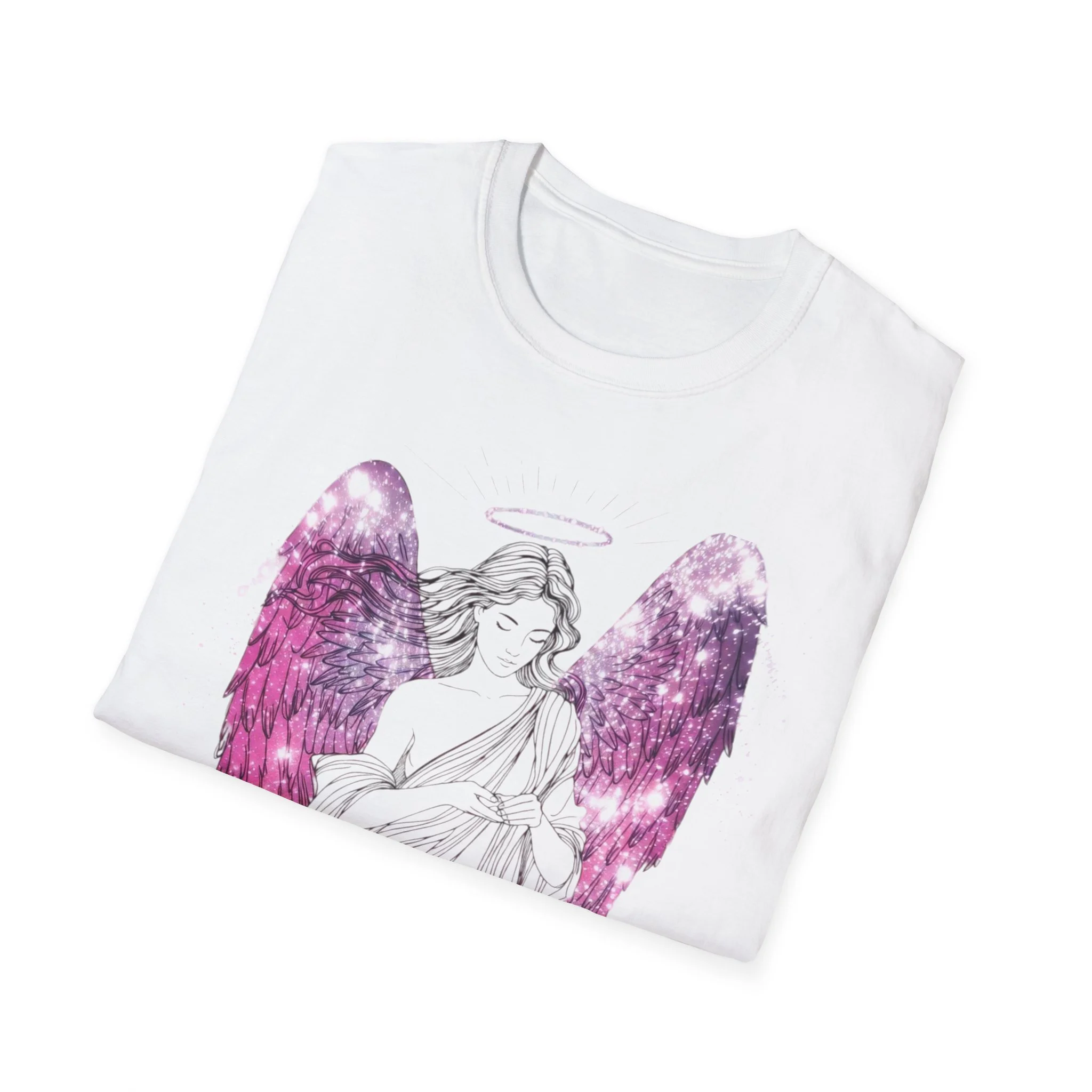 This soft cotton tee features a delicate angel illustration on the front—wings washed in watercolor-like magenta and violet tones—and a gentle mantra on the back reading “be divine be you” arranged in a calming wave.
