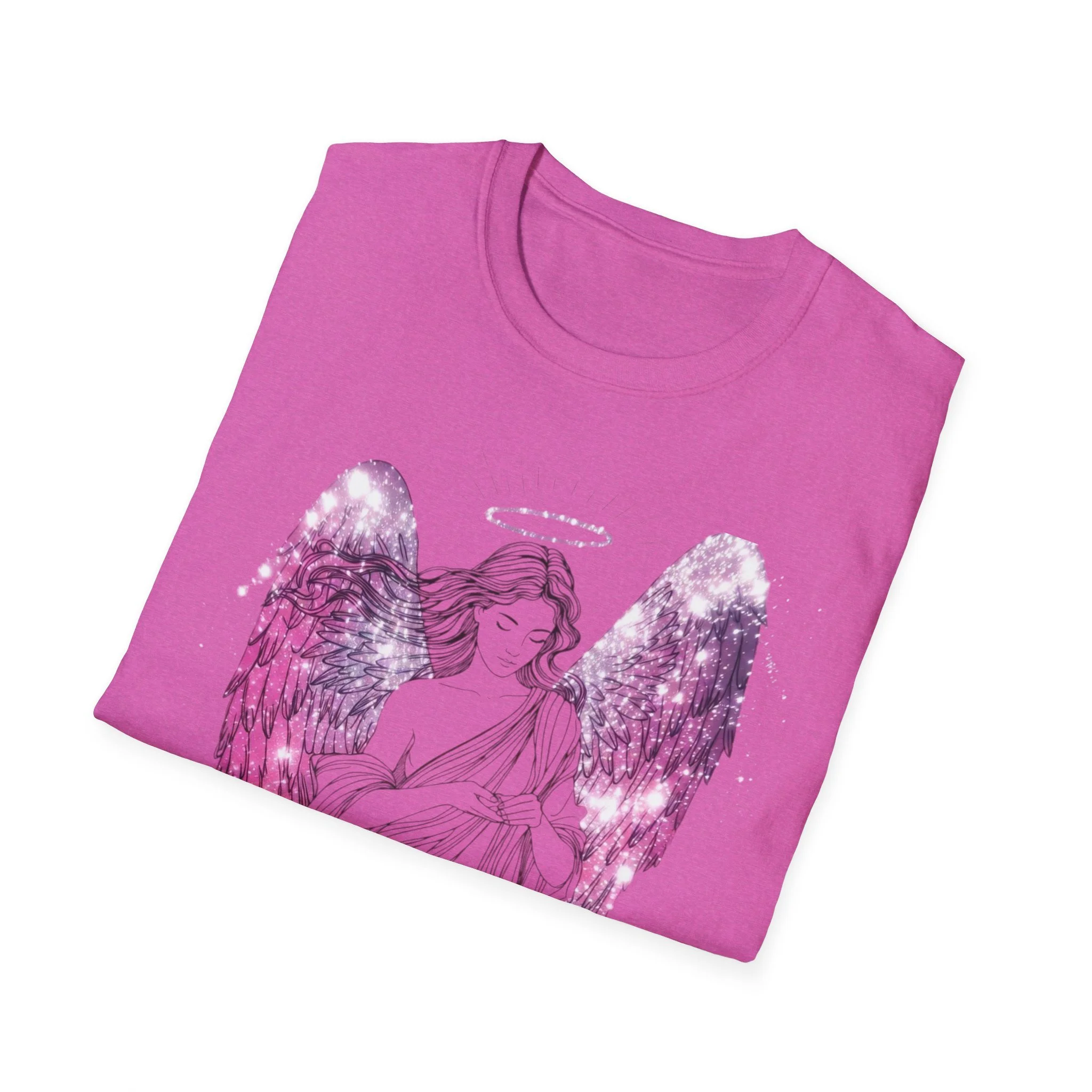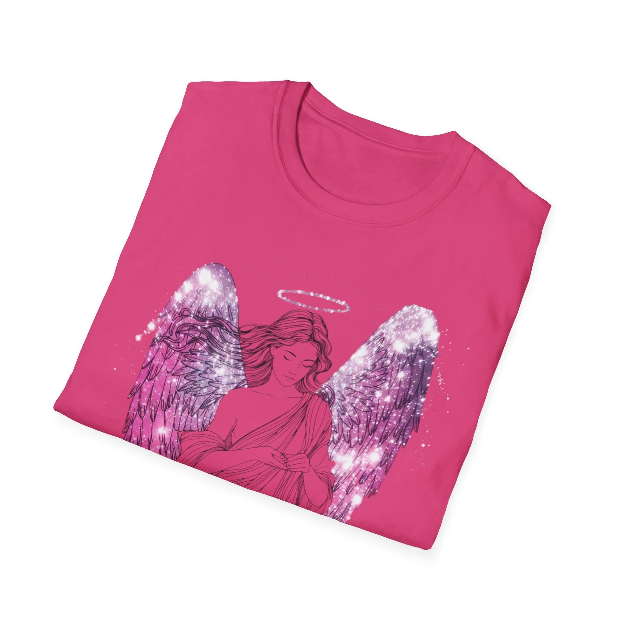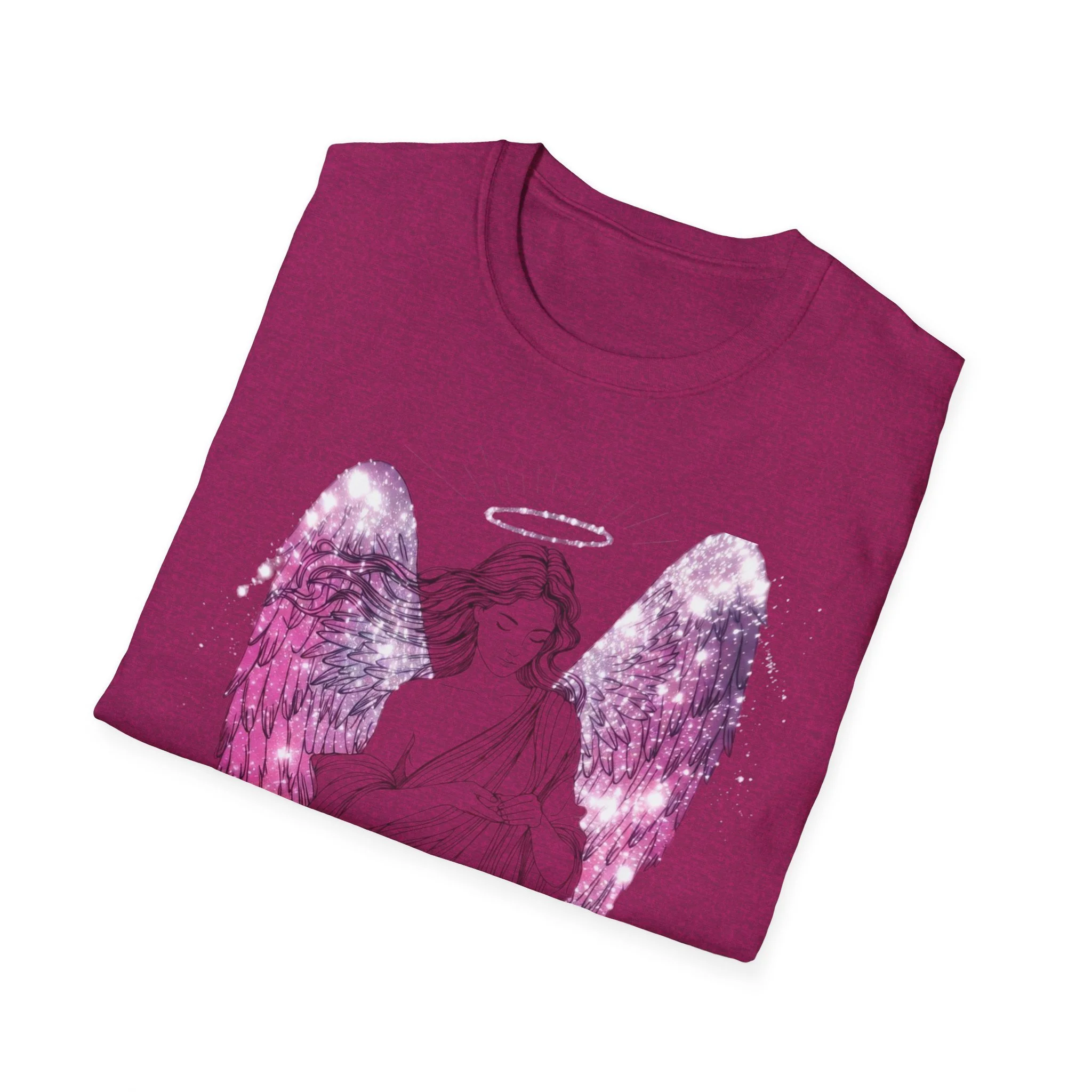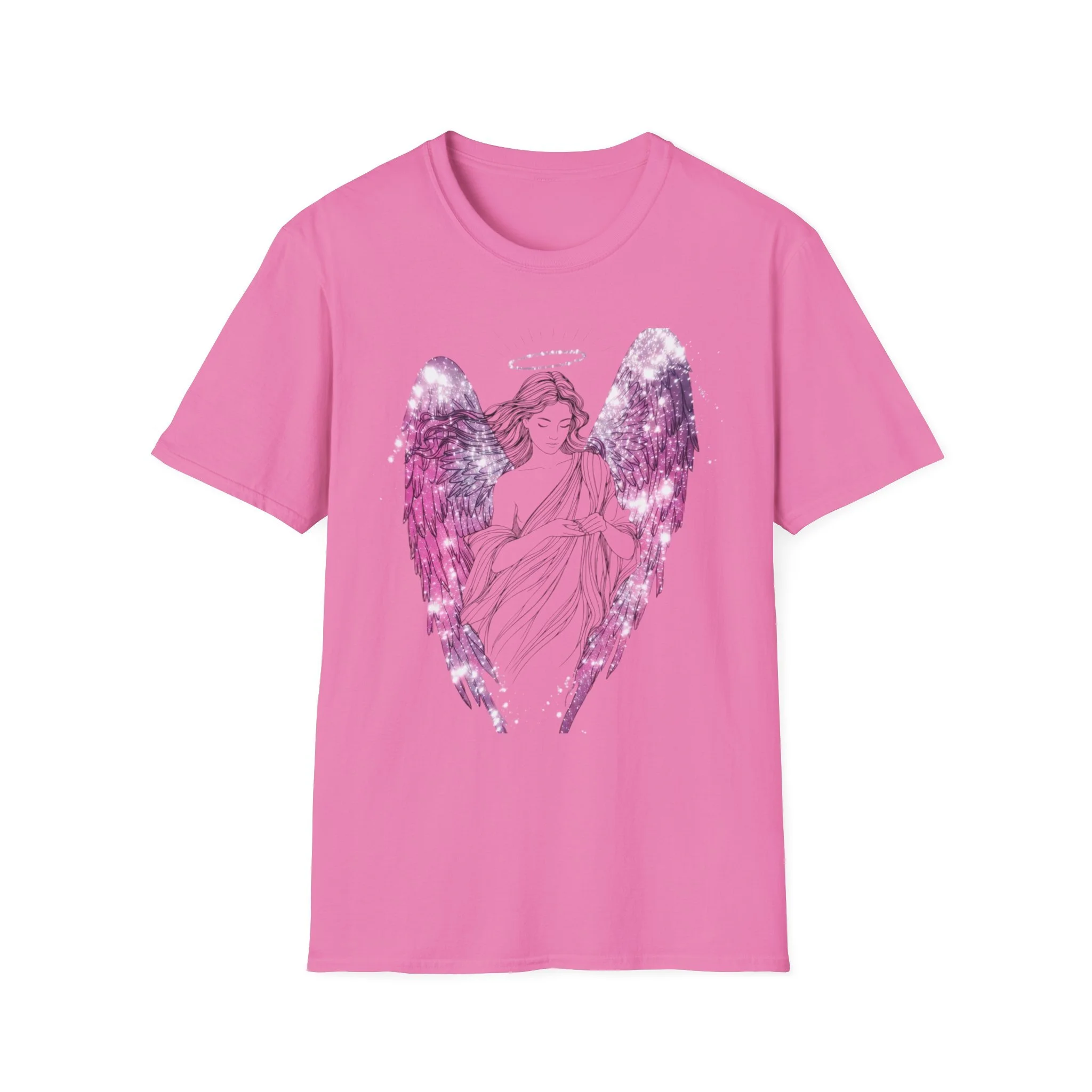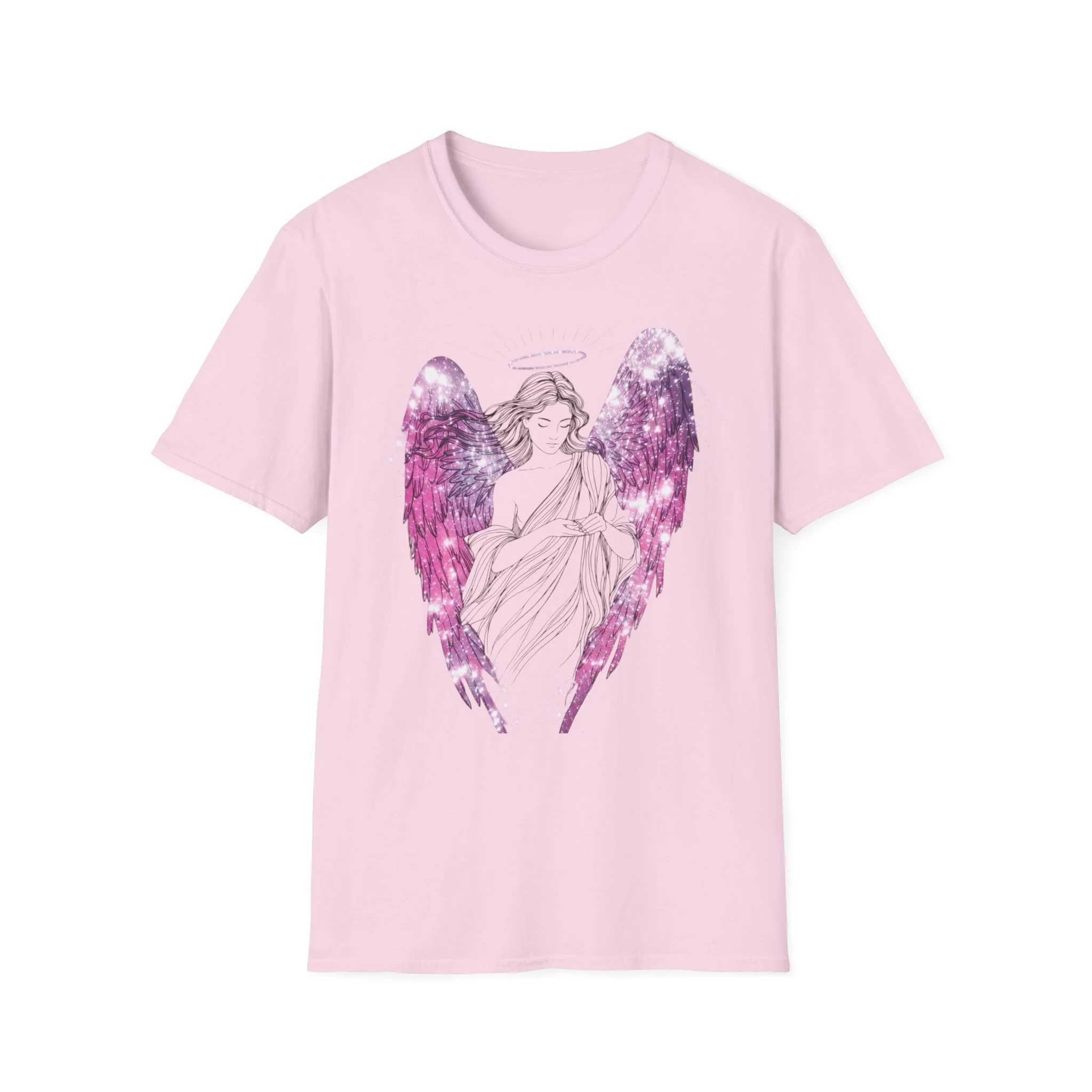 This soft cotton tee features a delicate angel illustration on the front—wings washed in watercolor-like magenta and violet tones—and a gentle mantra on the back reading “be divine be you” arranged in a calming wave.