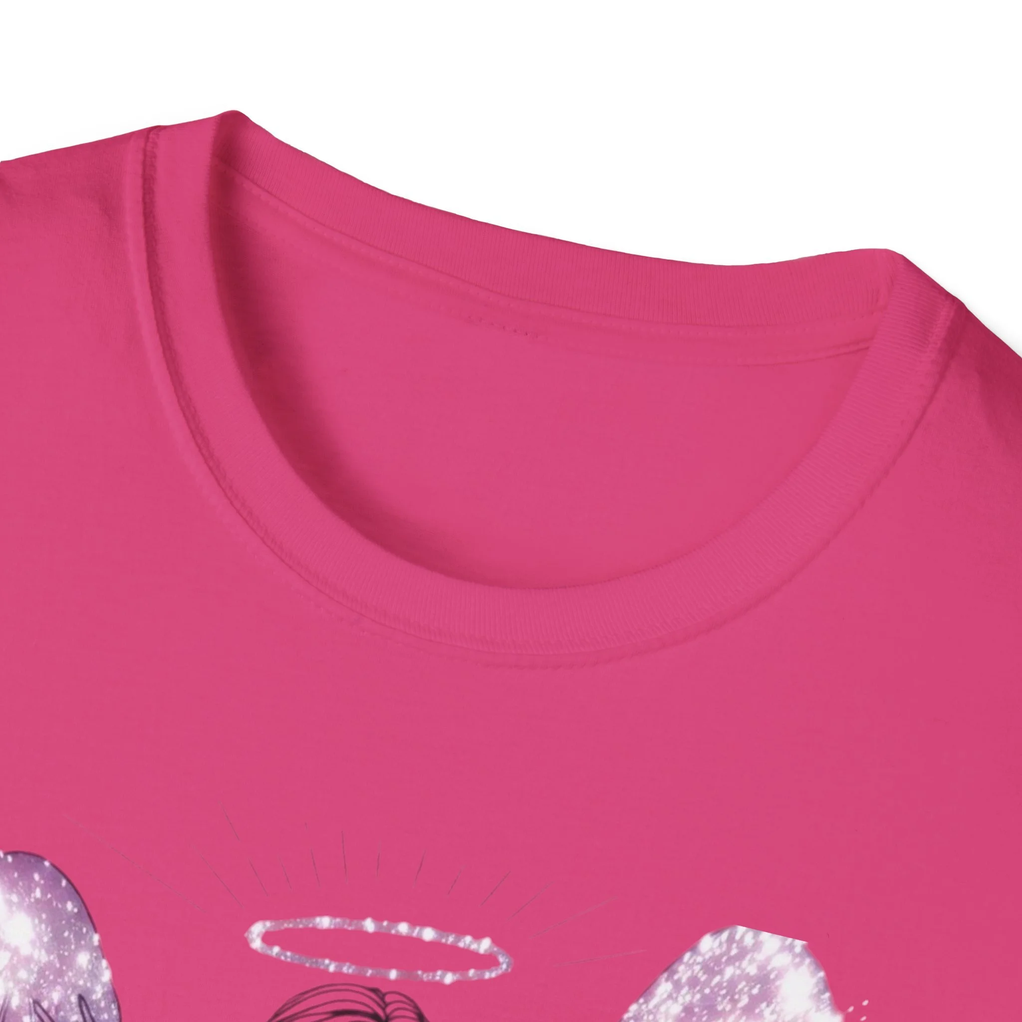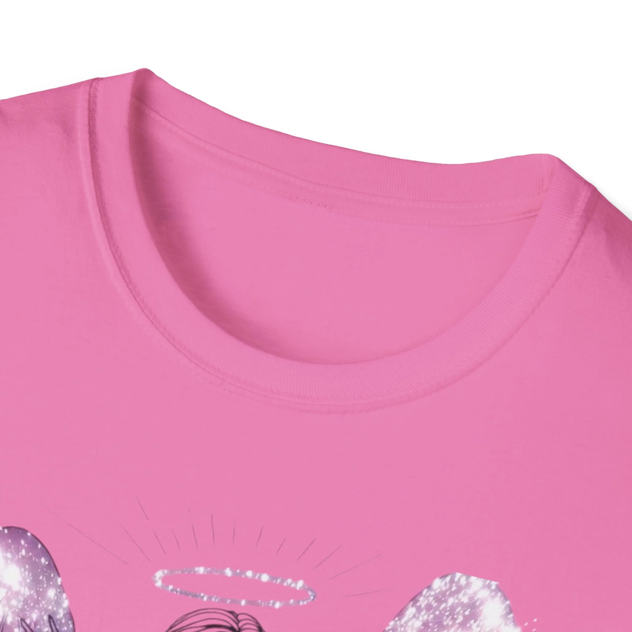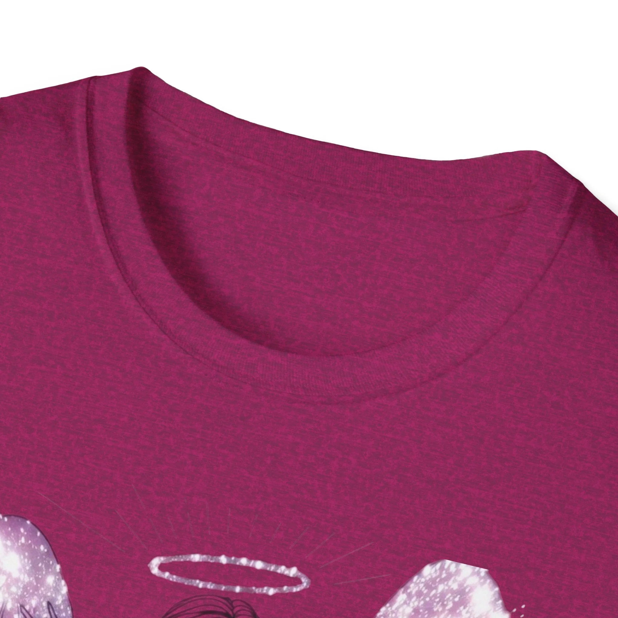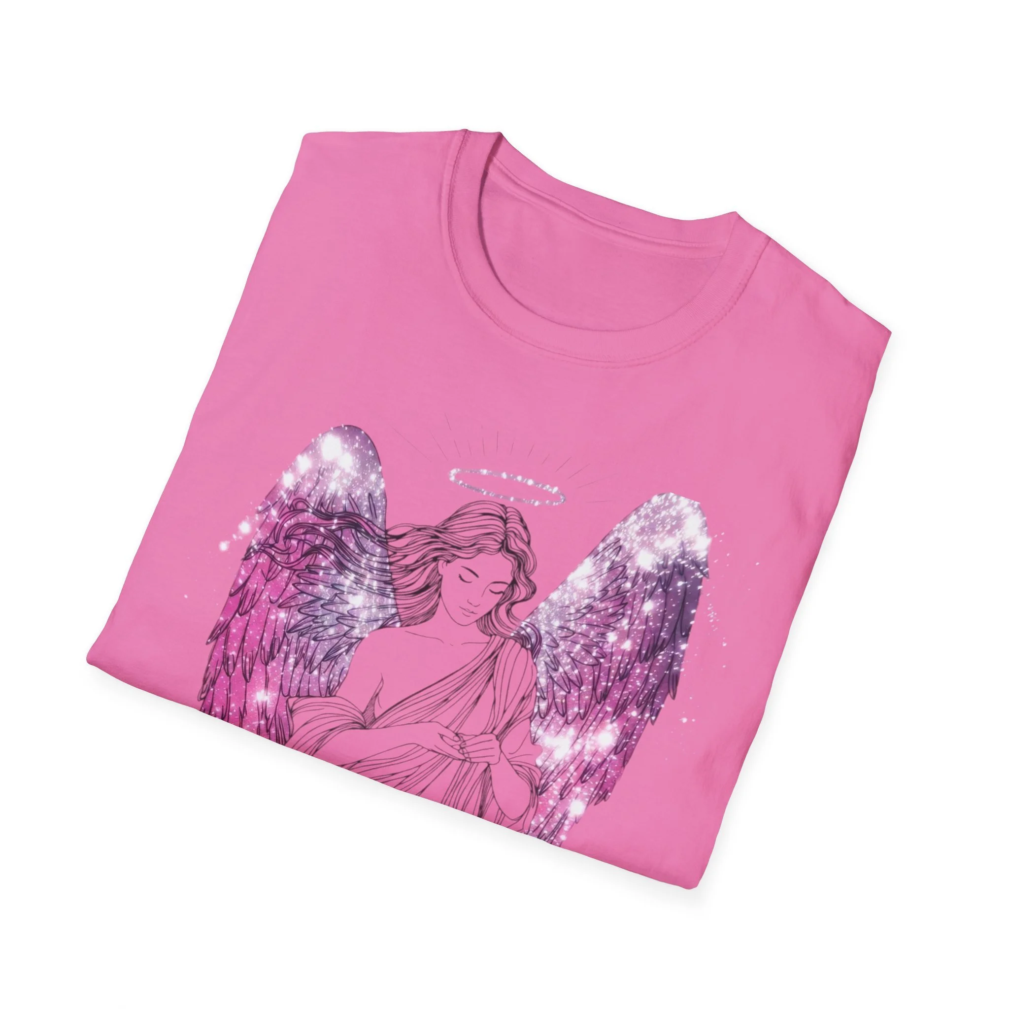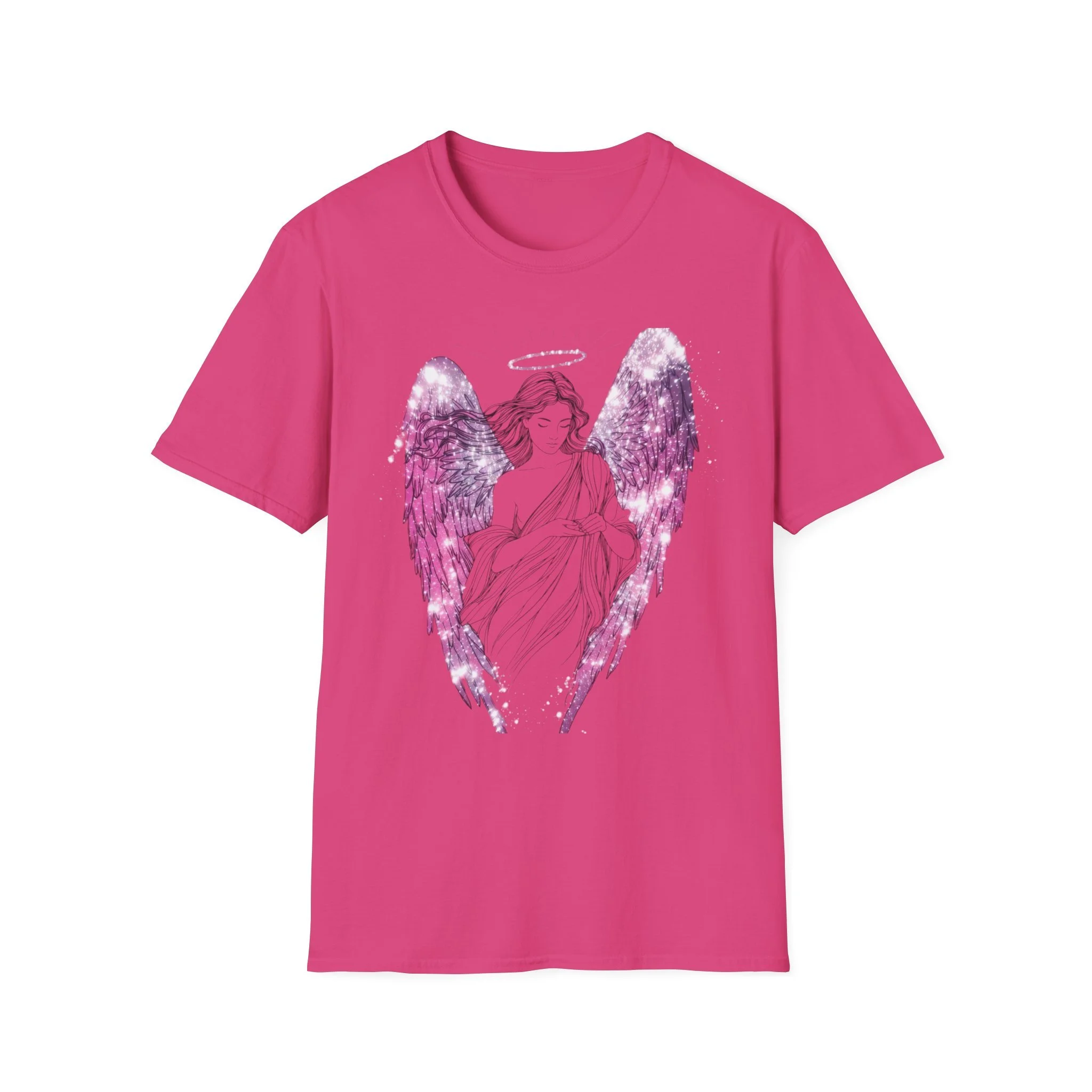 This soft cotton tee features a delicate angel illustration on the front—wings washed in watercolor-like magenta and violet tones—and a gentle mantra on the back reading “be divine be you” arranged in a calming wave.