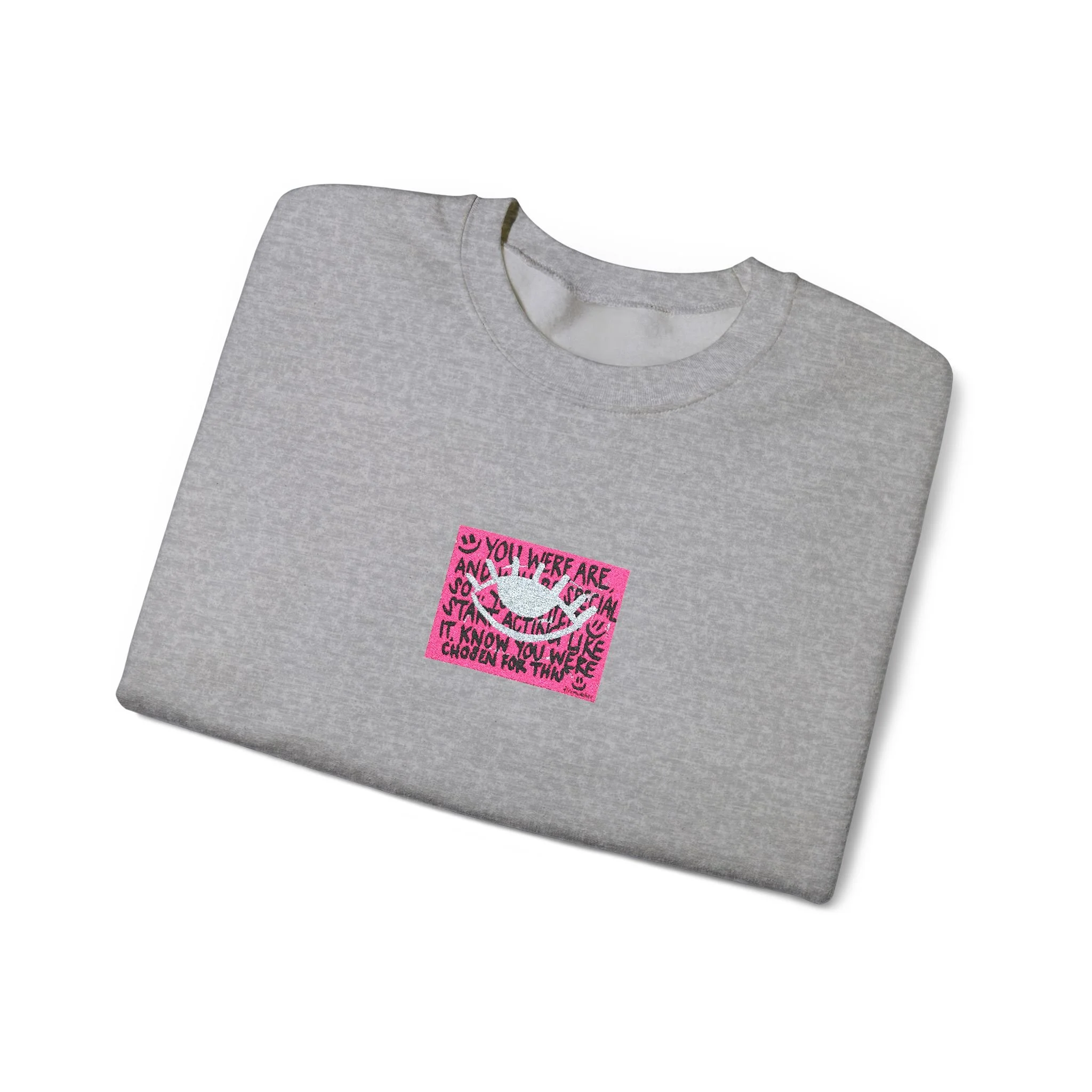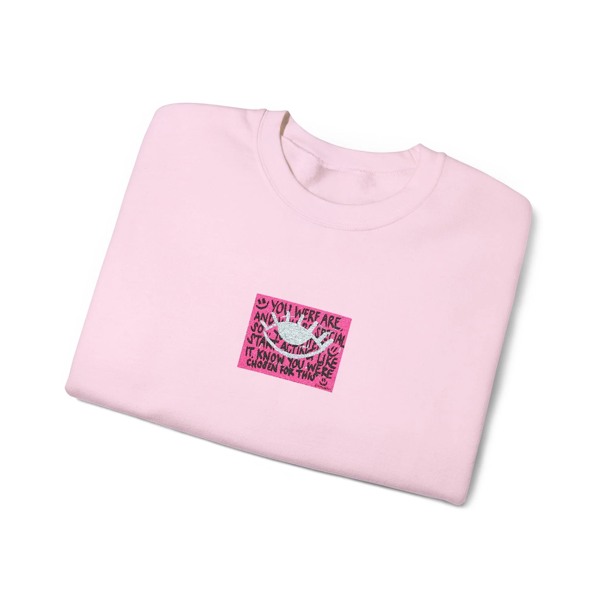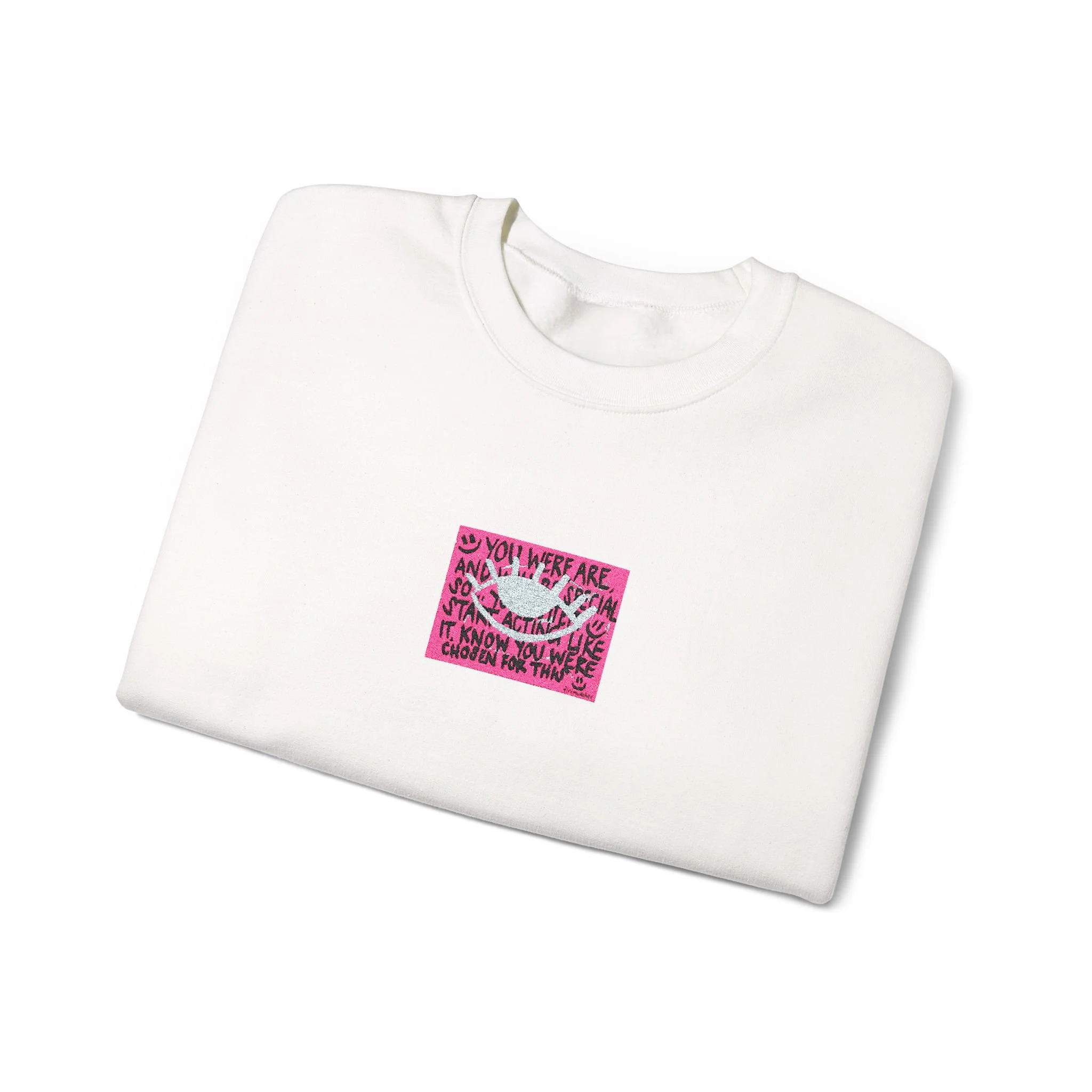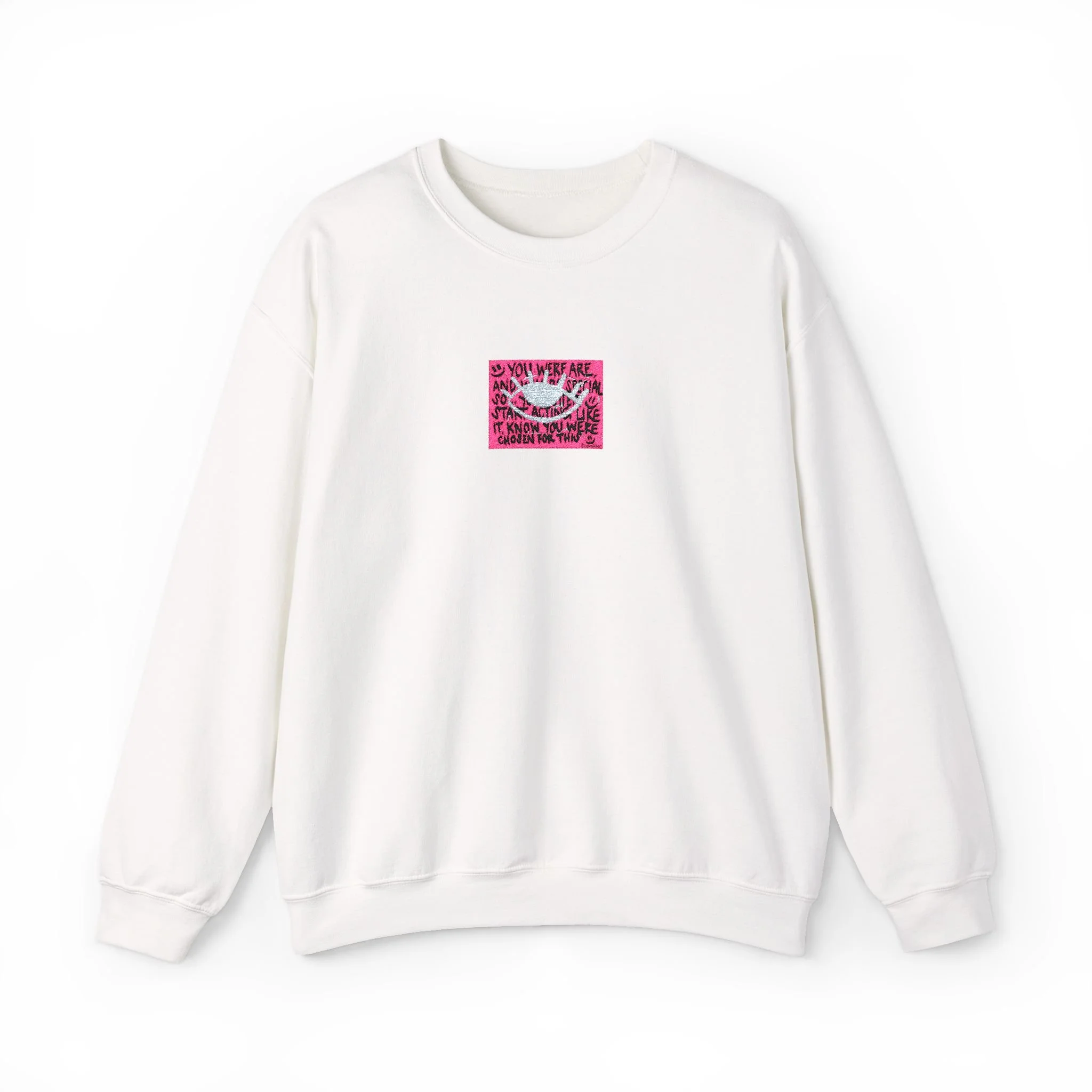 The white sweatshirt features a small, centered sequin-like graphic in bright pink that catches the eye without shouting.