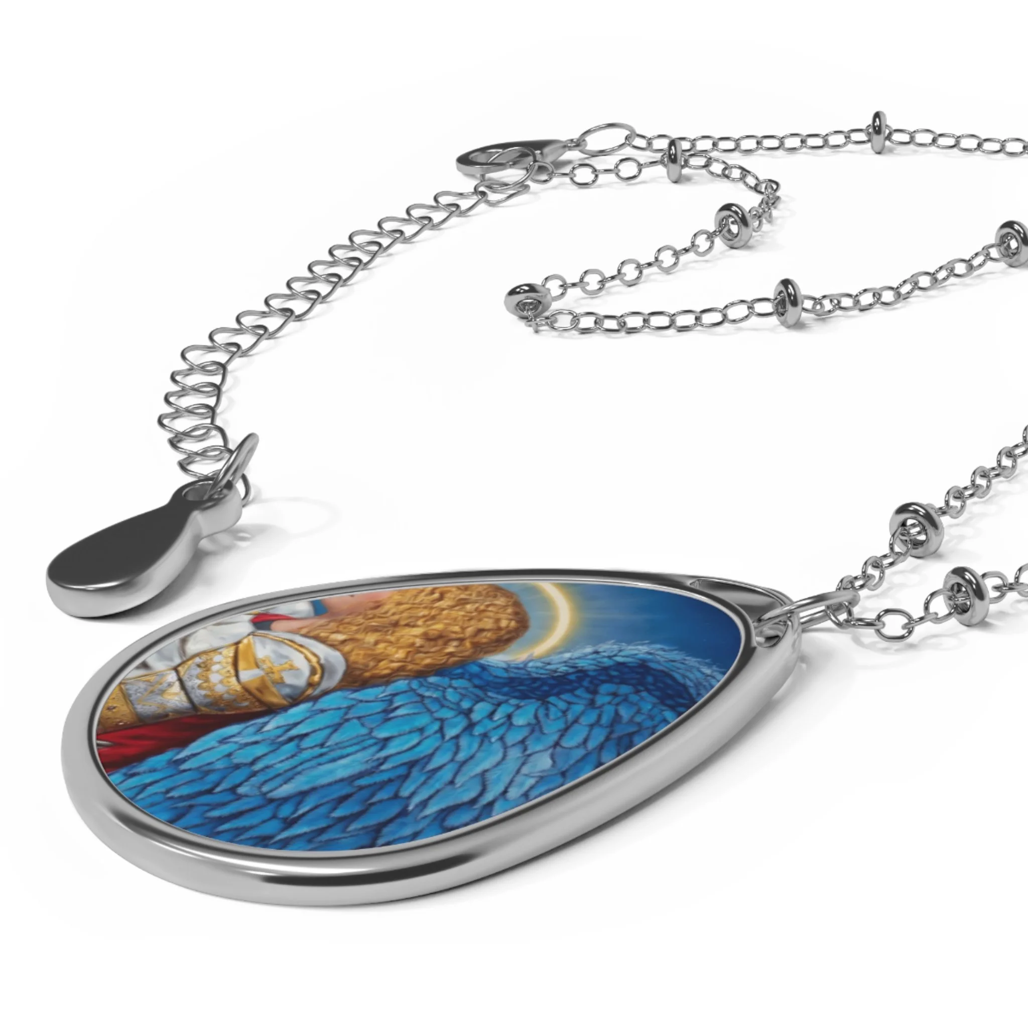 This delicate ellipse pendant necklace carries a small, wearable world — bright, glossy artwork sealed on a white aluminum surface and set into a polished zinc-alloy frame.