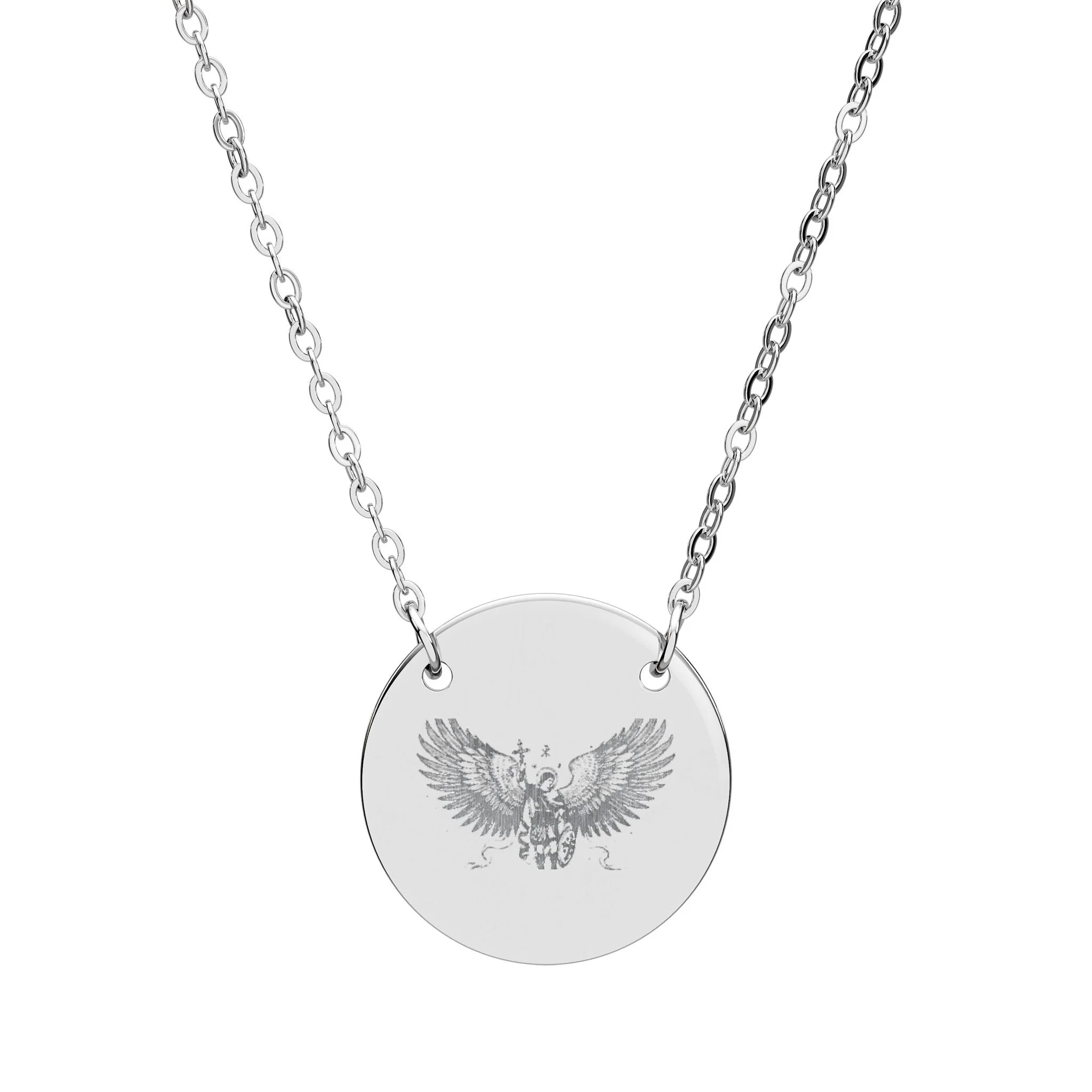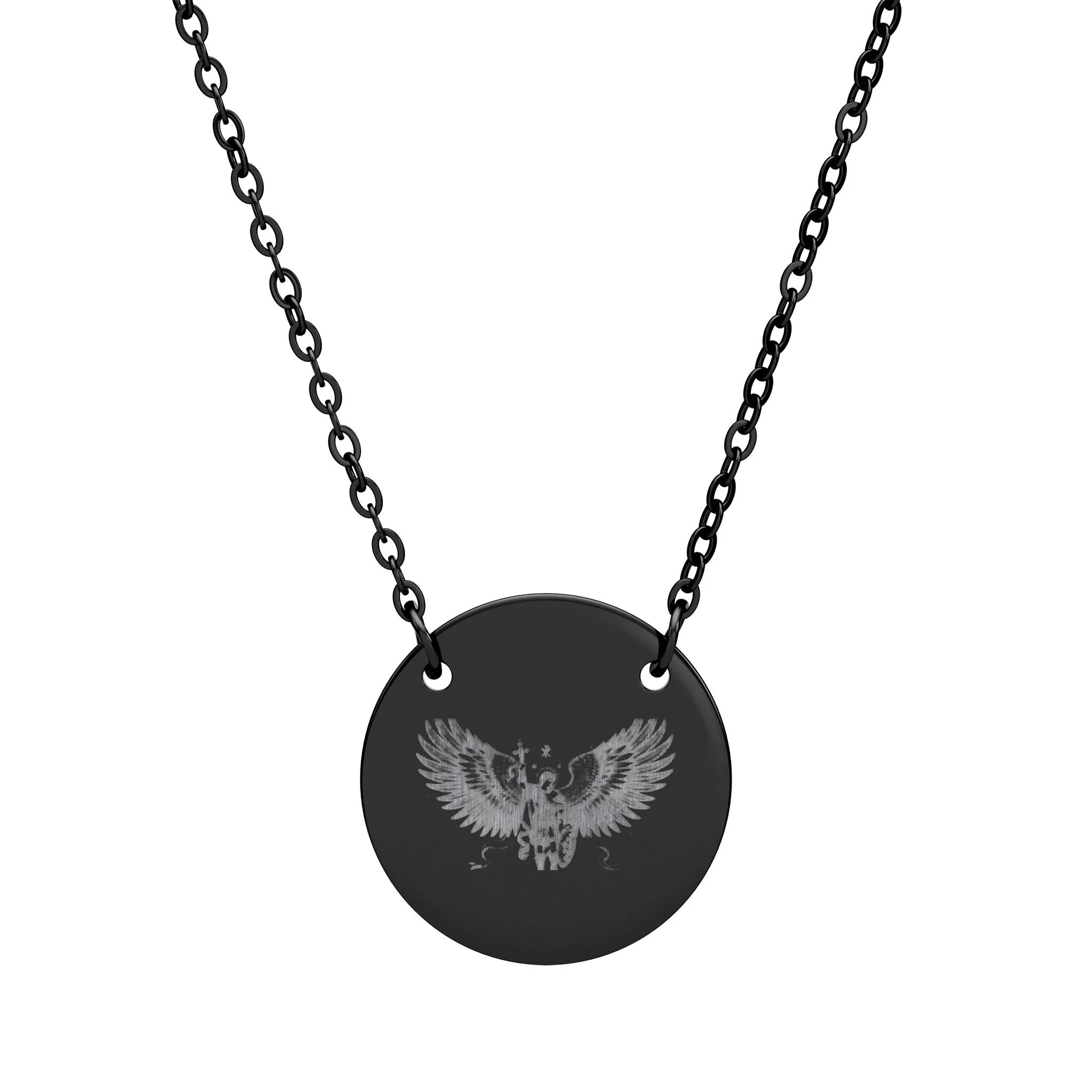 The small 18mm pendant bears a detailed laser-etched winged emblem, available in polished silver or matte black finishes.