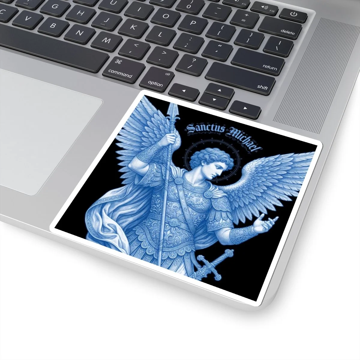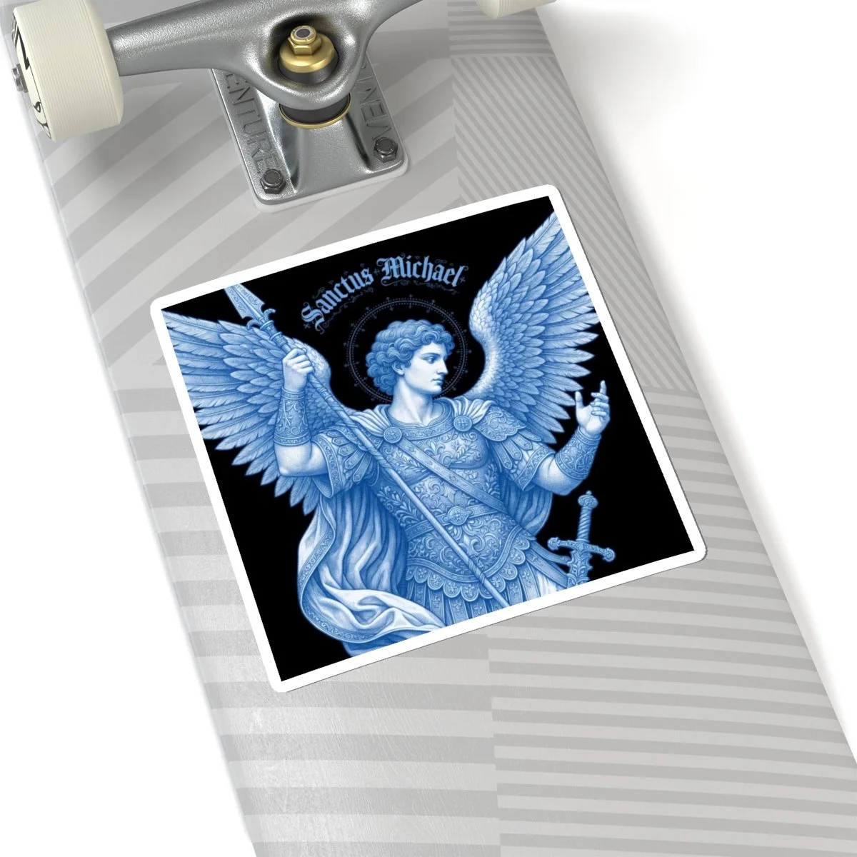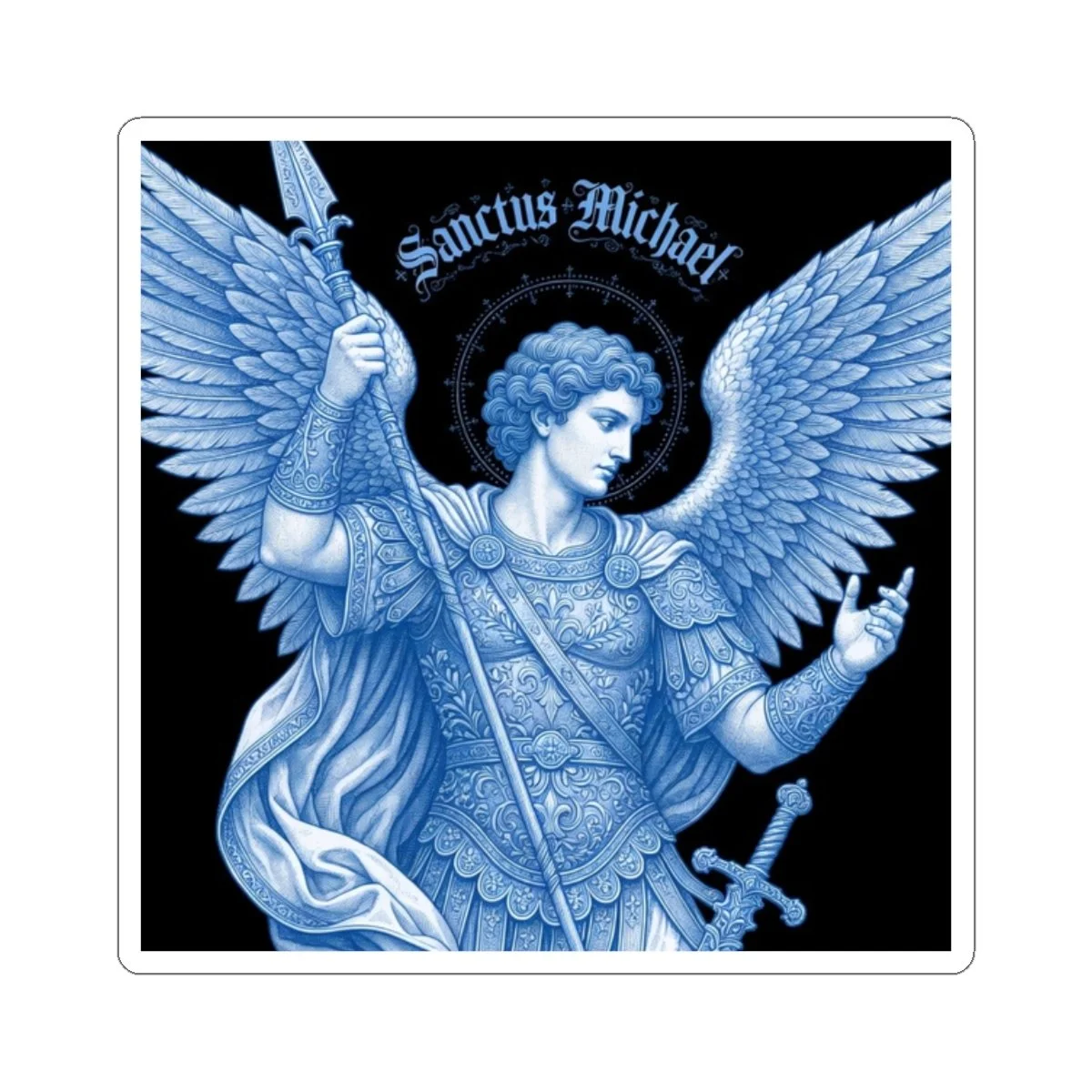 This kiss-cut vinyl piece features a detailed blue-toned rendering of Saint Michael — wings unfurled, spear in hand, haloed in delicate flourishes — printed with eco-solvent inks for deep, saturated color on a glossy surface.