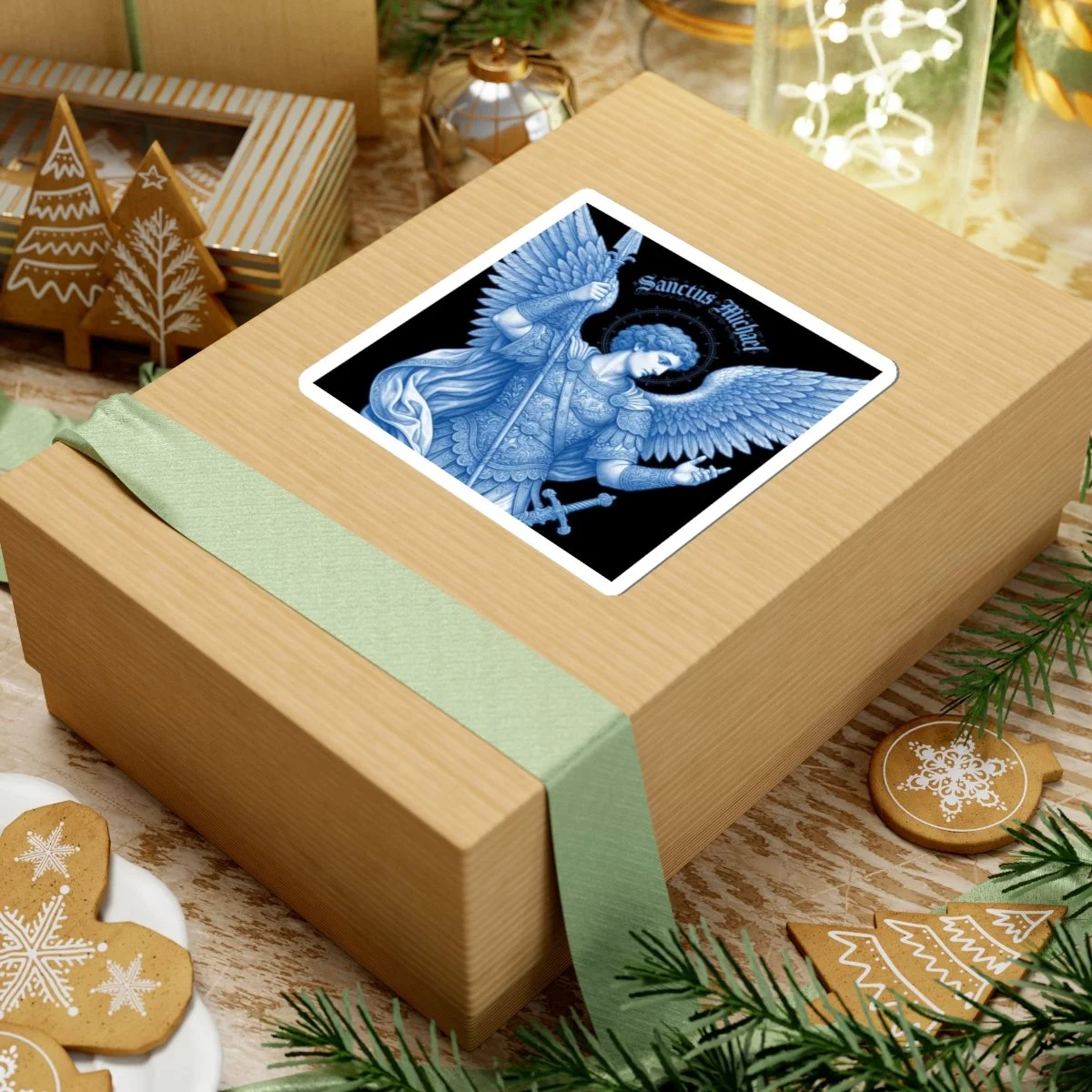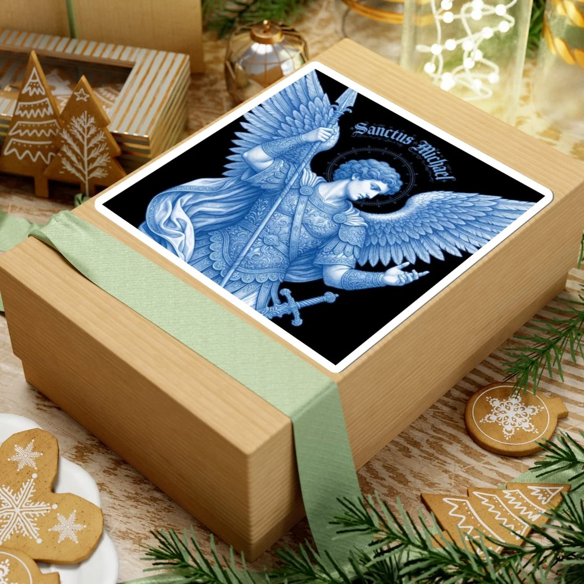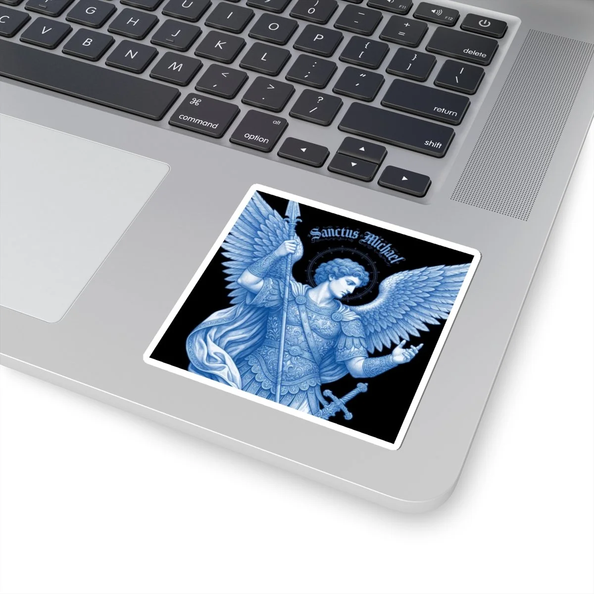 This kiss-cut vinyl piece features a detailed blue-toned rendering of Saint Michael — wings unfurled, spear in hand, haloed in delicate flourishes — printed with eco-solvent inks for deep, saturated color on a glossy surface.