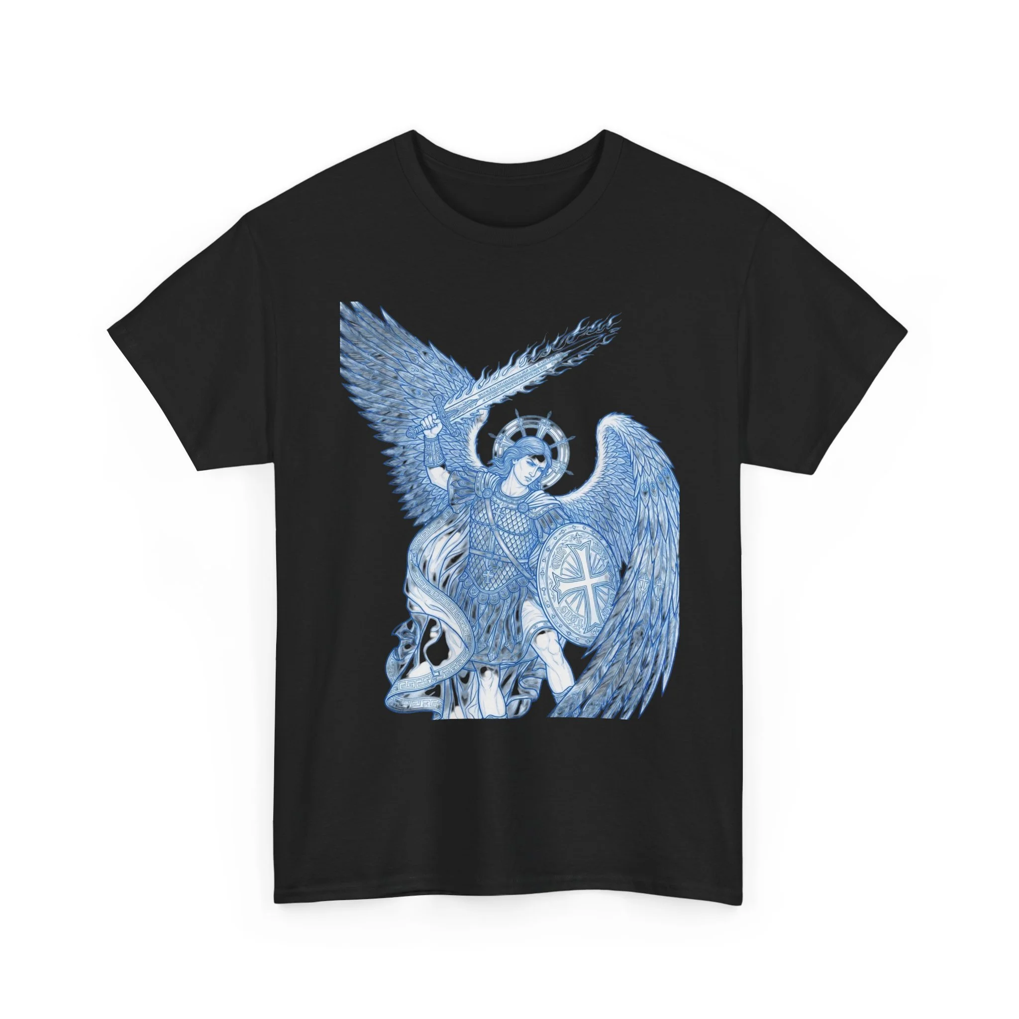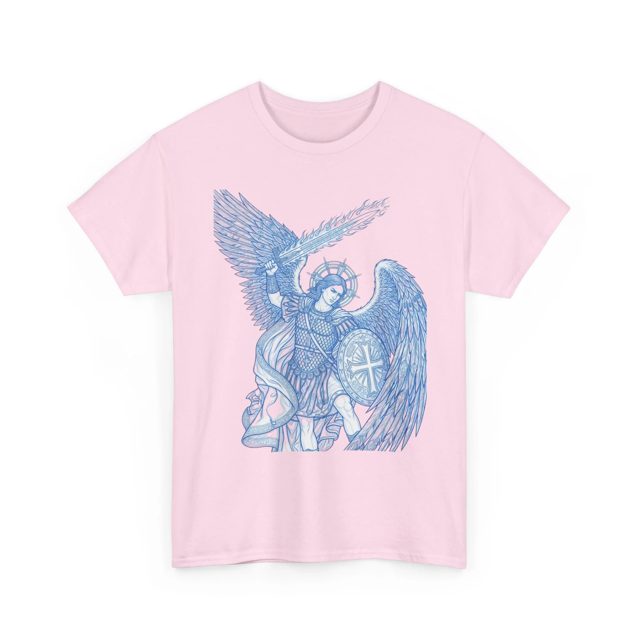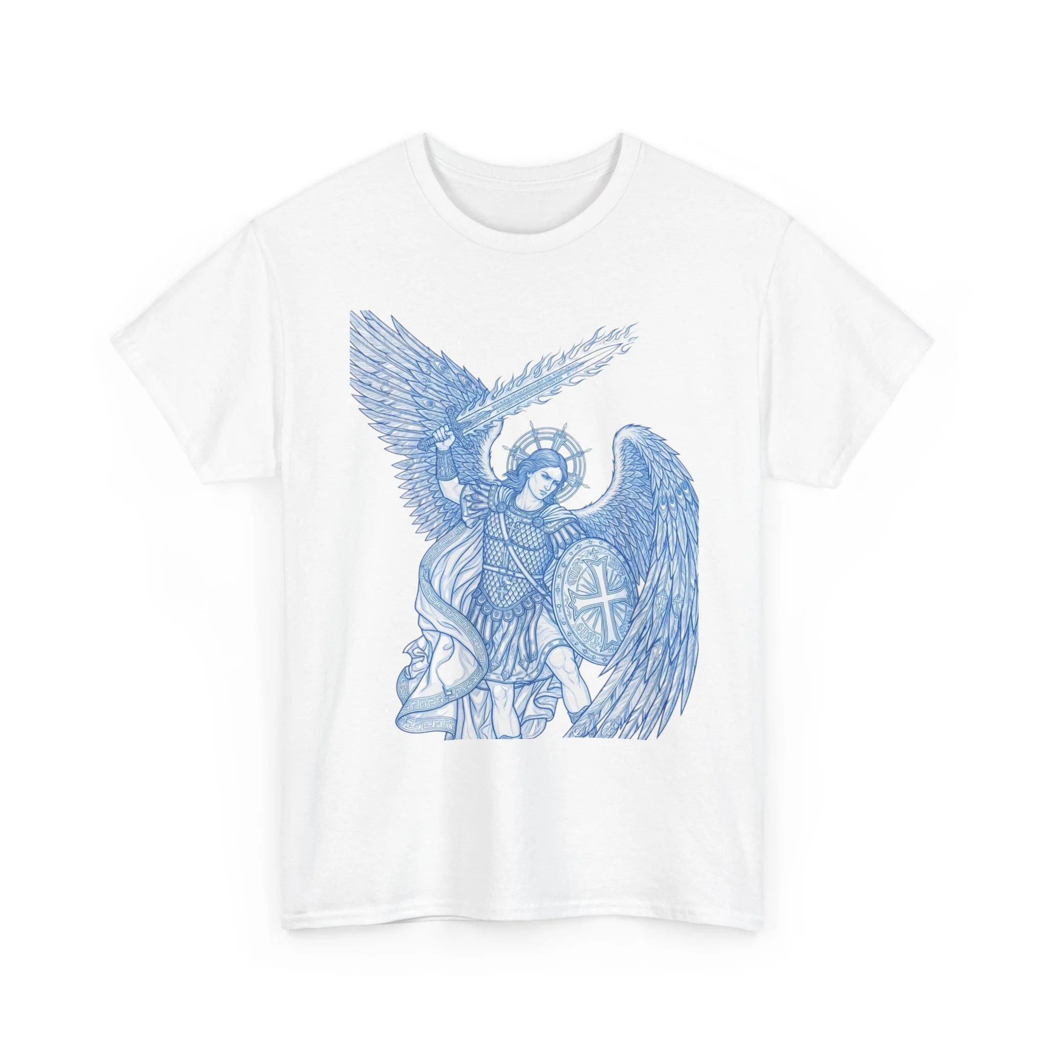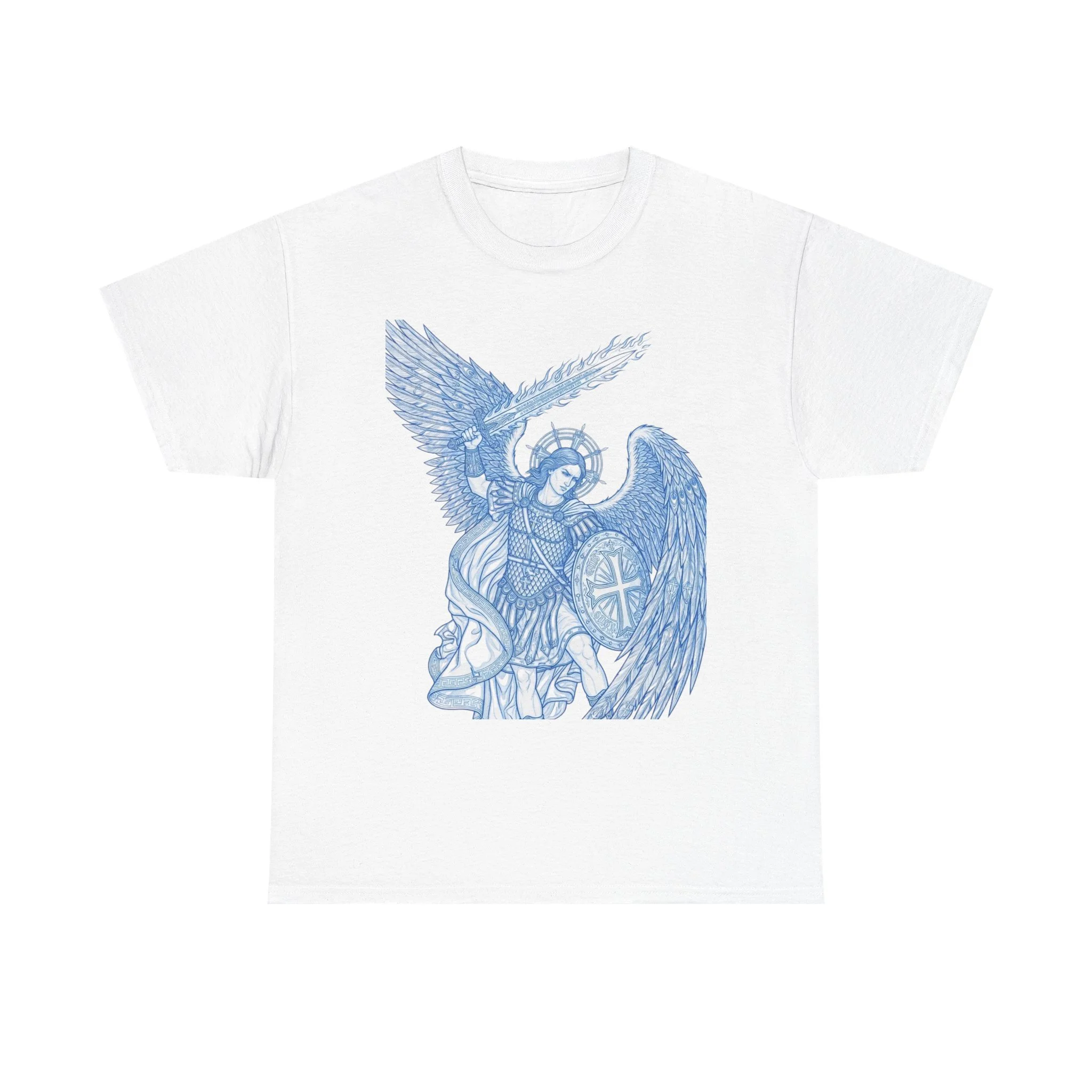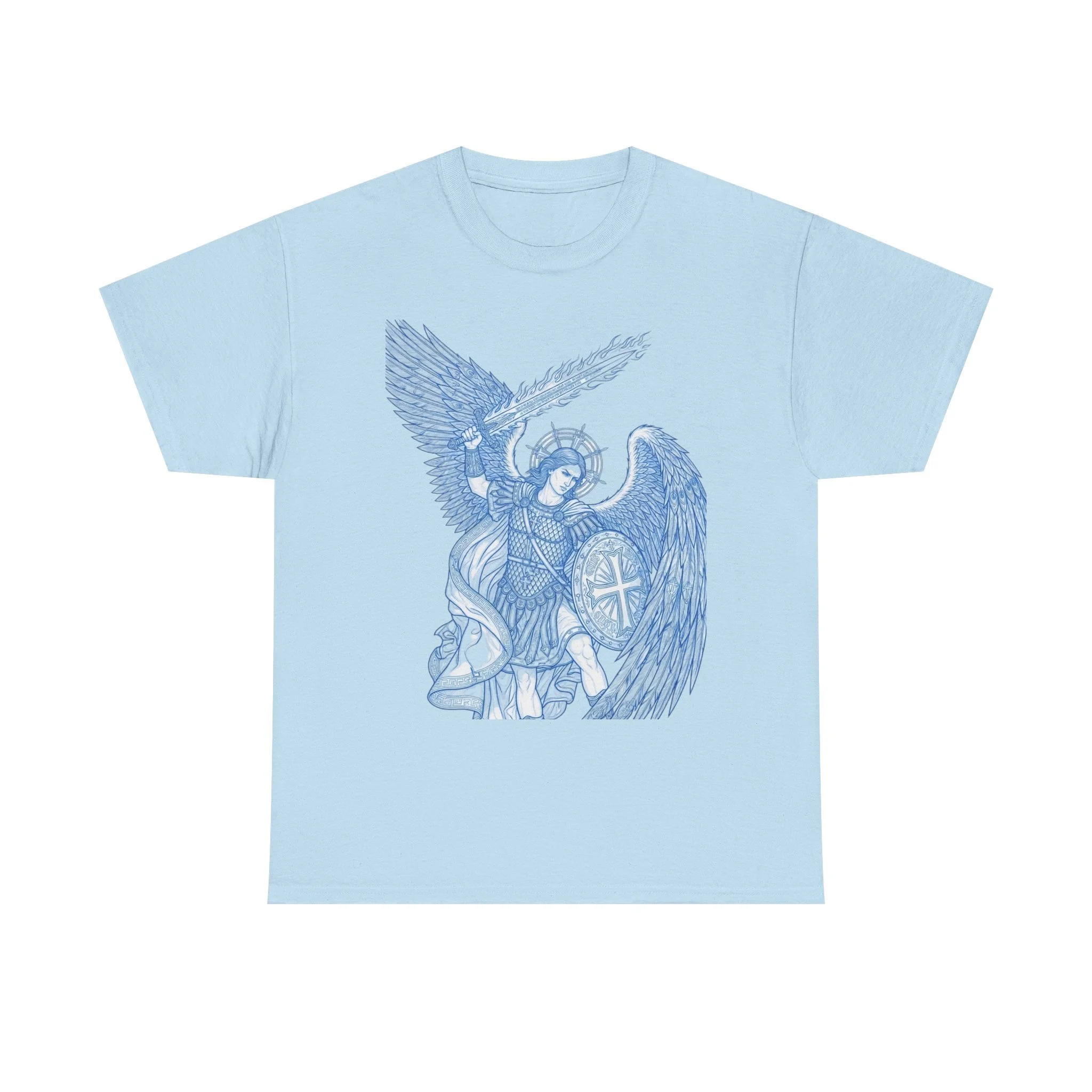 This classic cotton tee carries a quiet, devotional energy — a detailed blue line-art of a winged warrior on the front and a circular emblem with a sword and gentle script on the back.