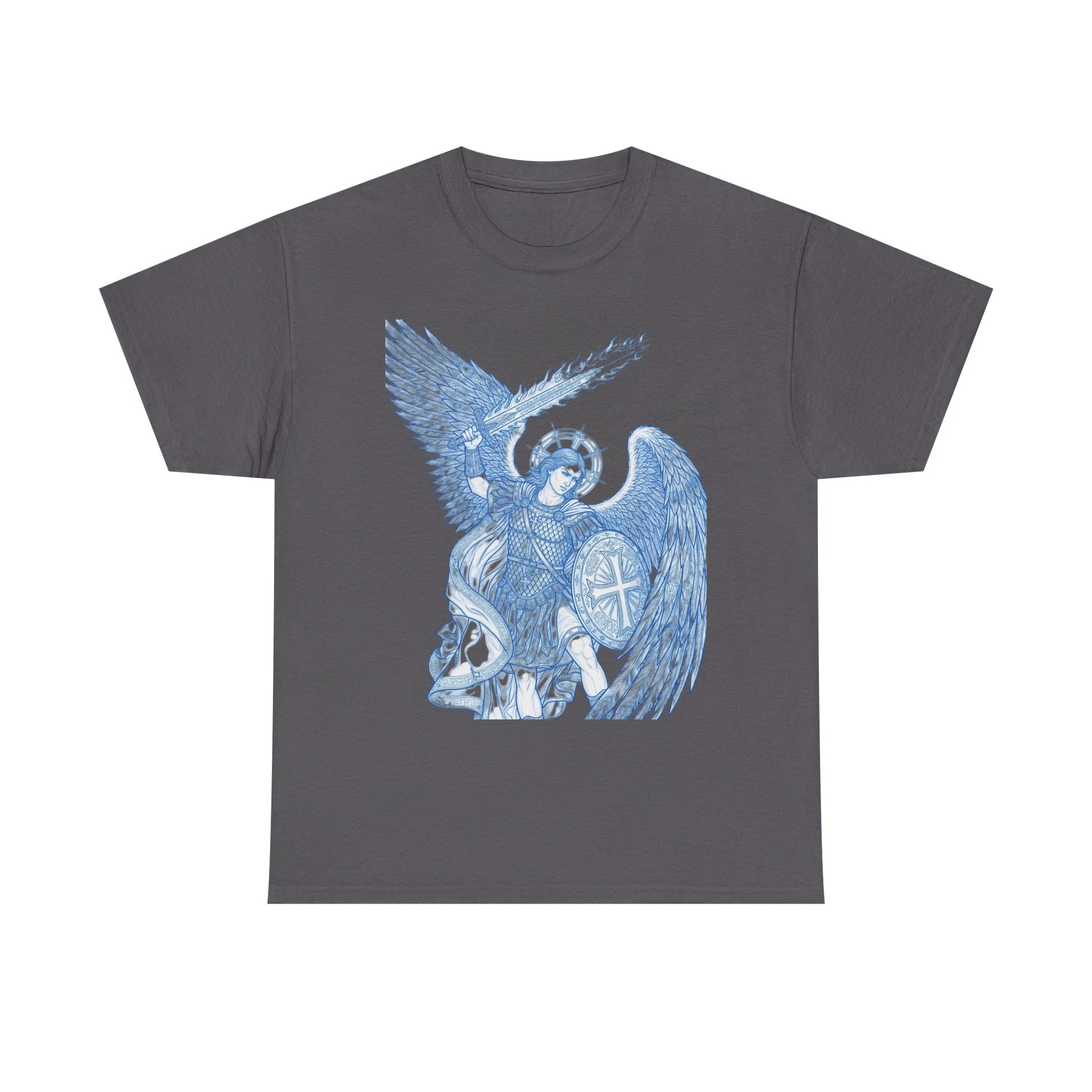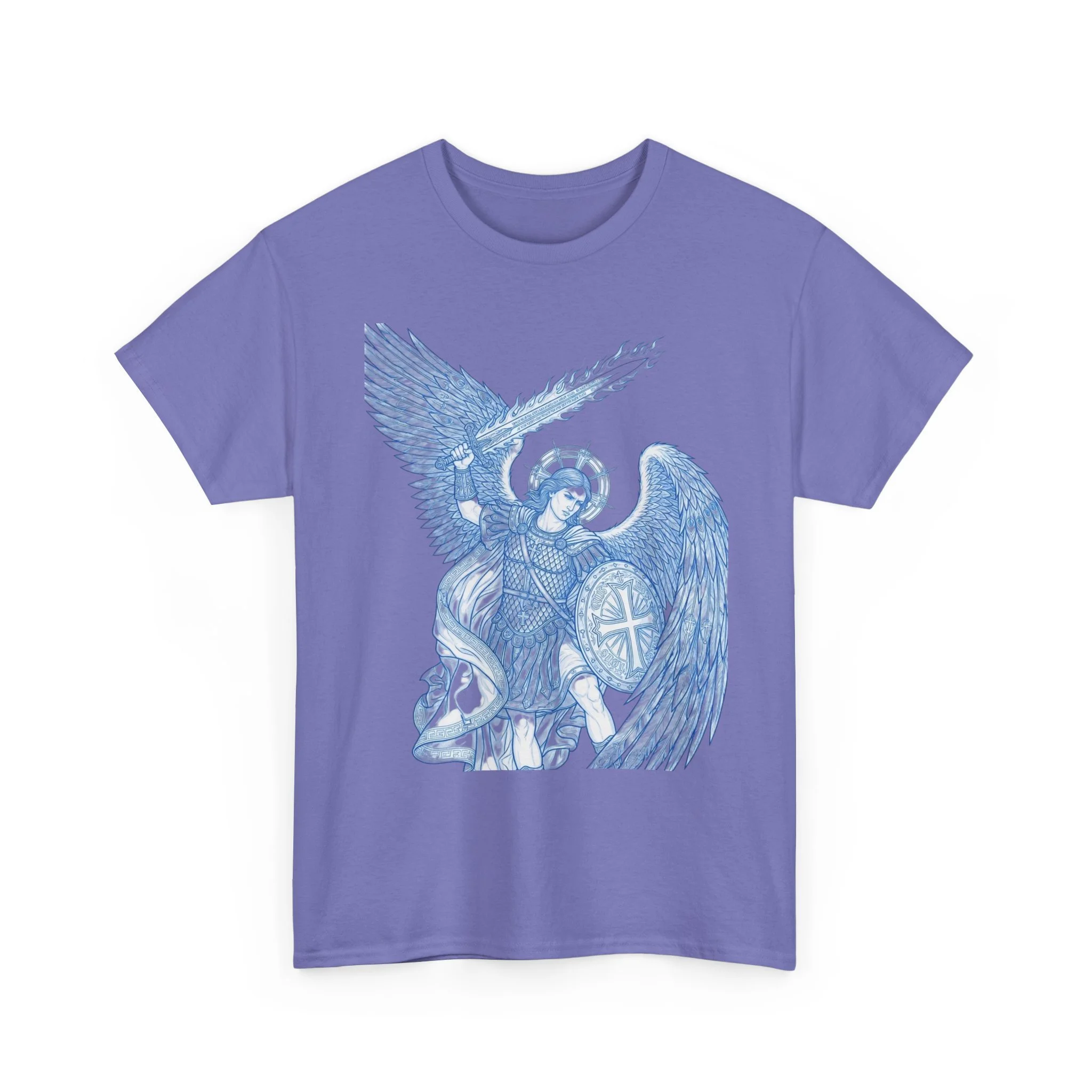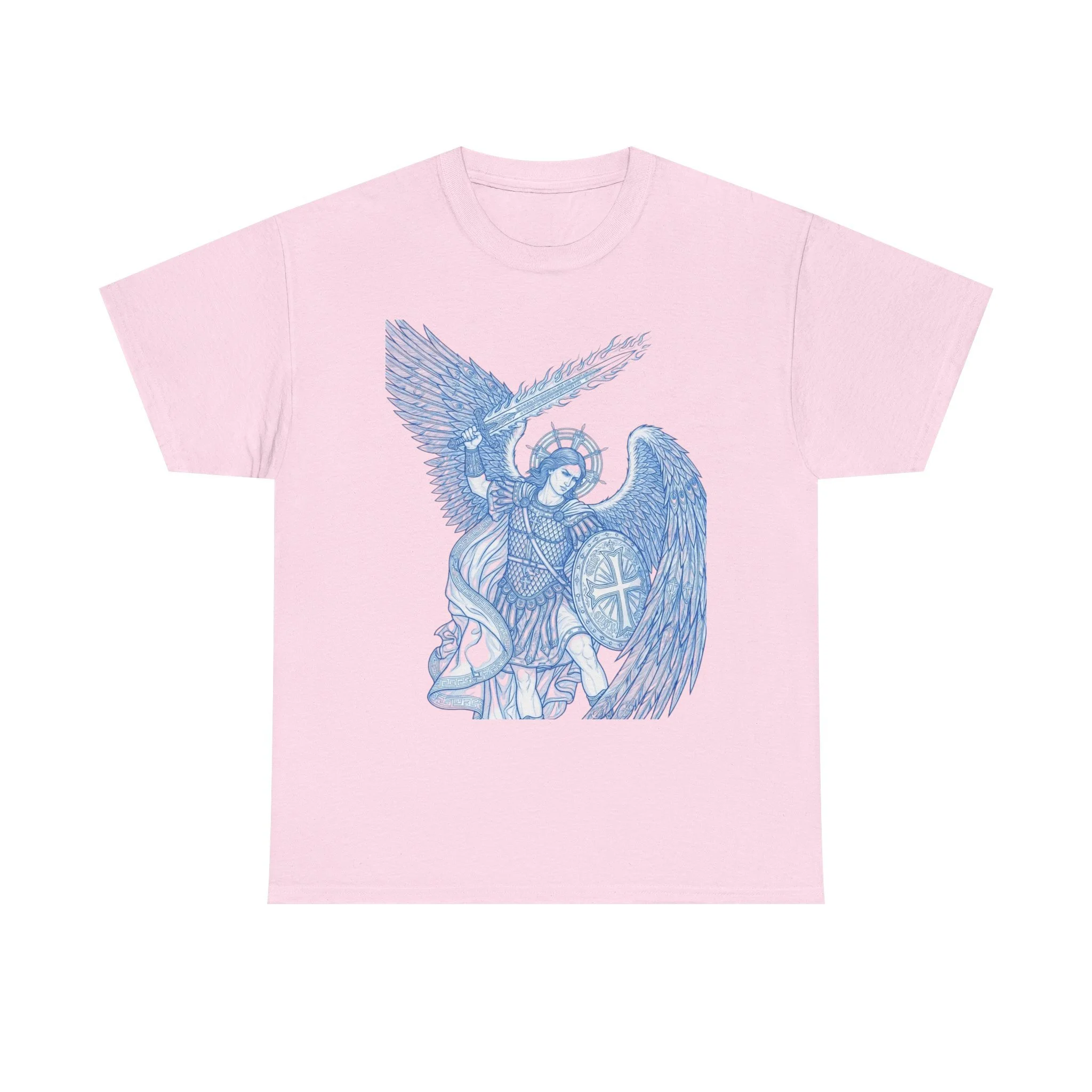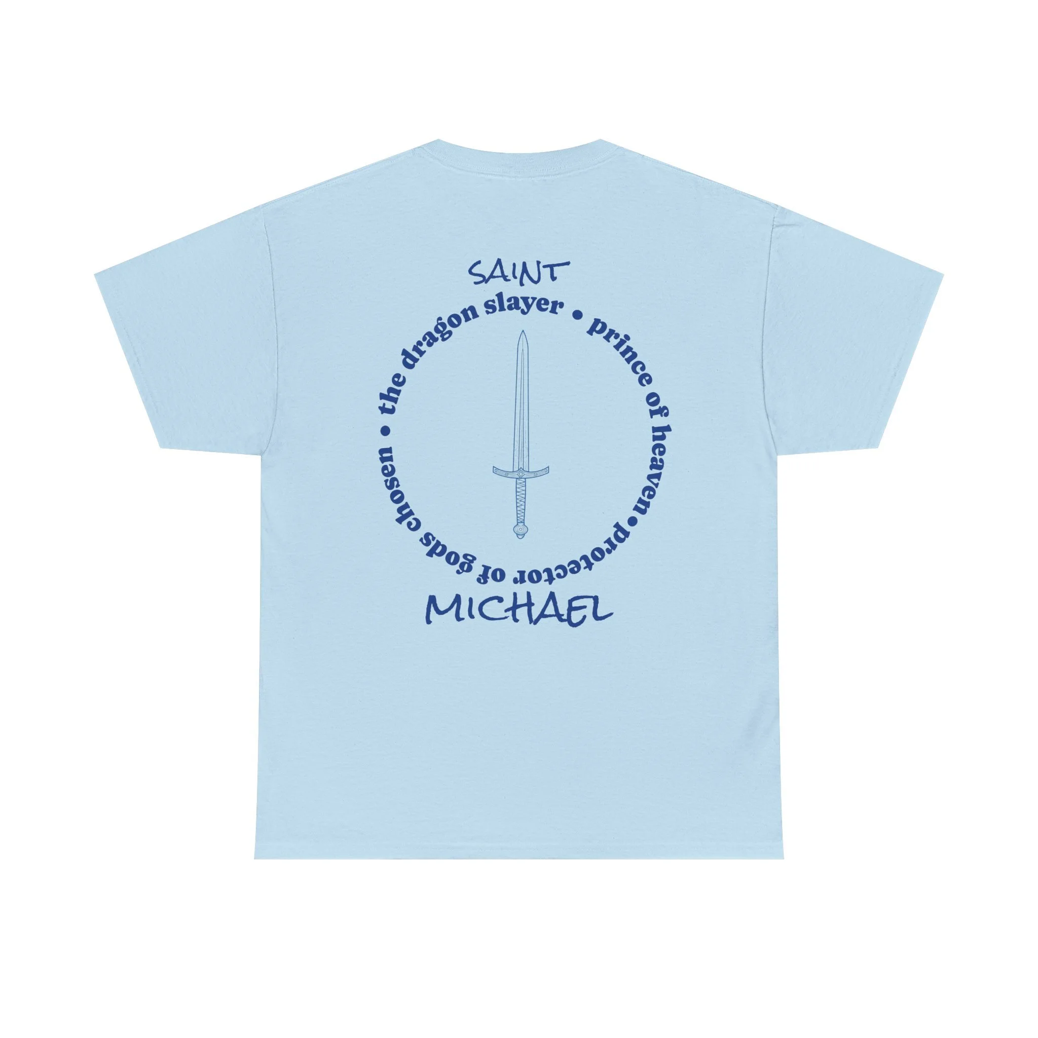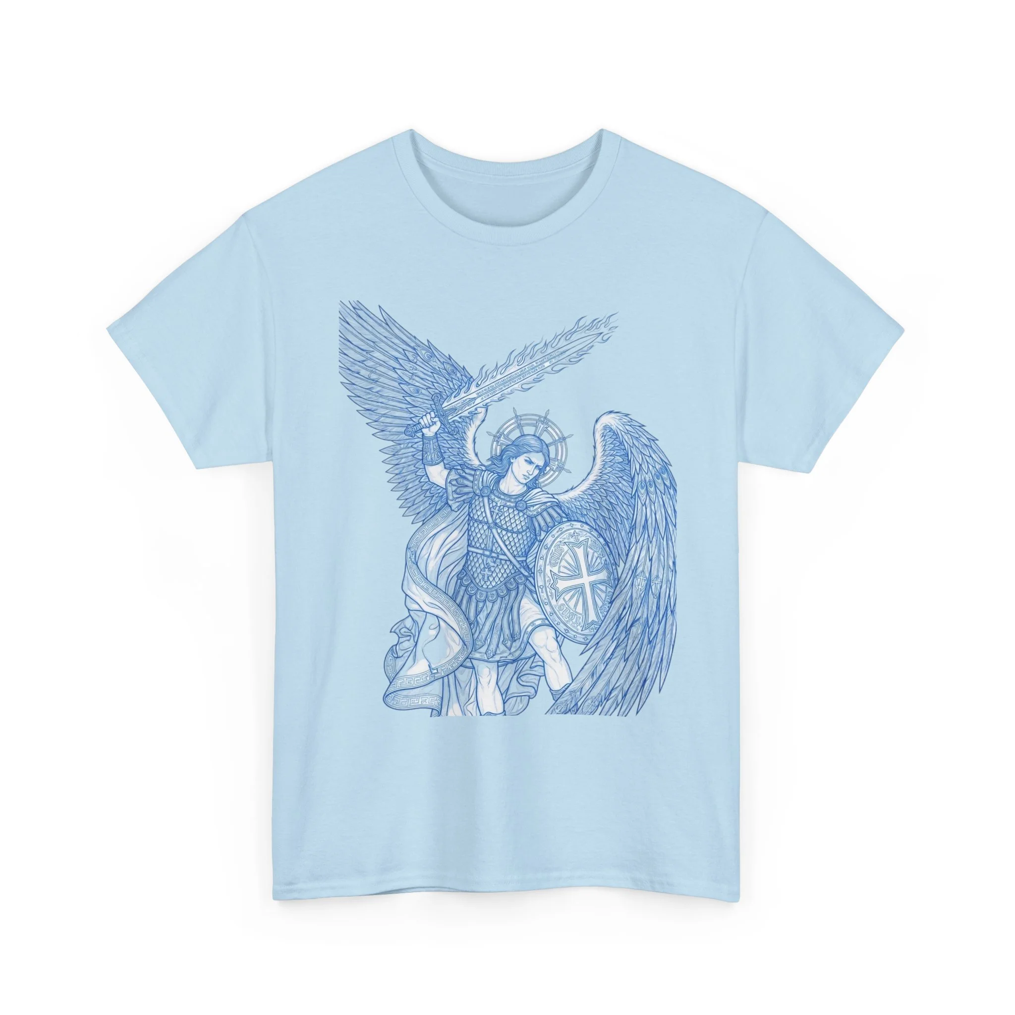 This classic cotton tee carries a quiet, devotional energy — a detailed blue line-art of a winged warrior on the front and a circular emblem with a sword and gentle script on the back.