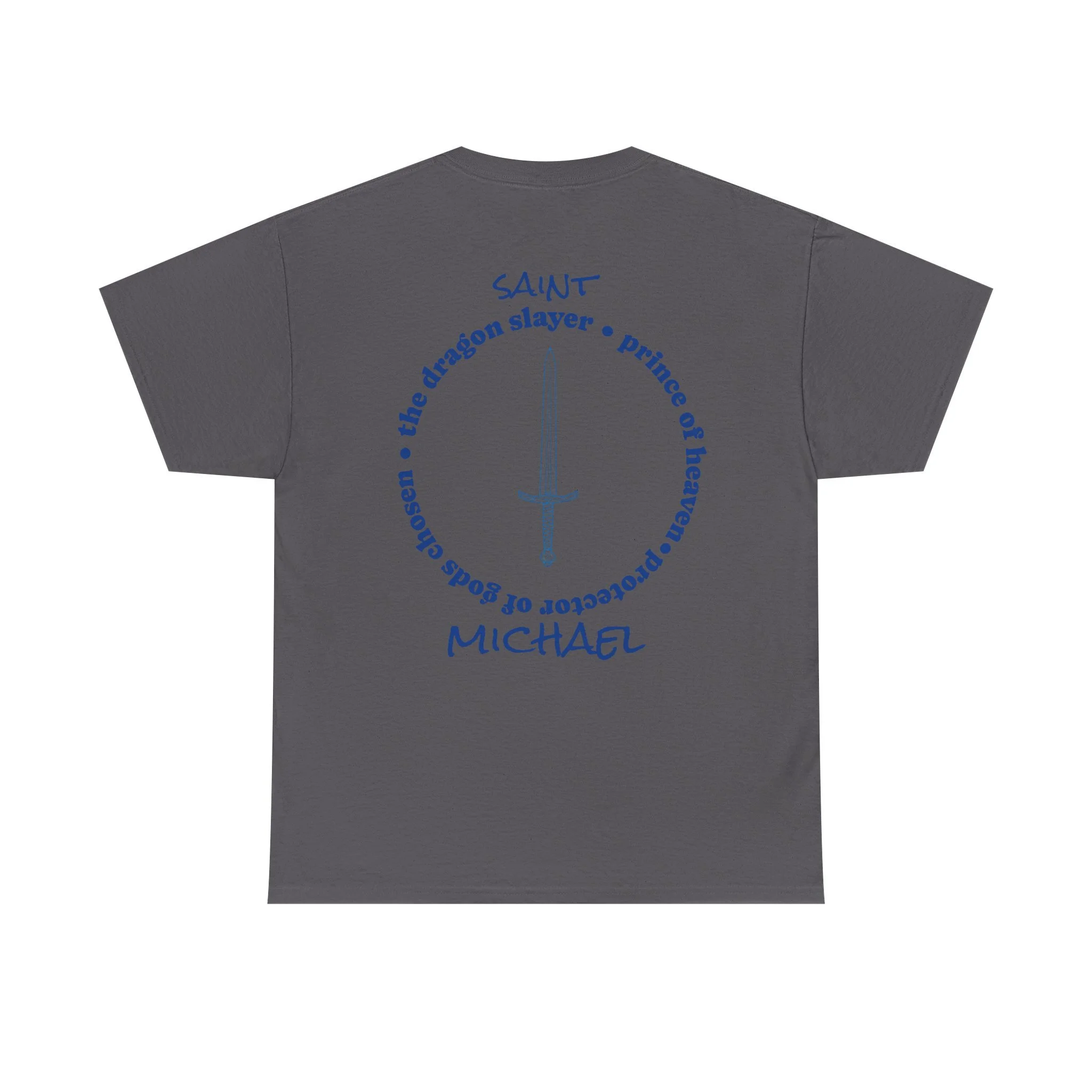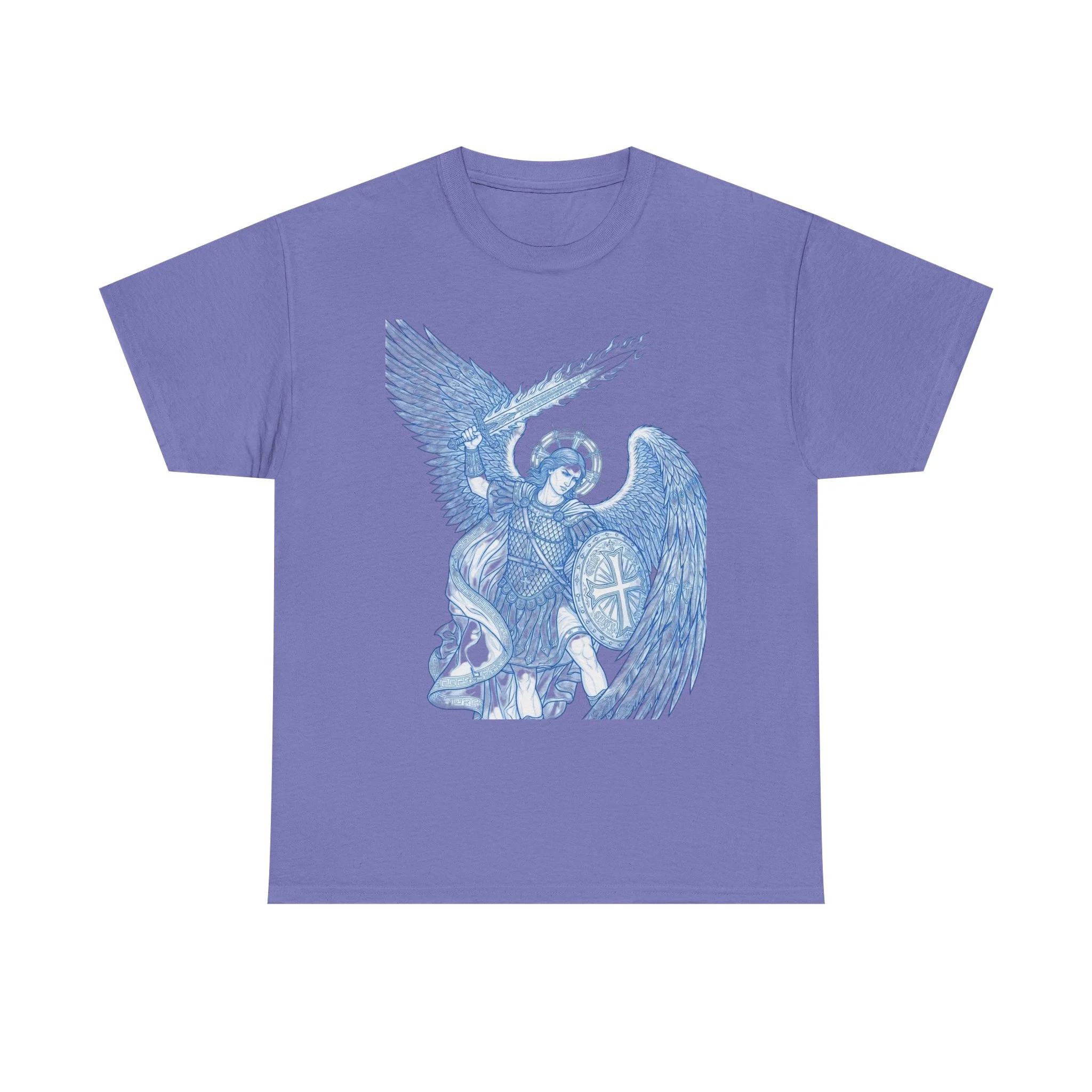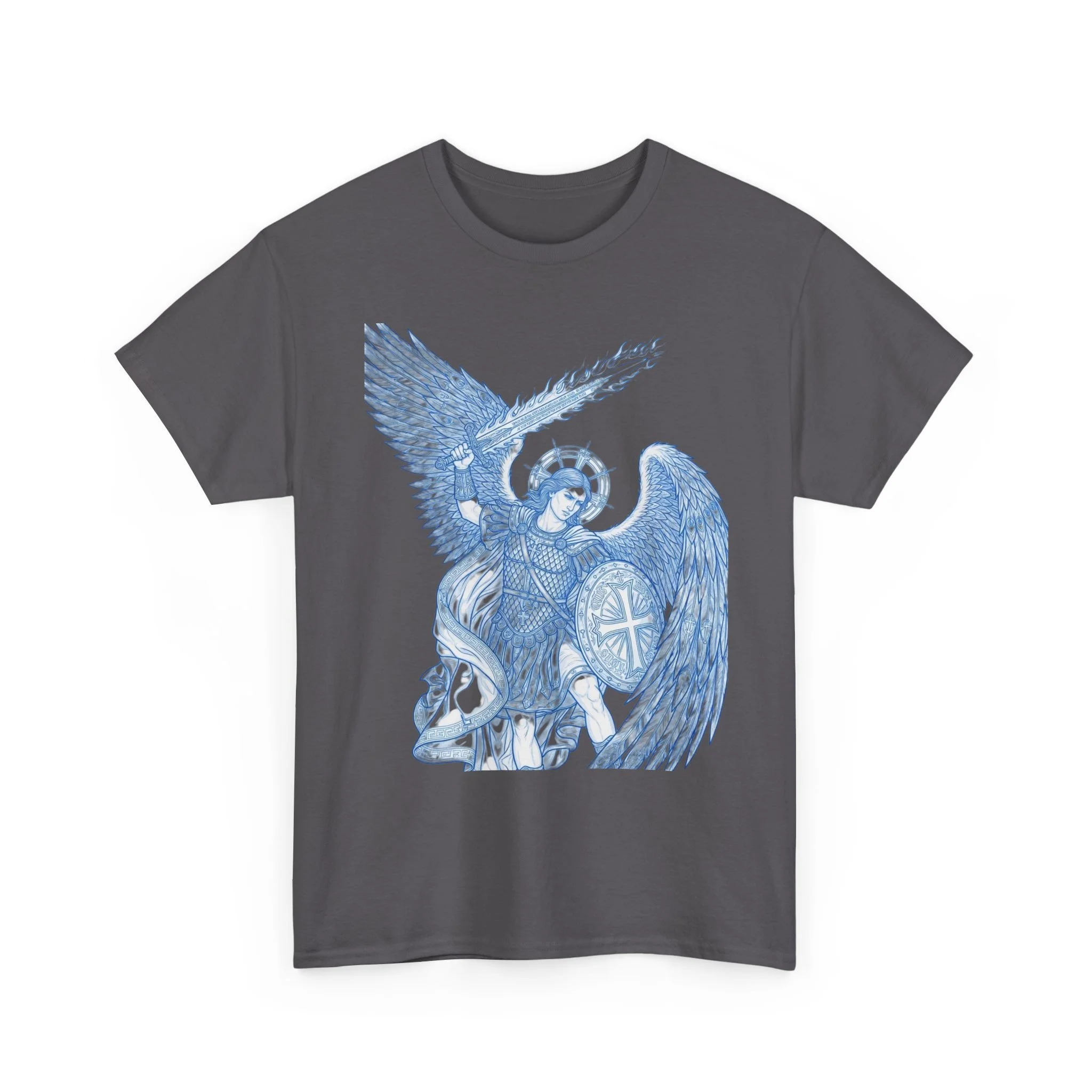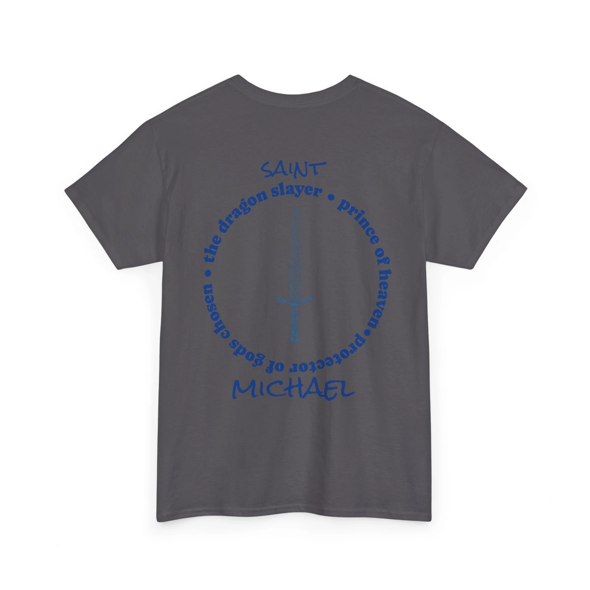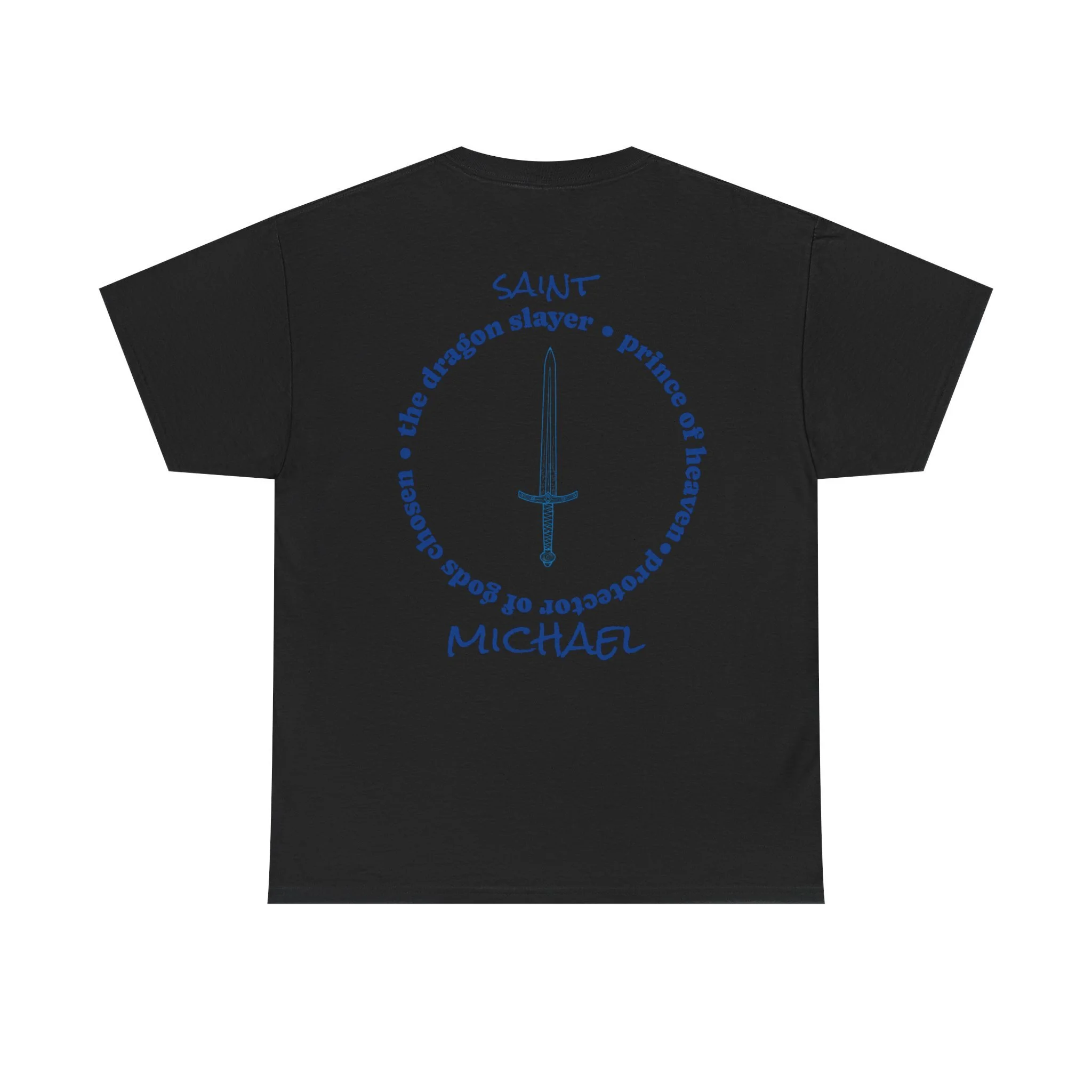 This classic cotton tee carries a quiet, devotional energy — a detailed blue line-art of a winged warrior on the front and a circular emblem with a sword and gentle script on the back.