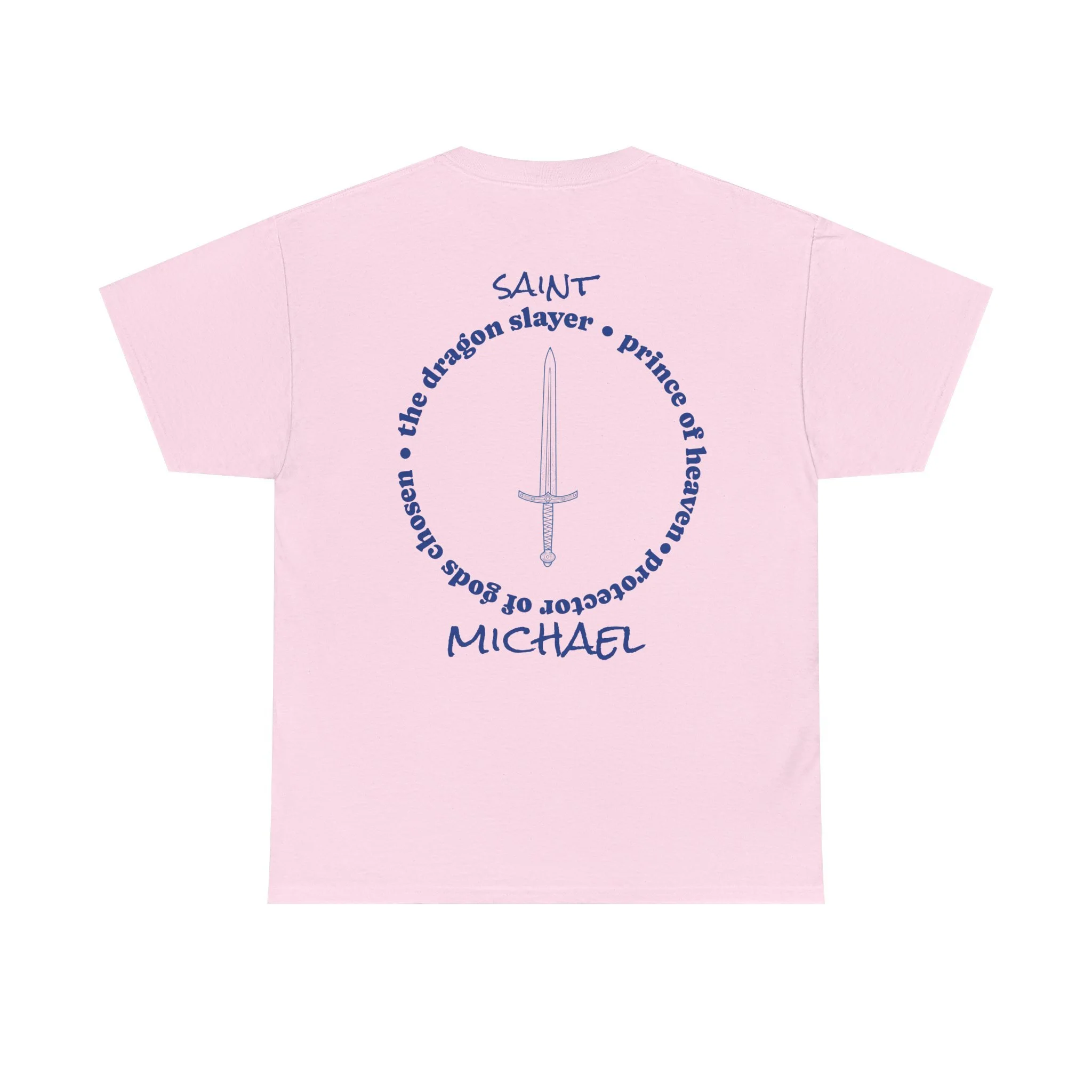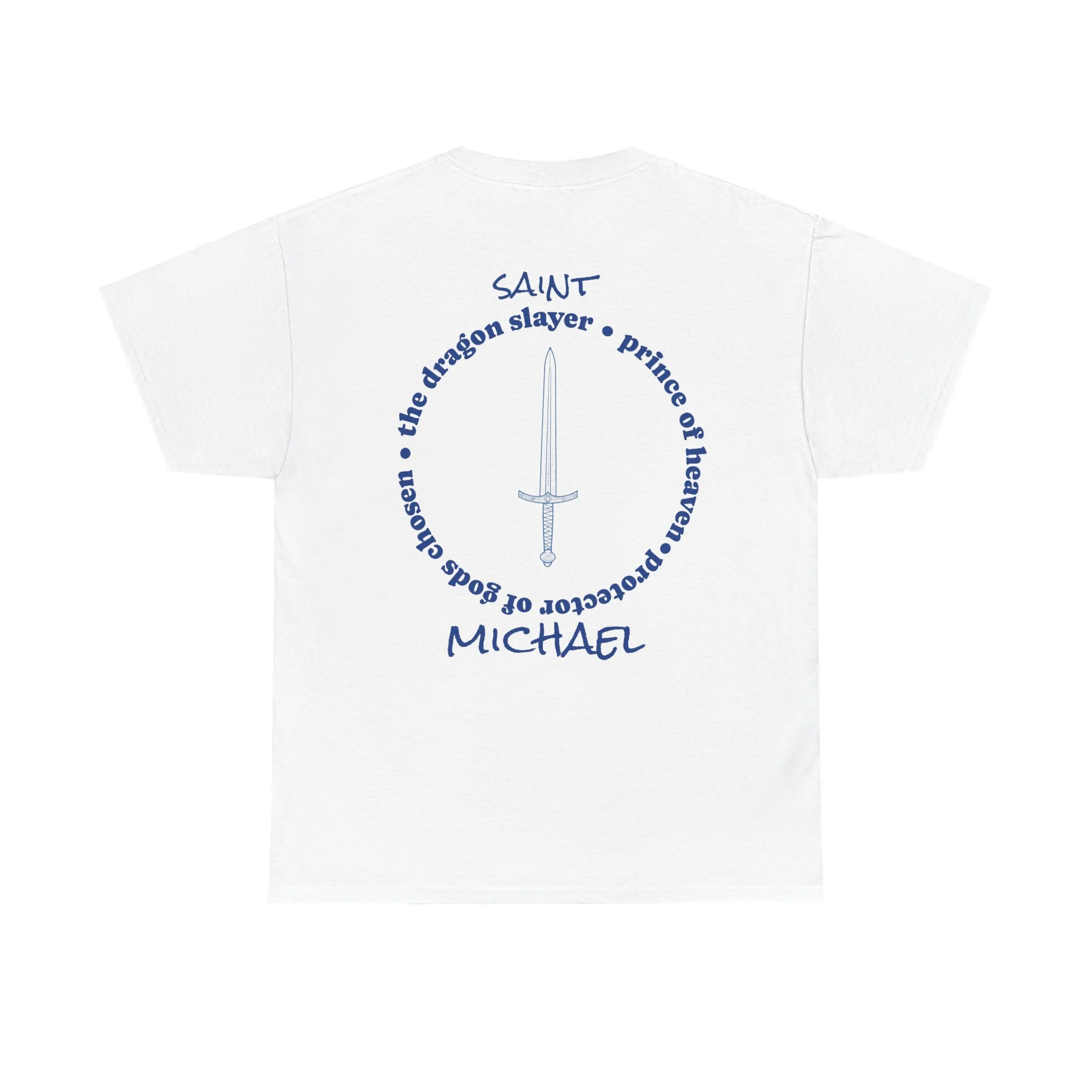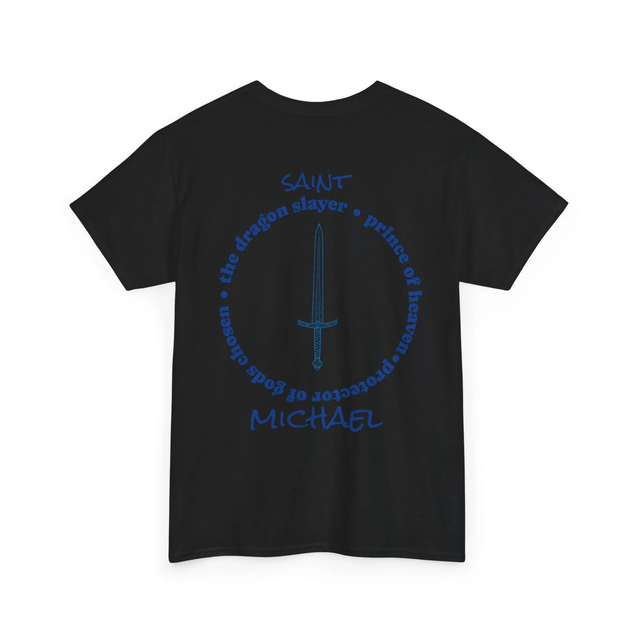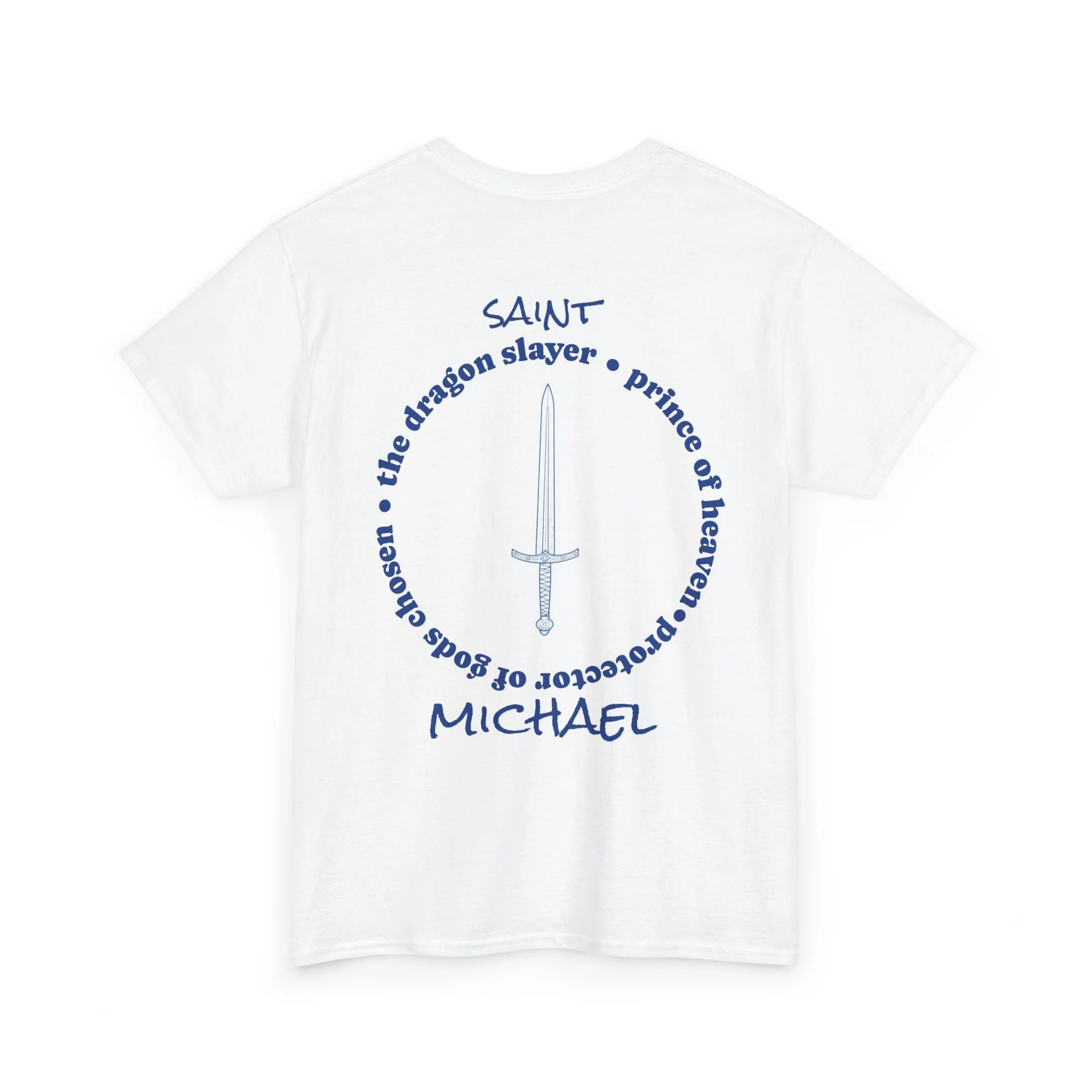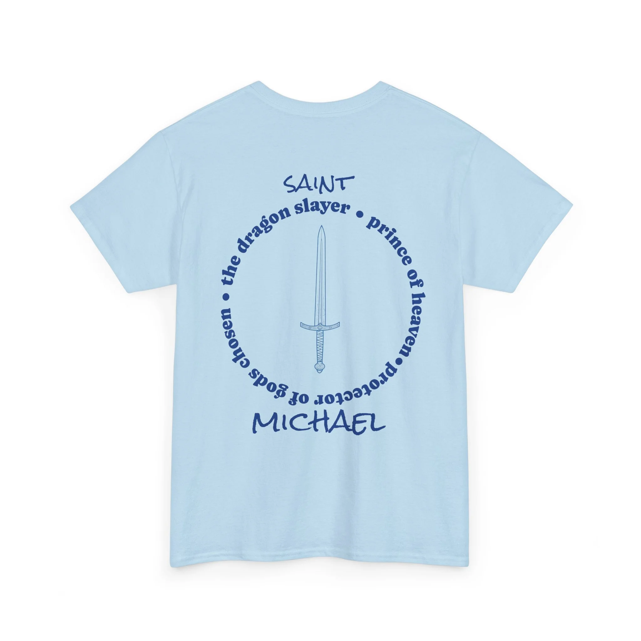 This classic cotton tee carries a quiet, devotional energy — a detailed blue line-art of a winged warrior on the front and a circular emblem with a sword and gentle script on the back.