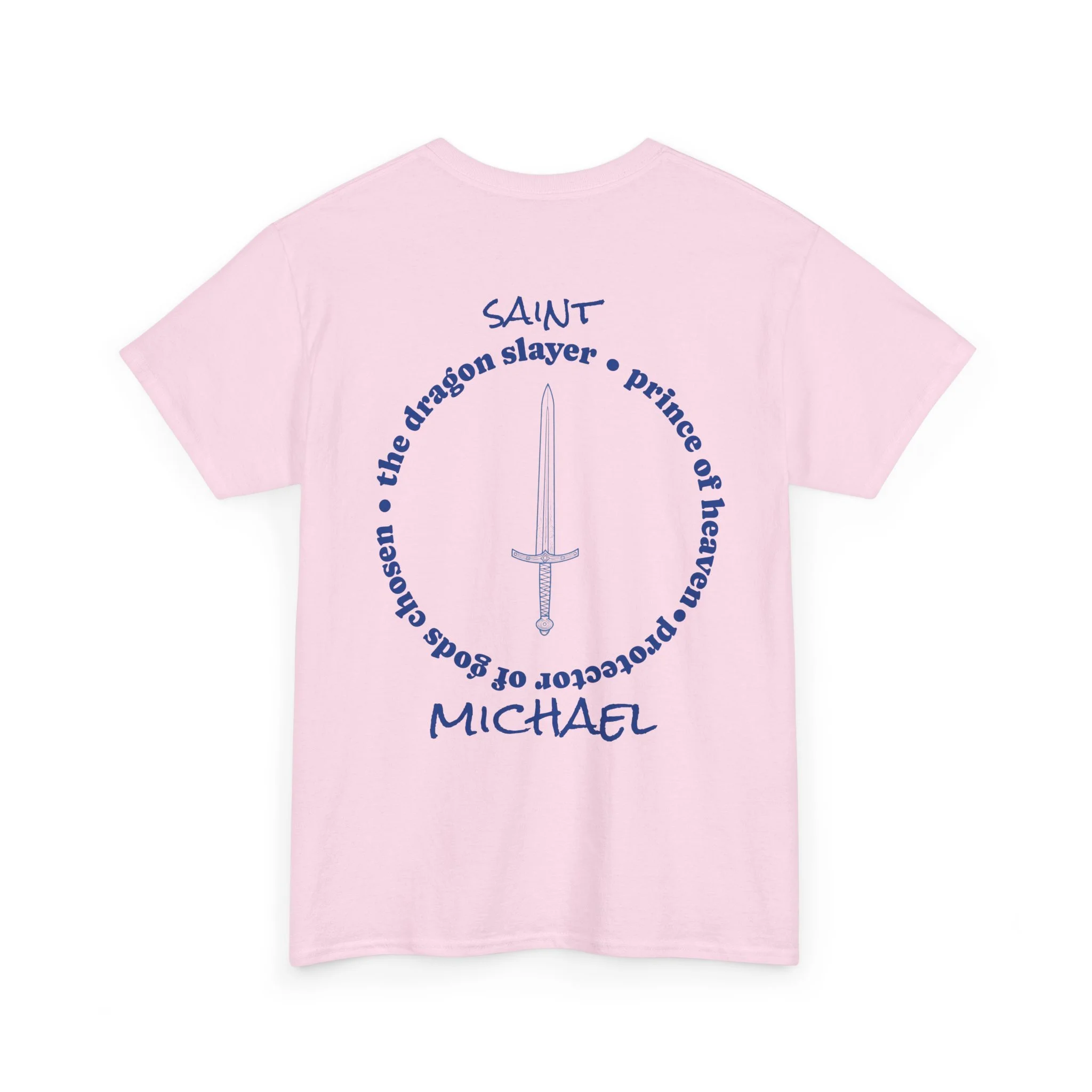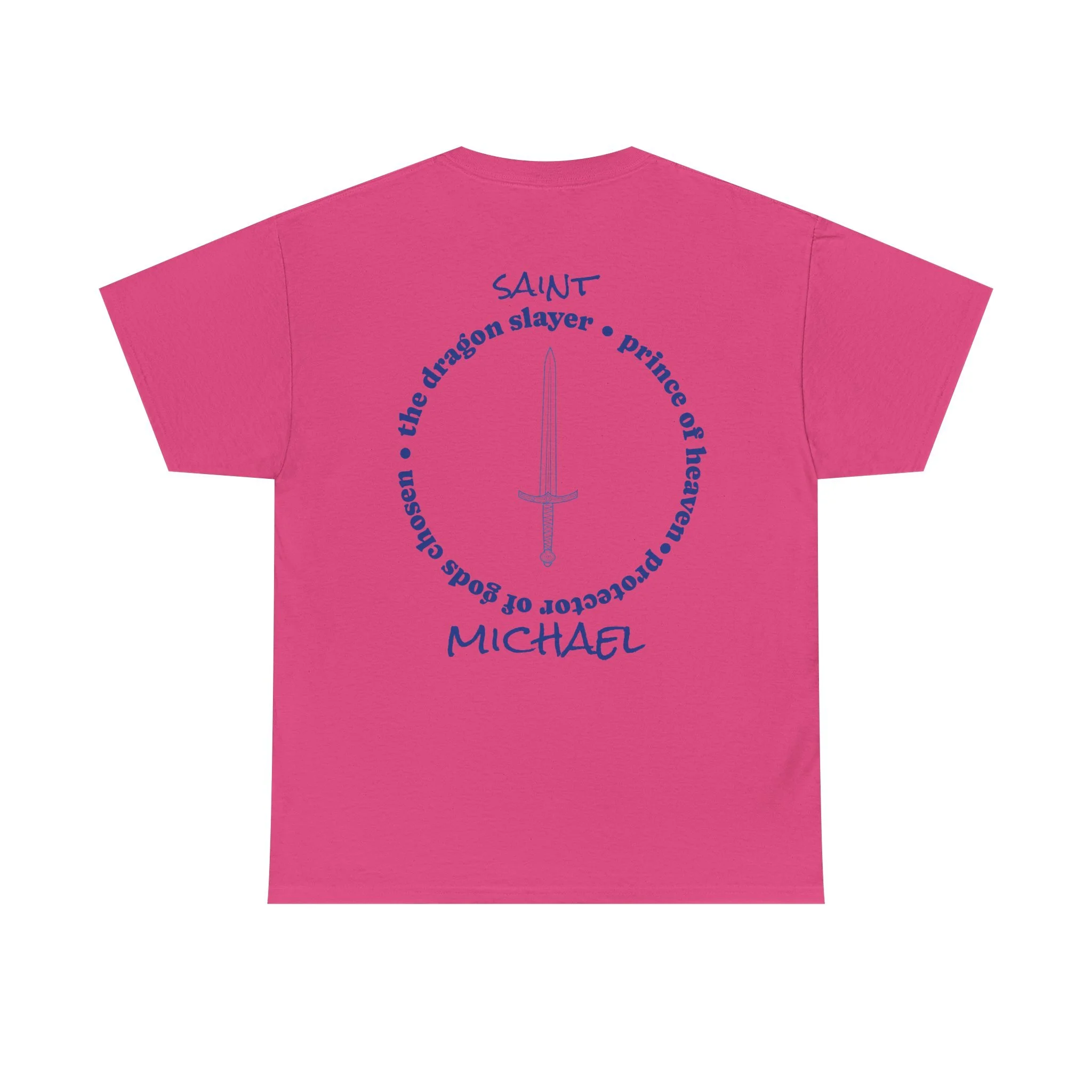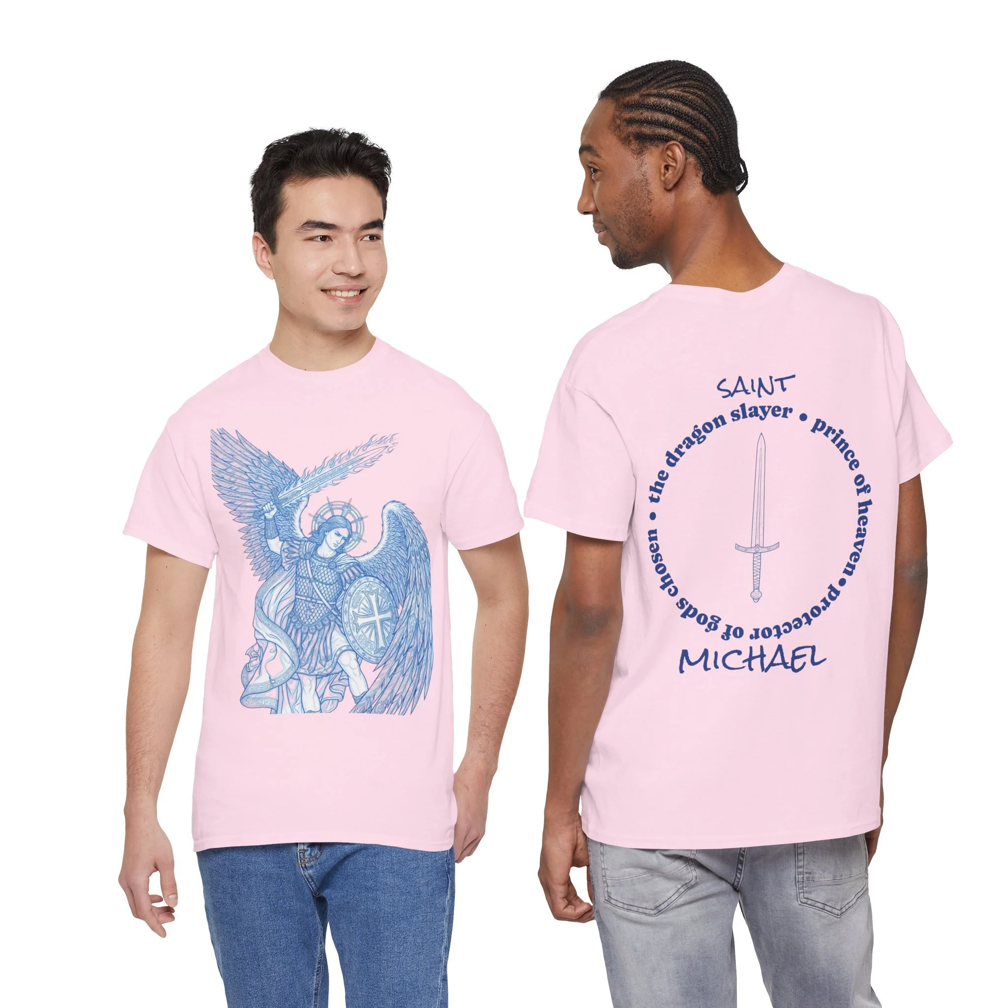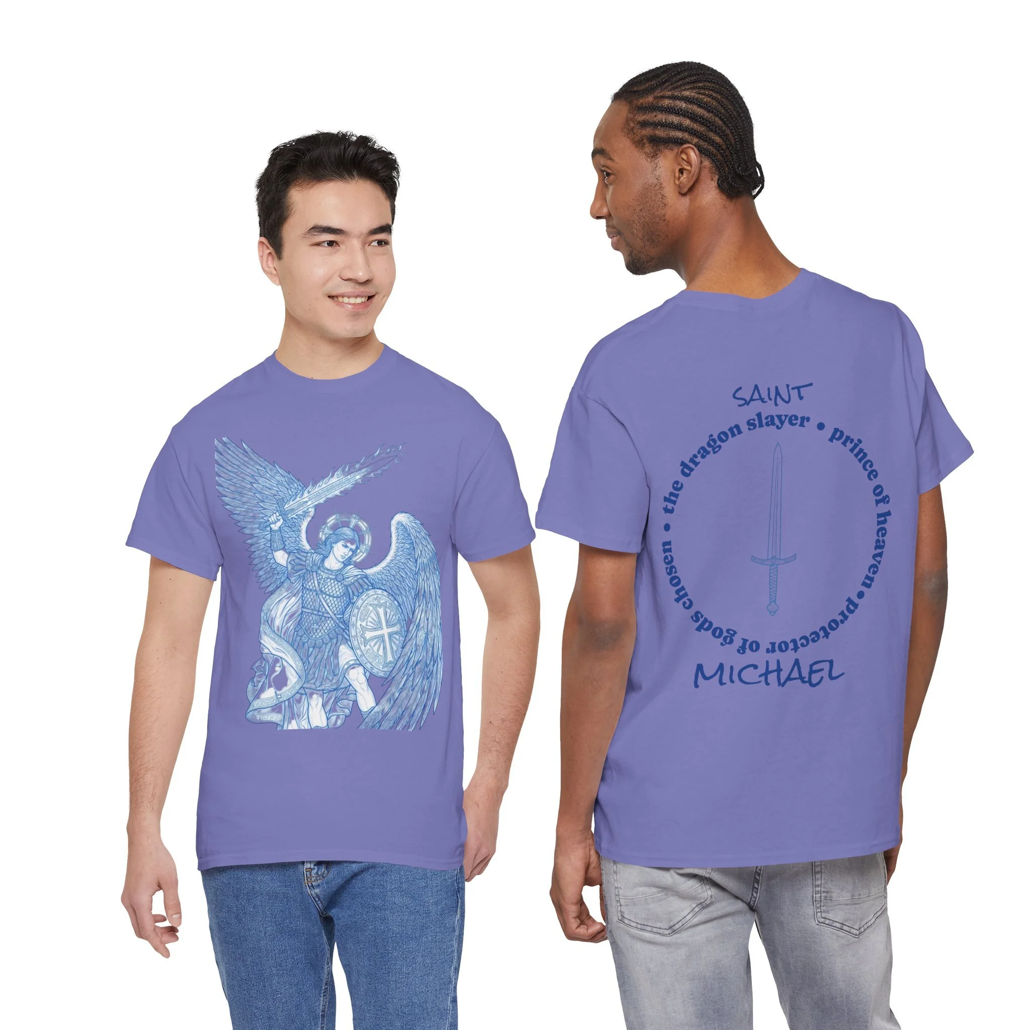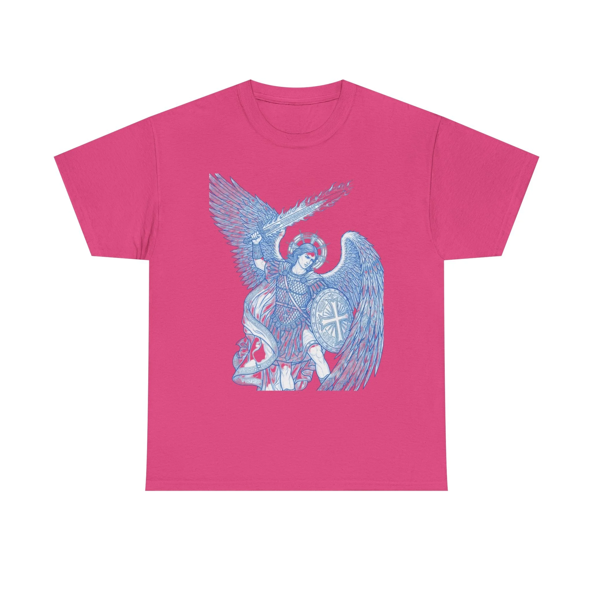 This classic cotton tee carries a quiet, devotional energy — a detailed blue line-art of a winged warrior on the front and a circular emblem with a sword and gentle script on the back.