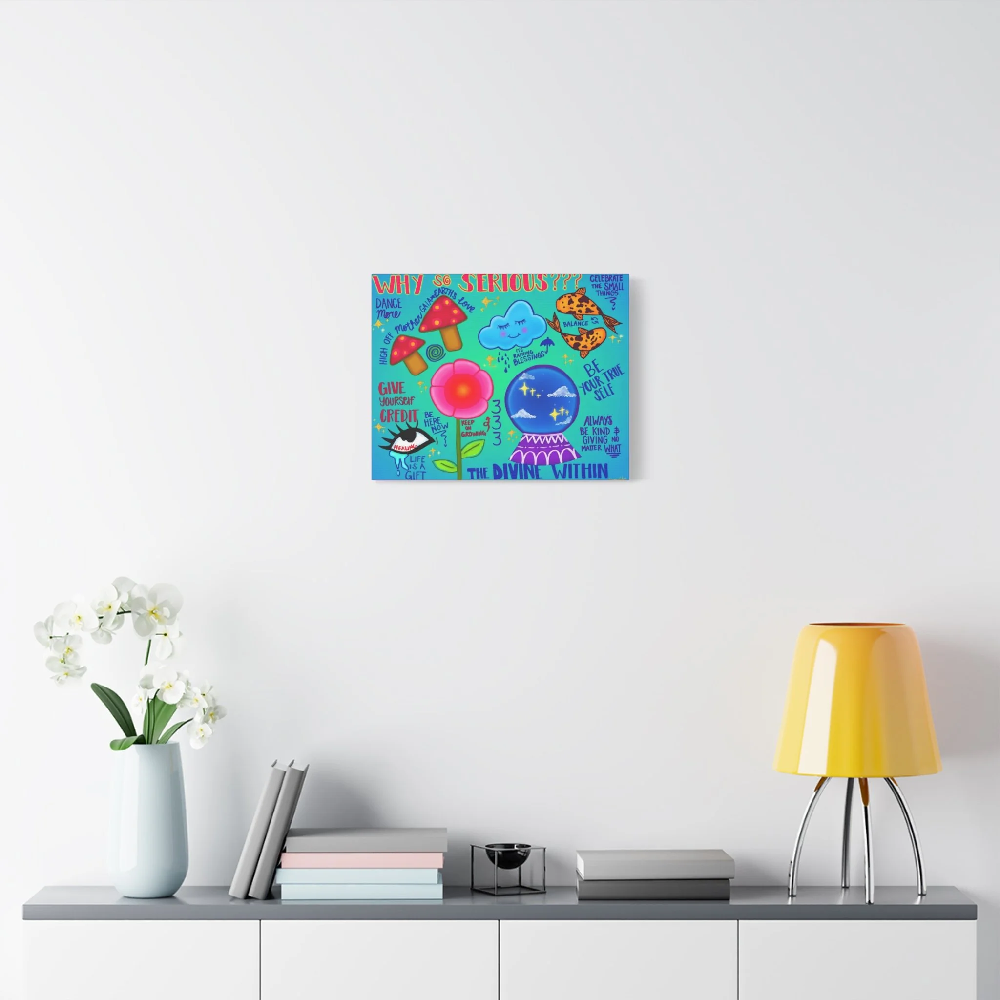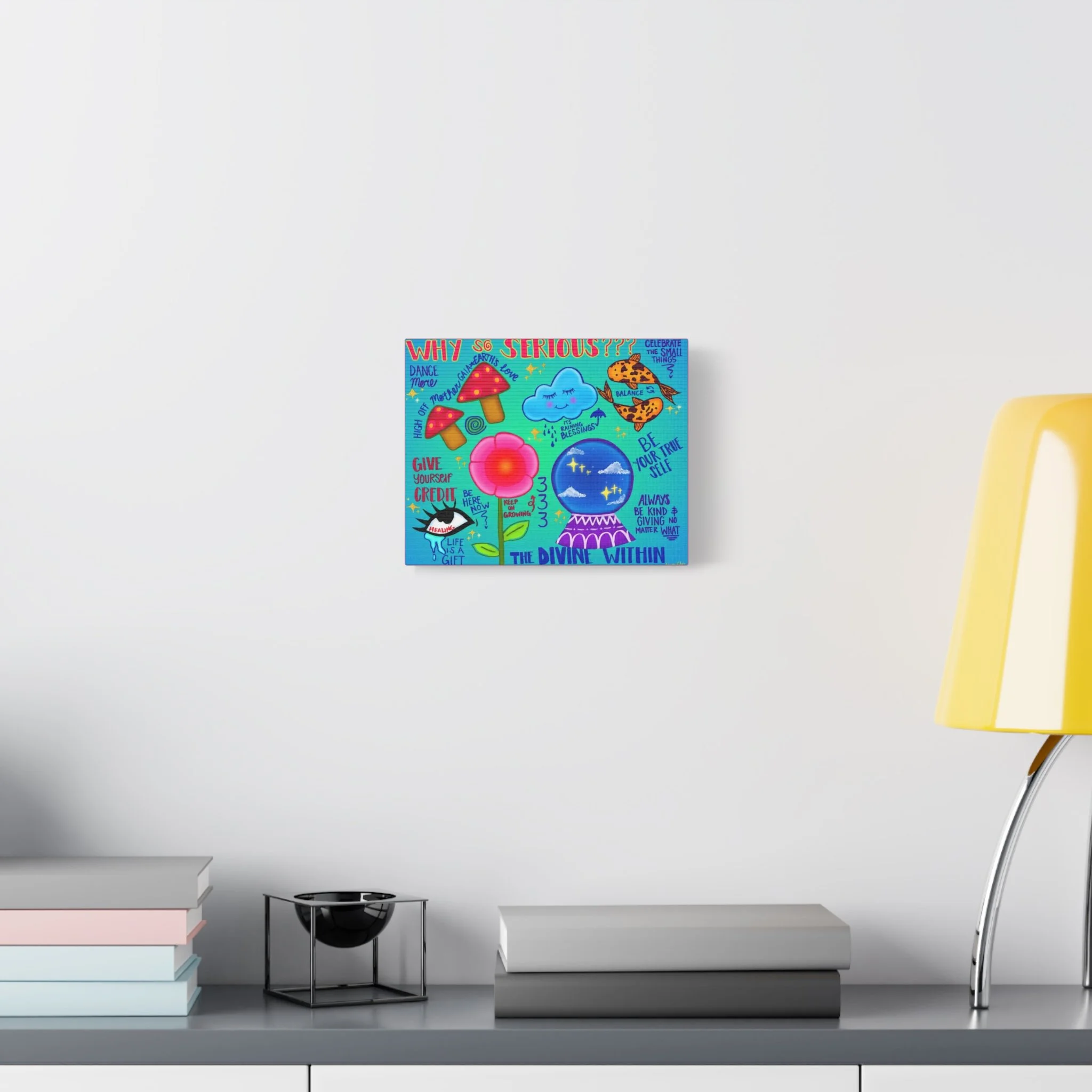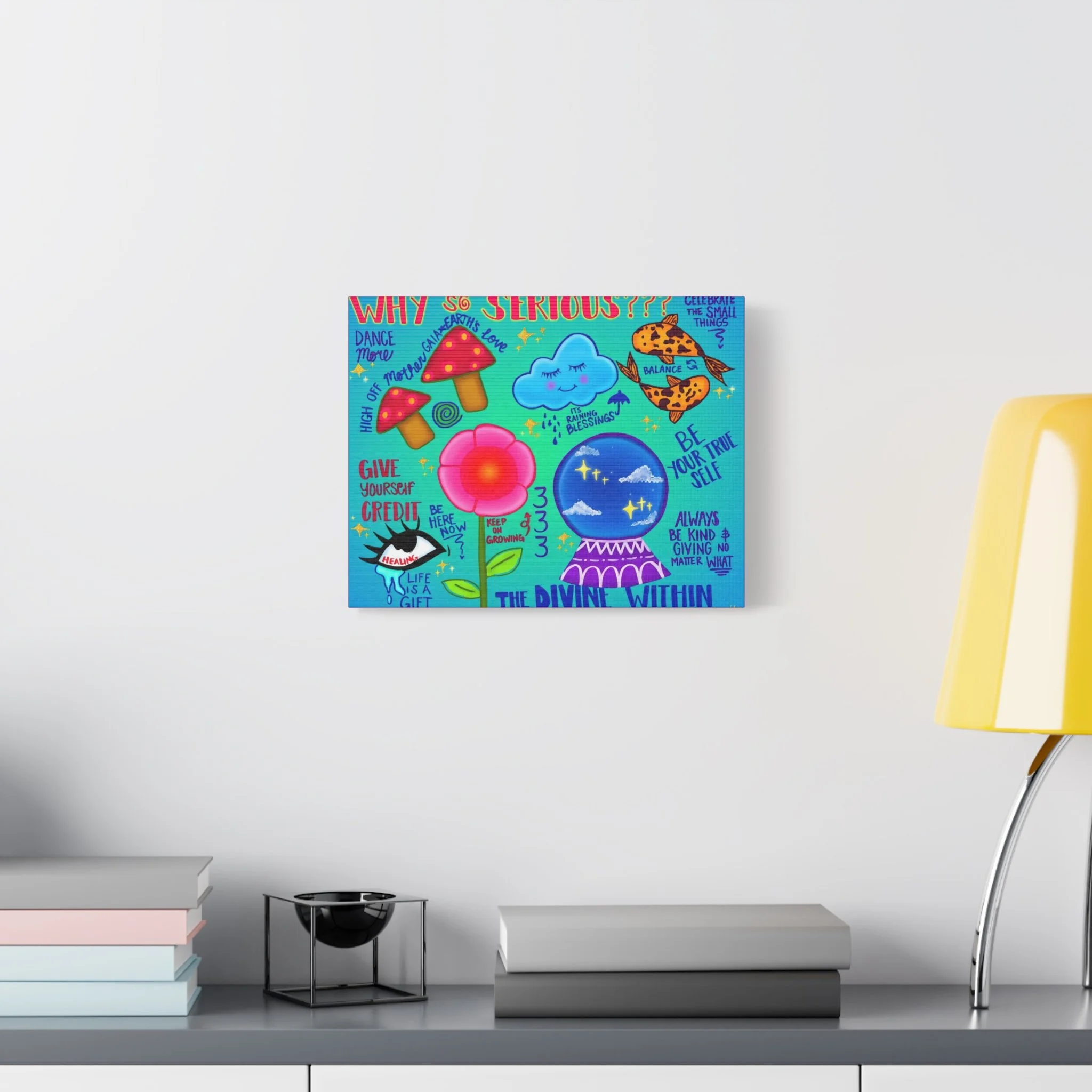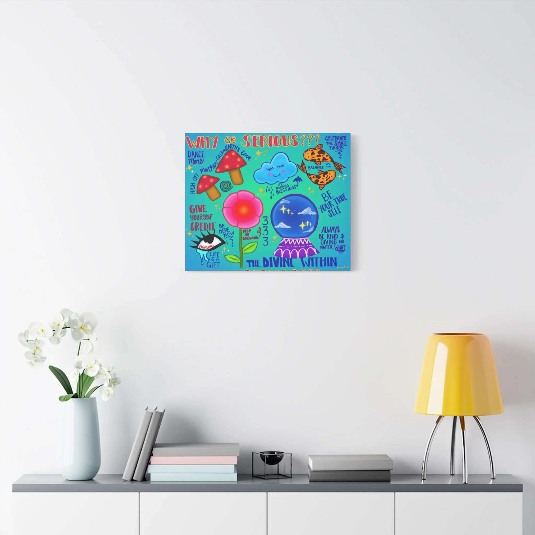 Hand-stretched over a 1.25" pine frame, this matte canvas features joyful doodles — mushrooms, smiling cloud, crystal ball, and encouraging hand-lettered phrases — that read like a pocket-sized manifesto for gentler living.