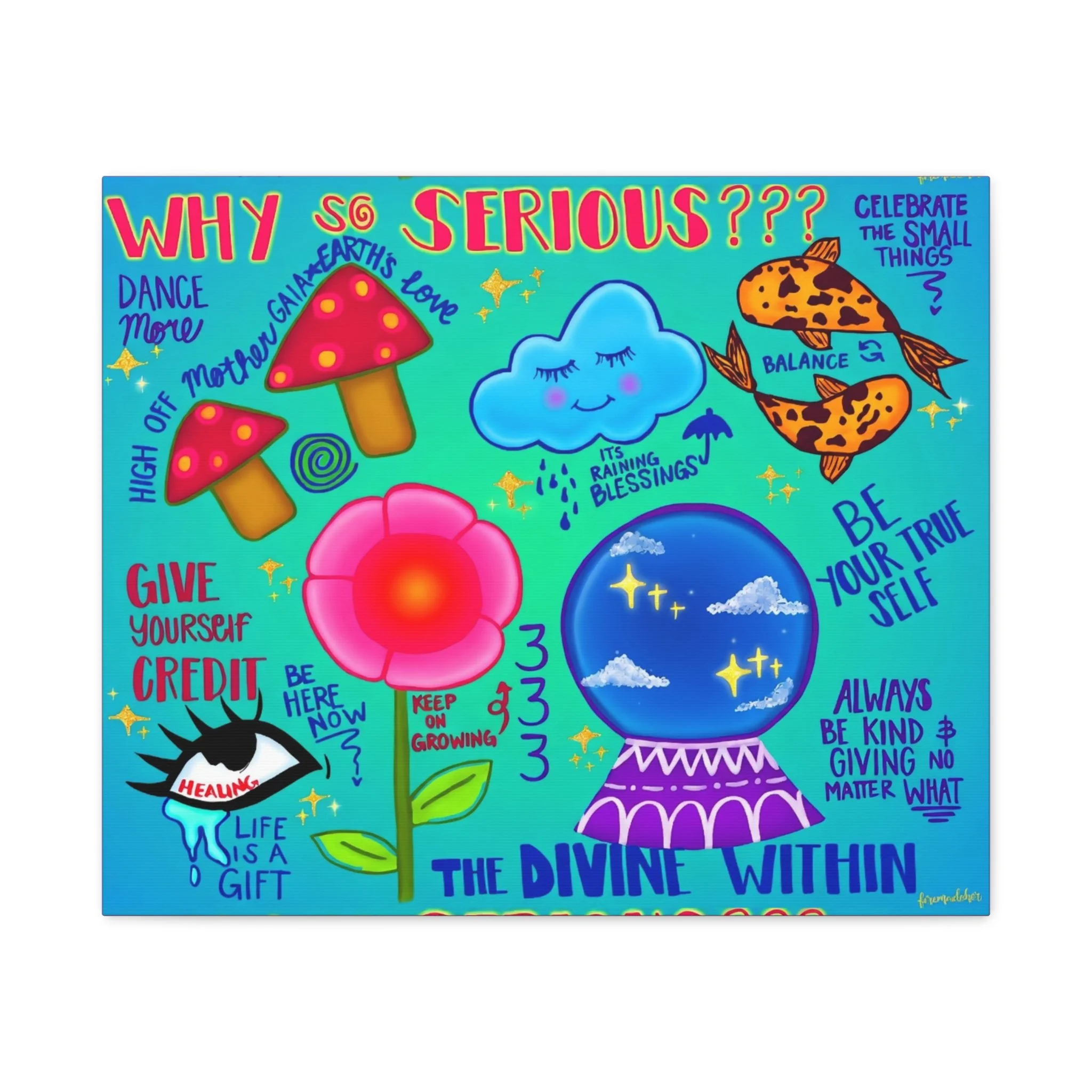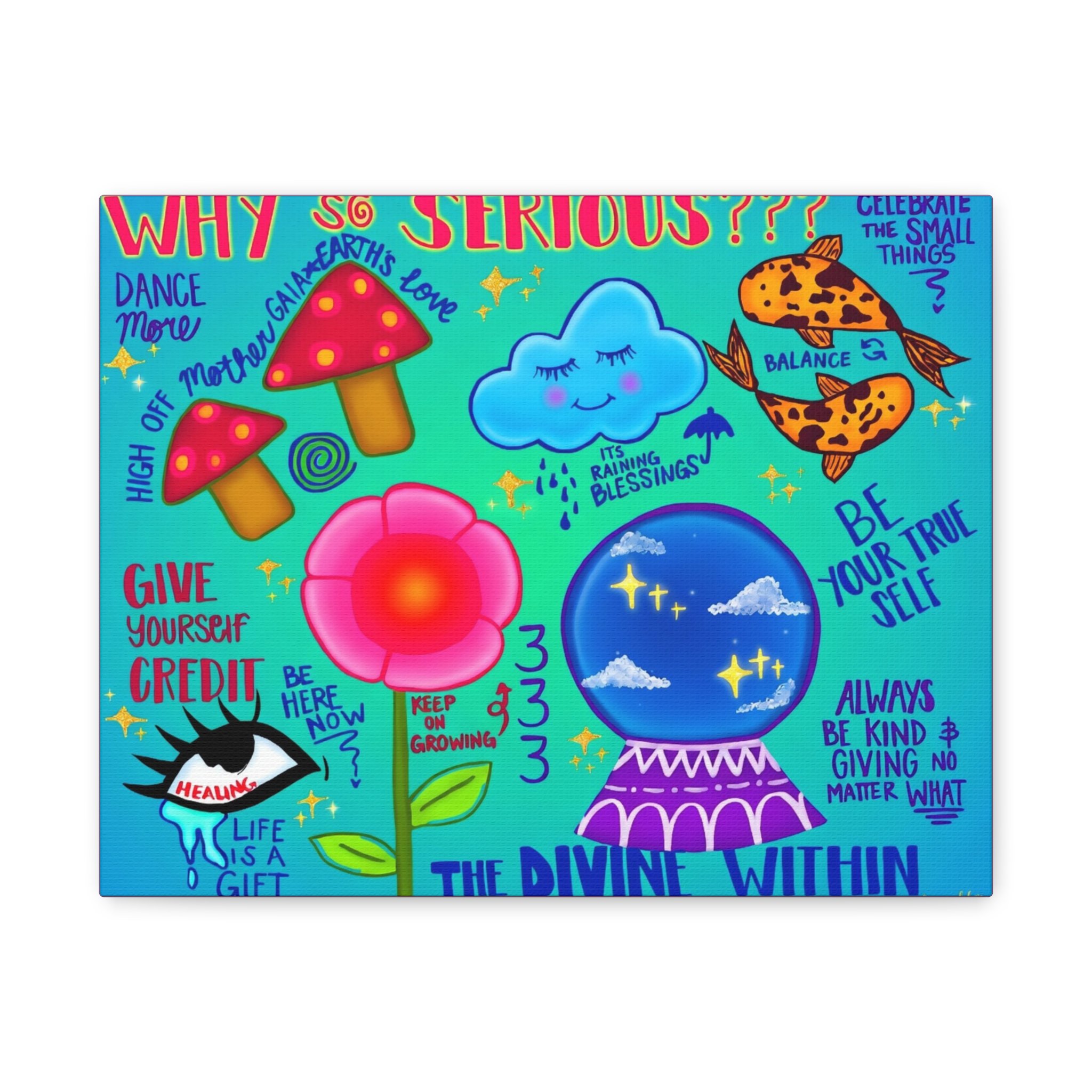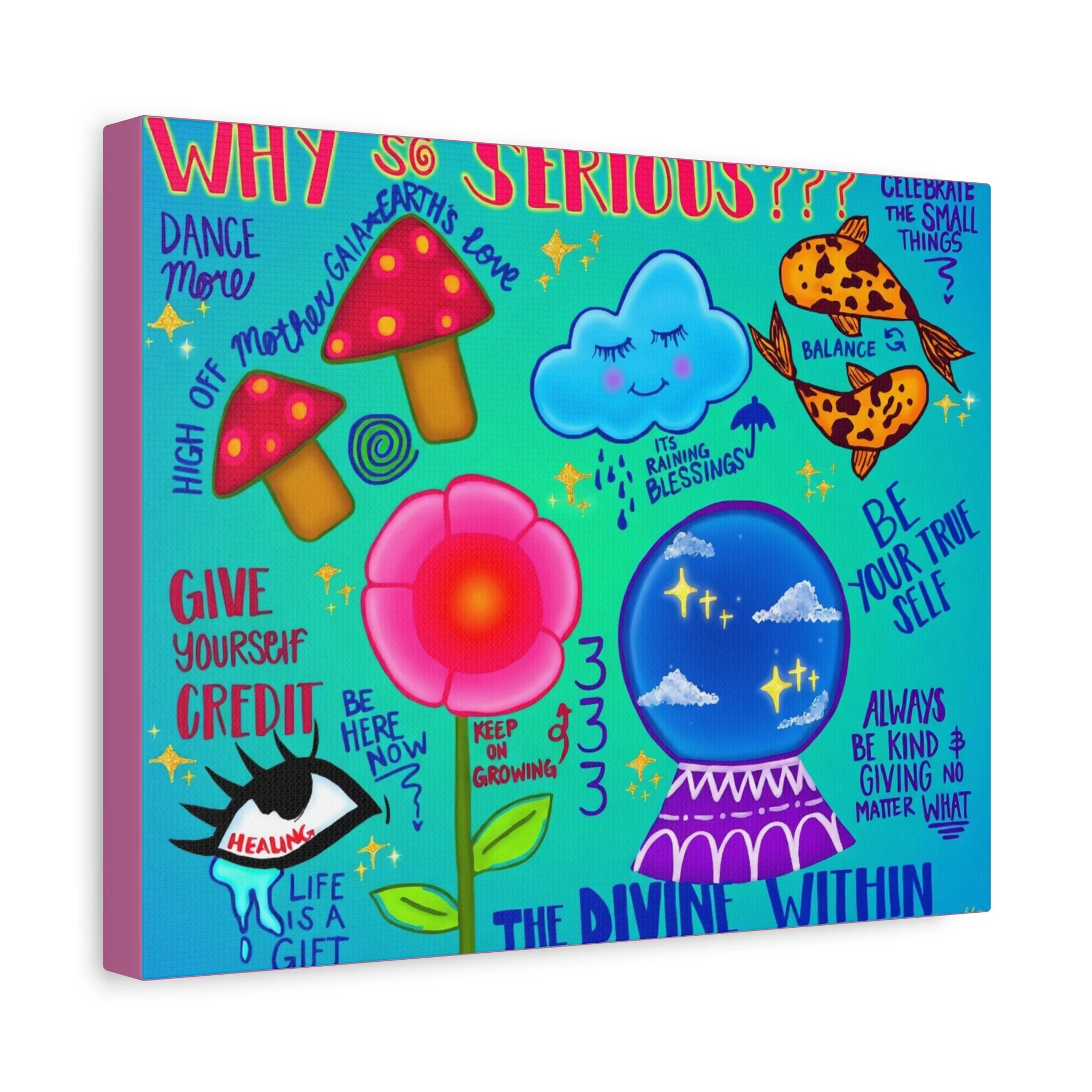 Hand-stretched over a 1.25" pine frame, this matte canvas features joyful doodles — mushrooms, smiling cloud, crystal ball, and encouraging hand-lettered phrases — that read like a pocket-sized manifesto for gentler living.