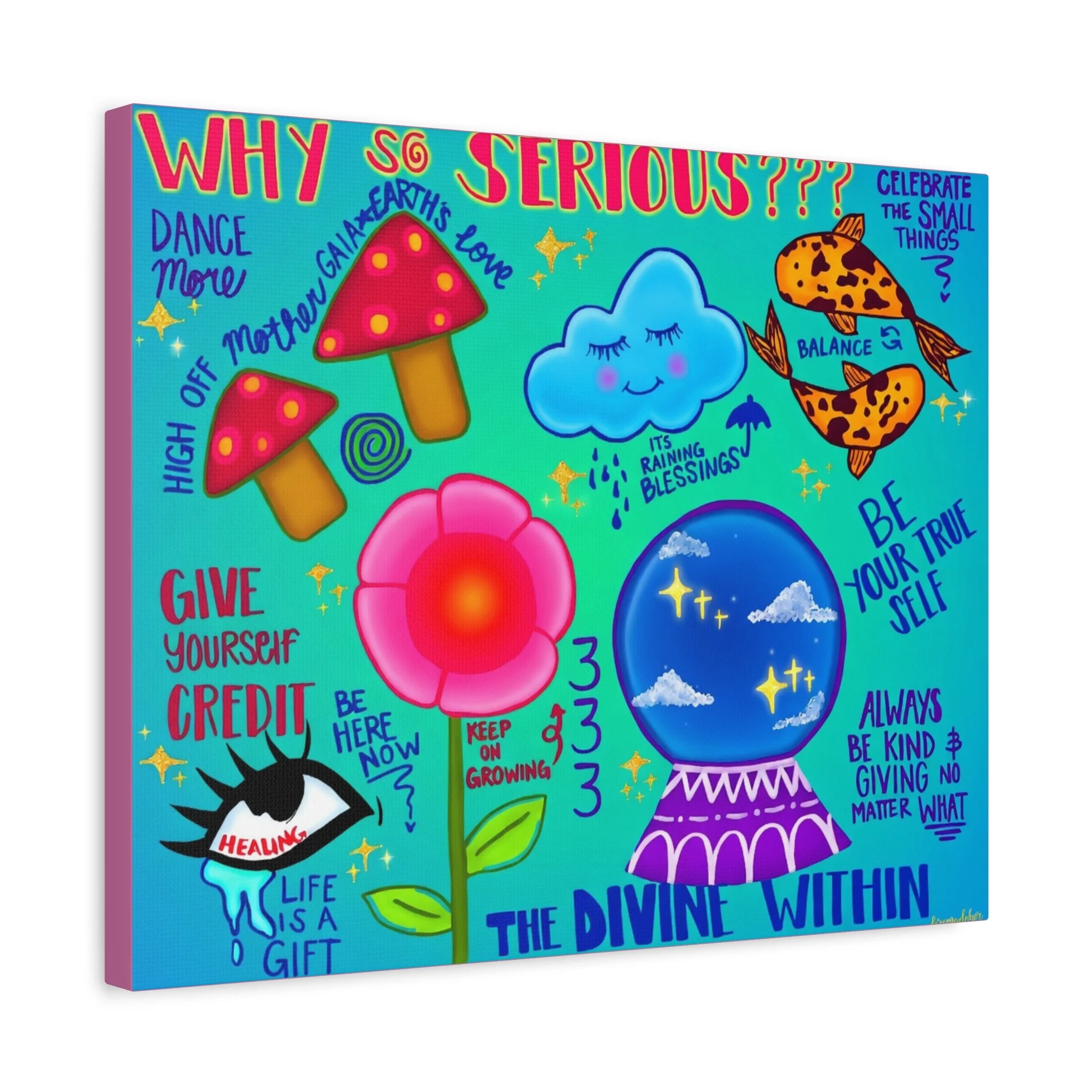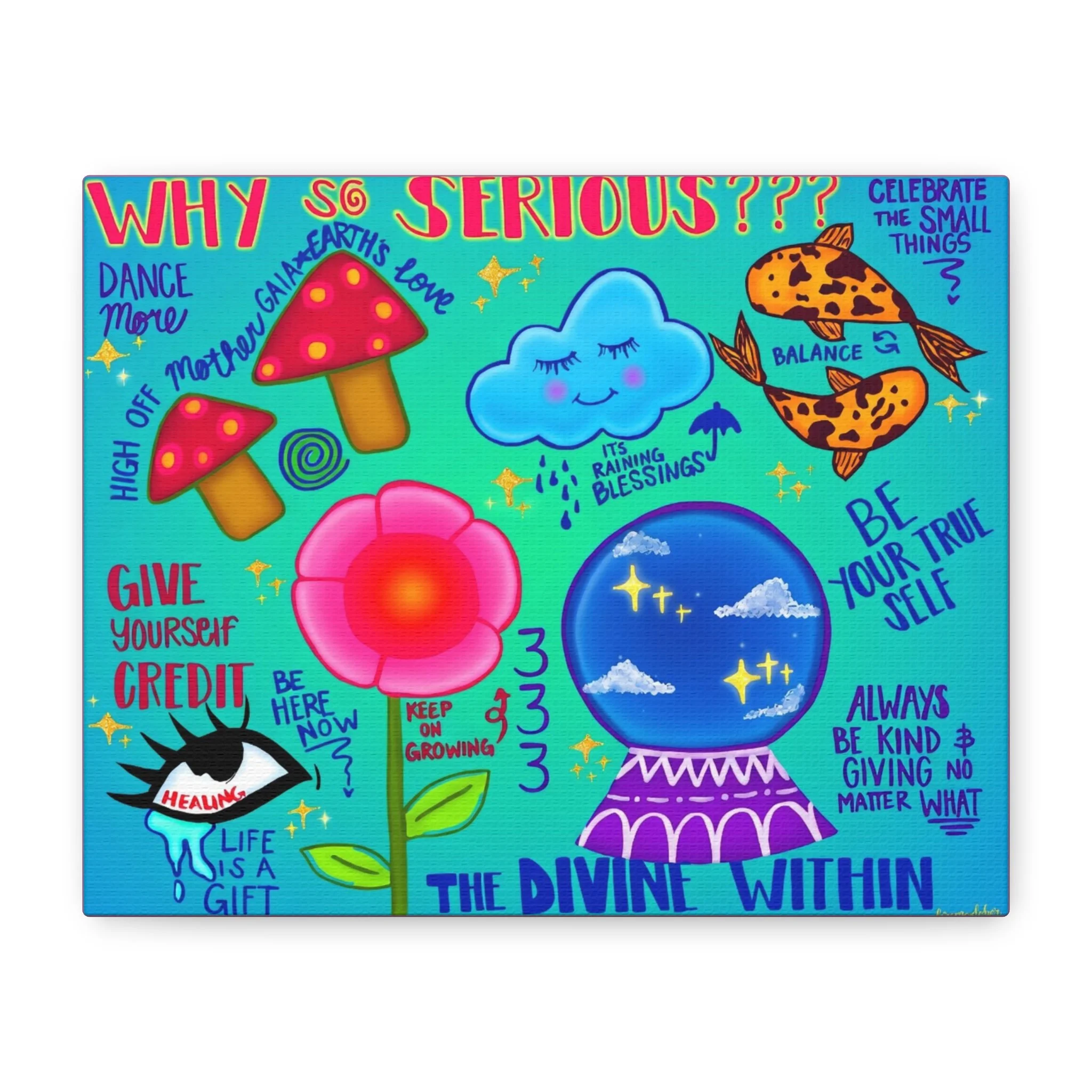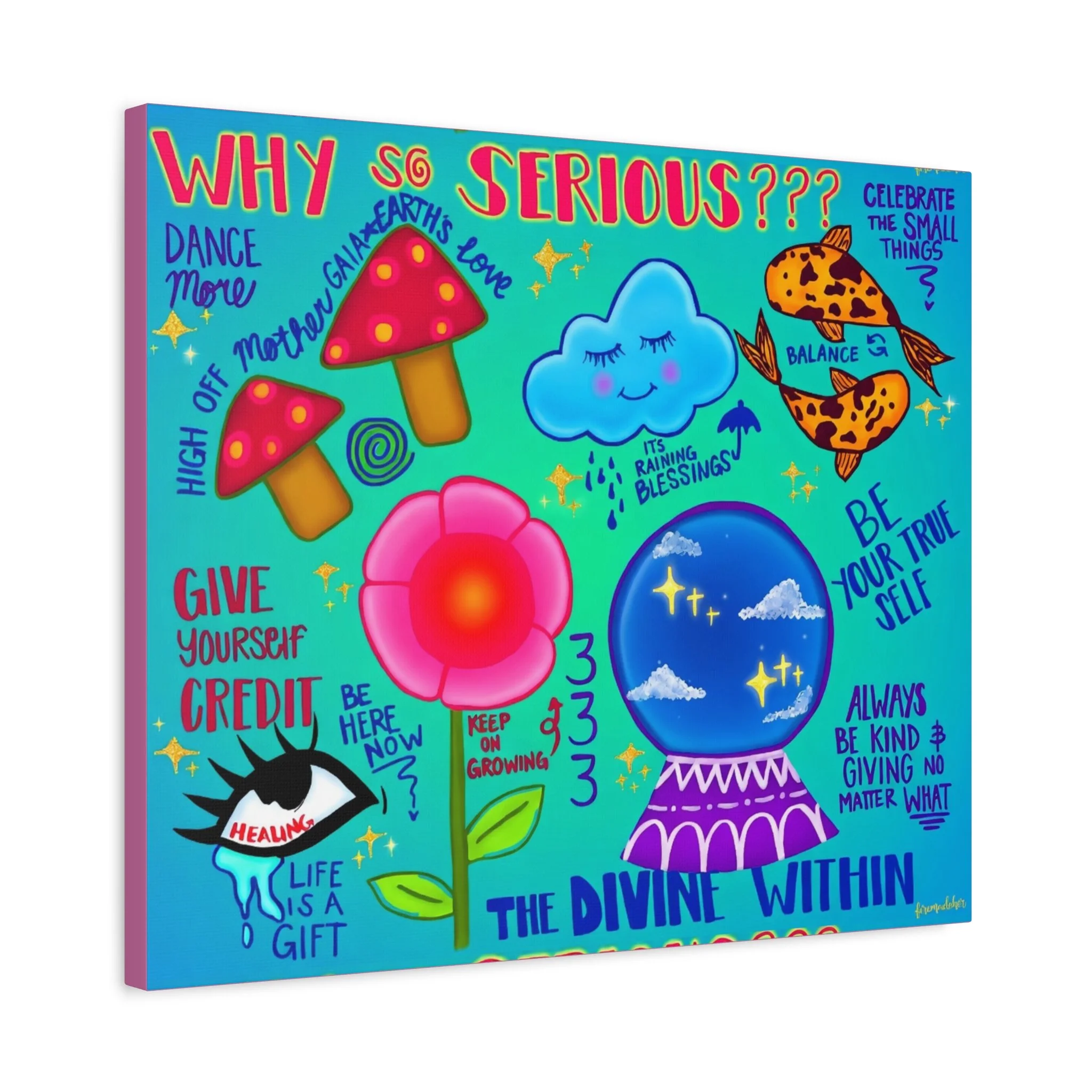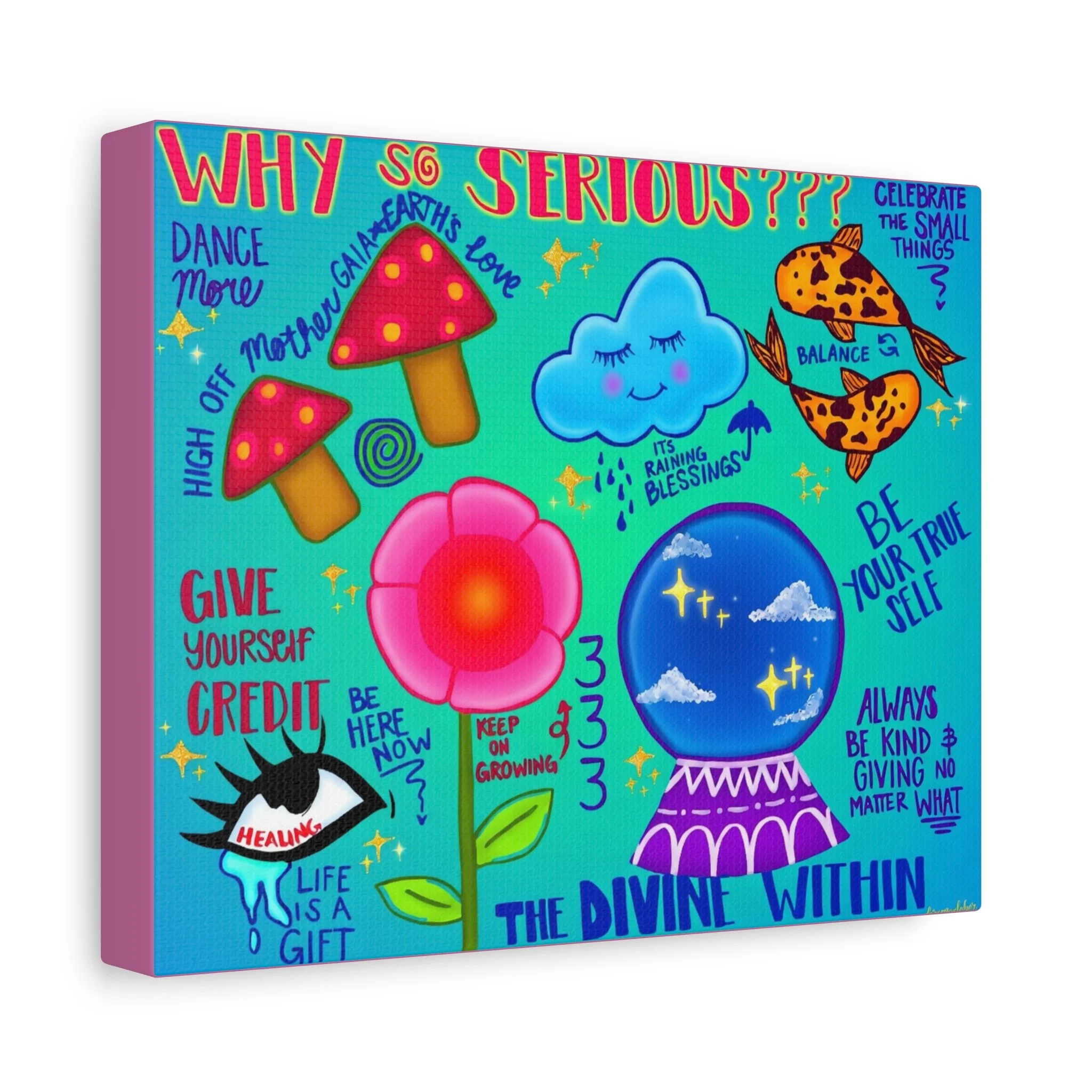 Hand-stretched over a 1.25" pine frame, this matte canvas features joyful doodles — mushrooms, smiling cloud, crystal ball, and encouraging hand-lettered phrases — that read like a pocket-sized manifesto for gentler living.